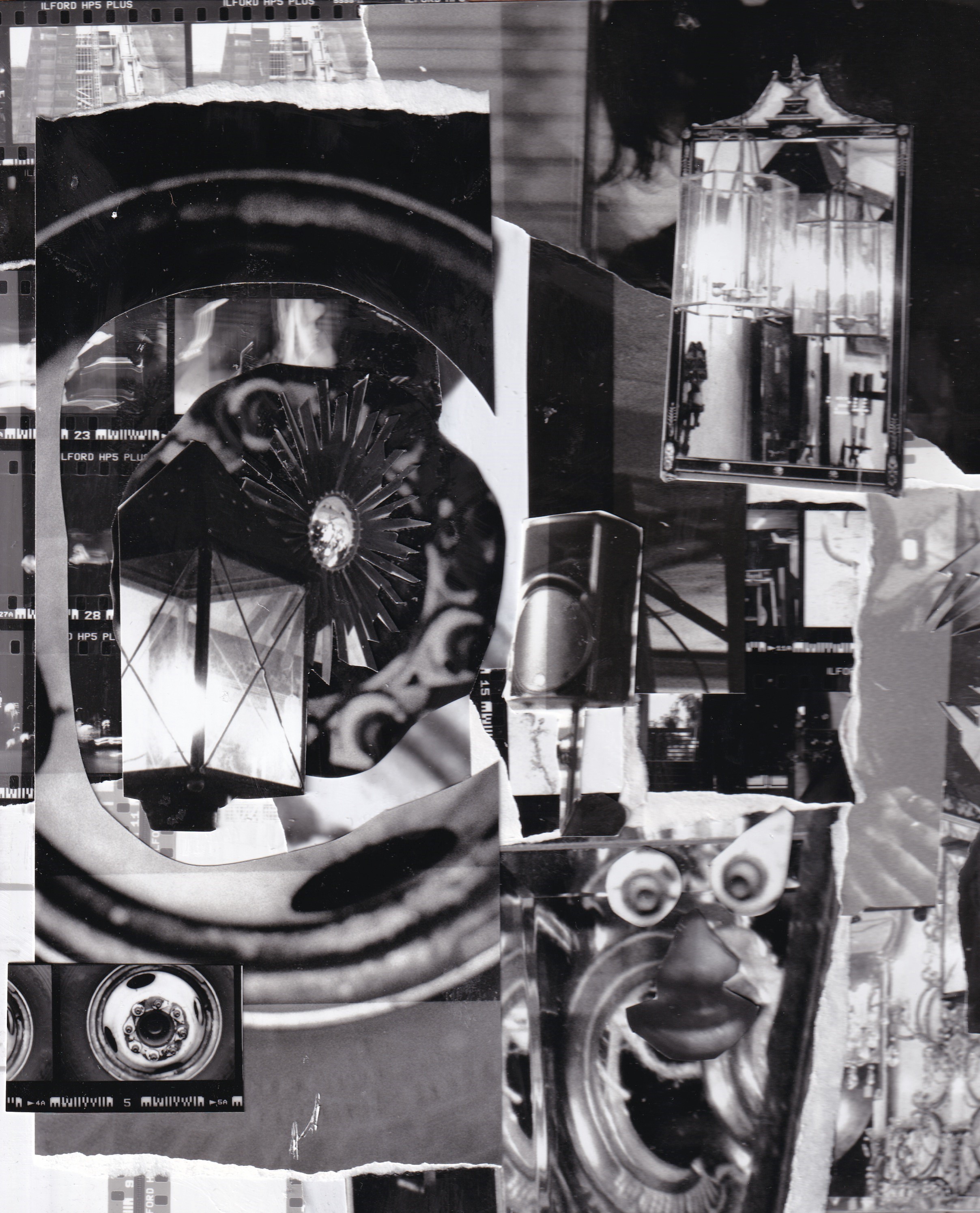 "Photojunk I" 2024 Collaged black and white photo test strips on panel 9 x 9.5 in