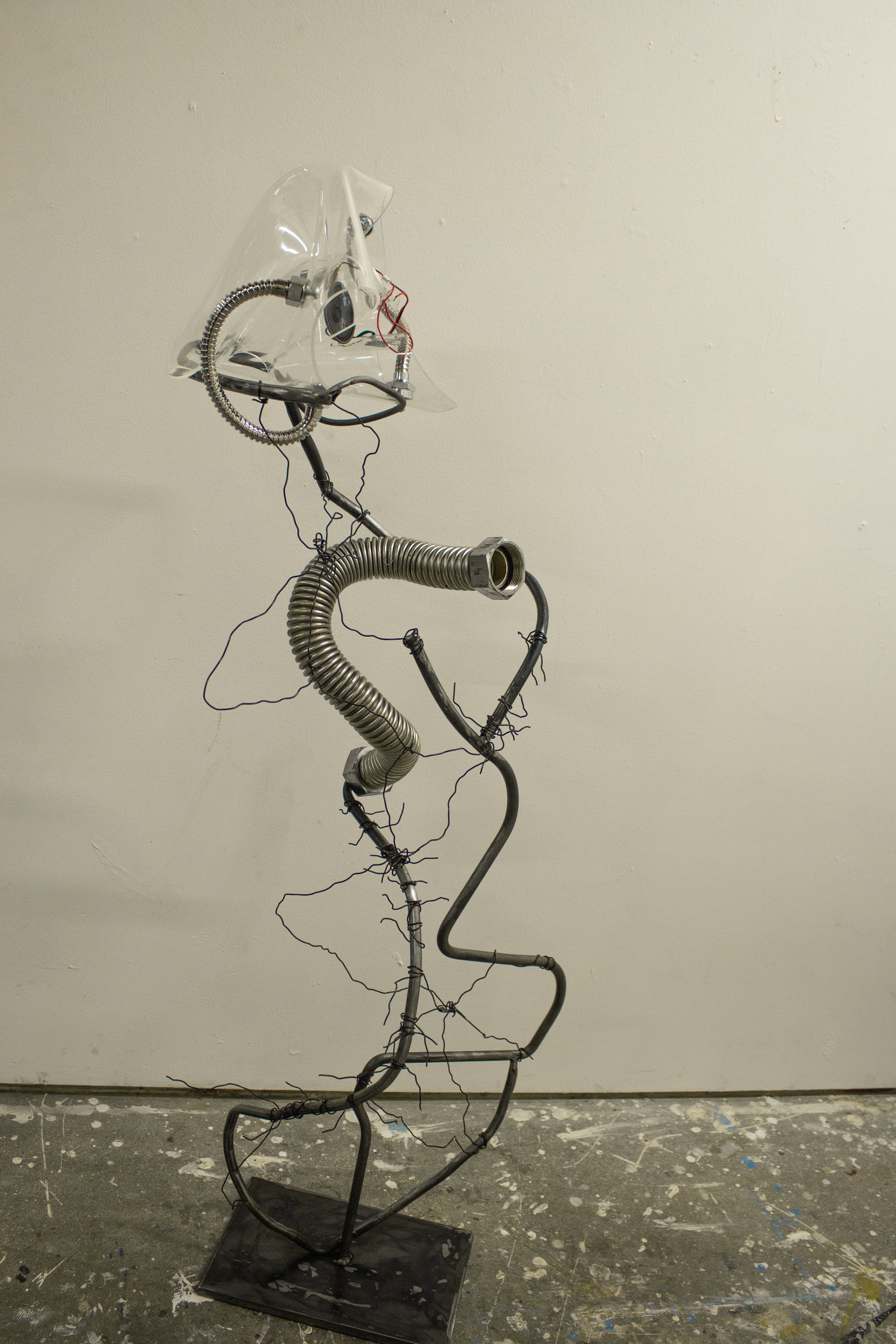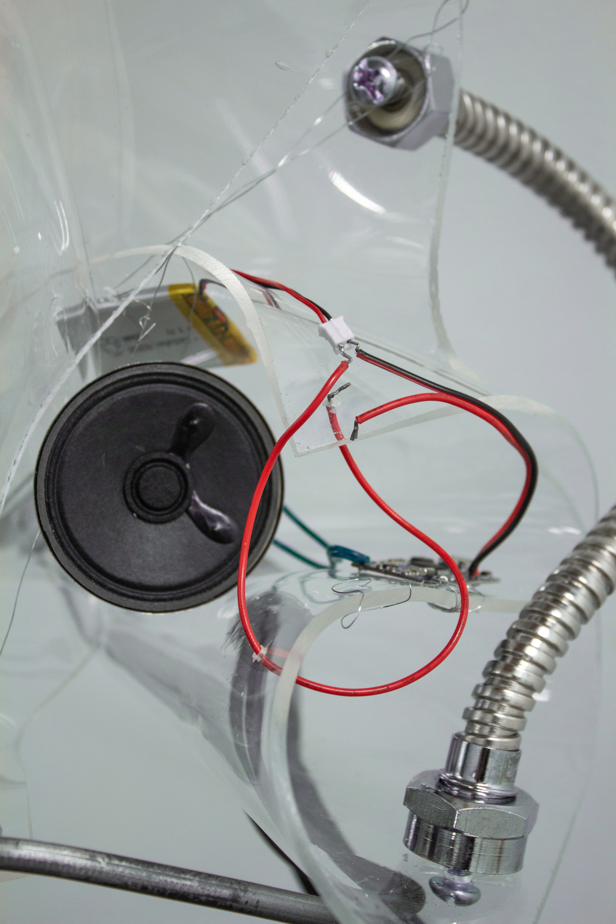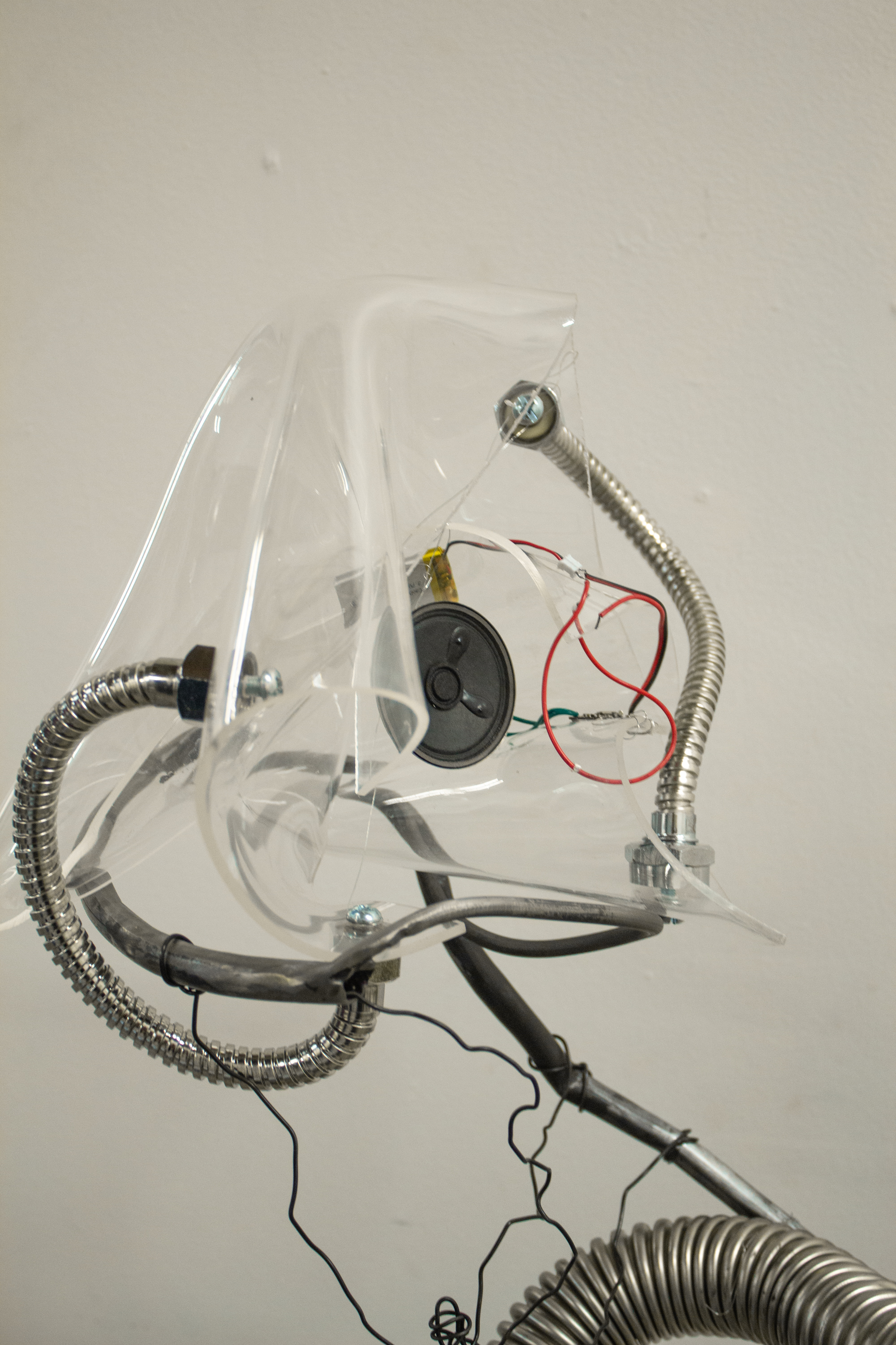 "Receiver", 2024 Acrylic, speaker module, scrap metal, steel wire, screws, metal hardware 40 x 10 x 12 in Constant sound playback
