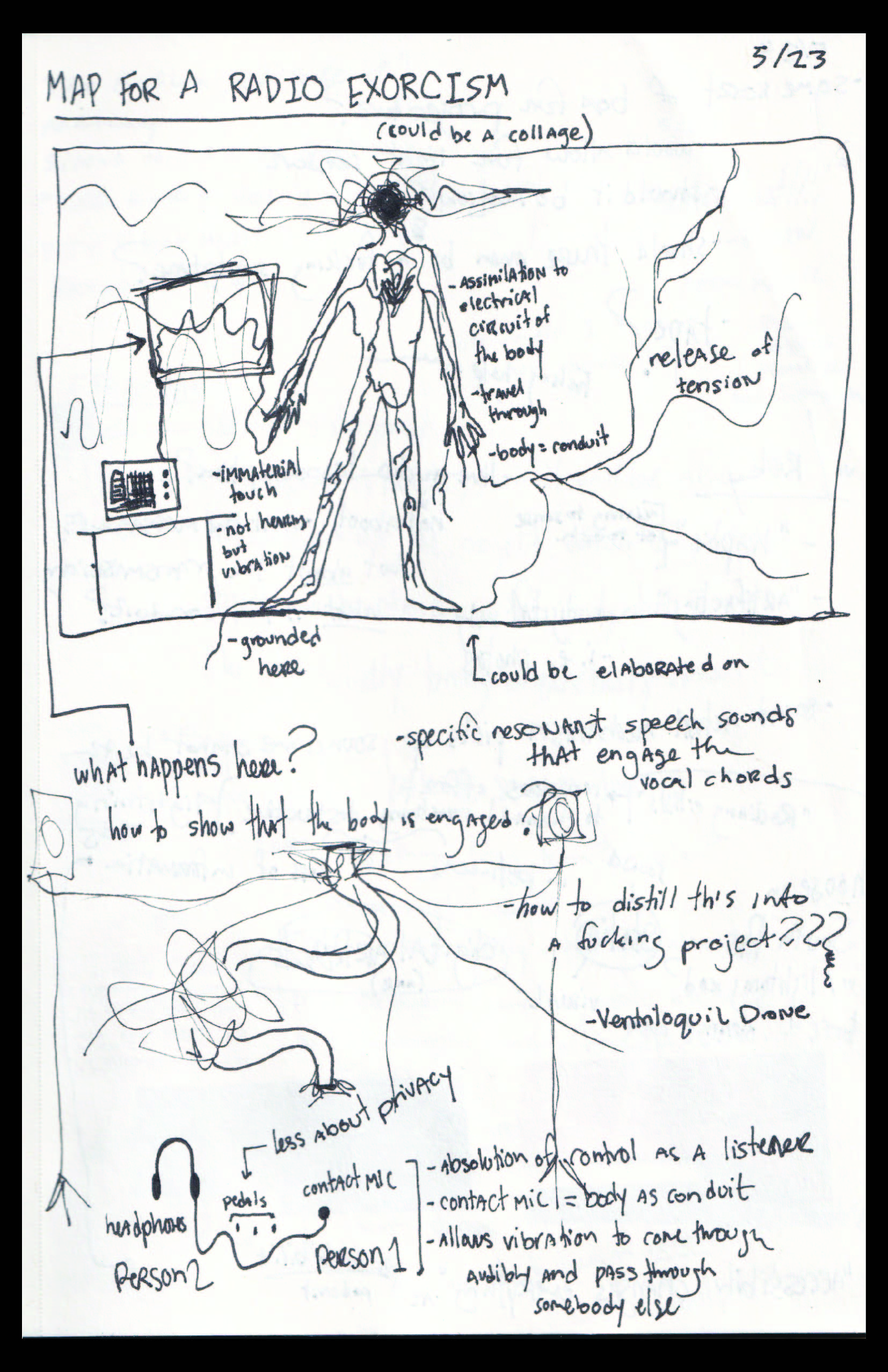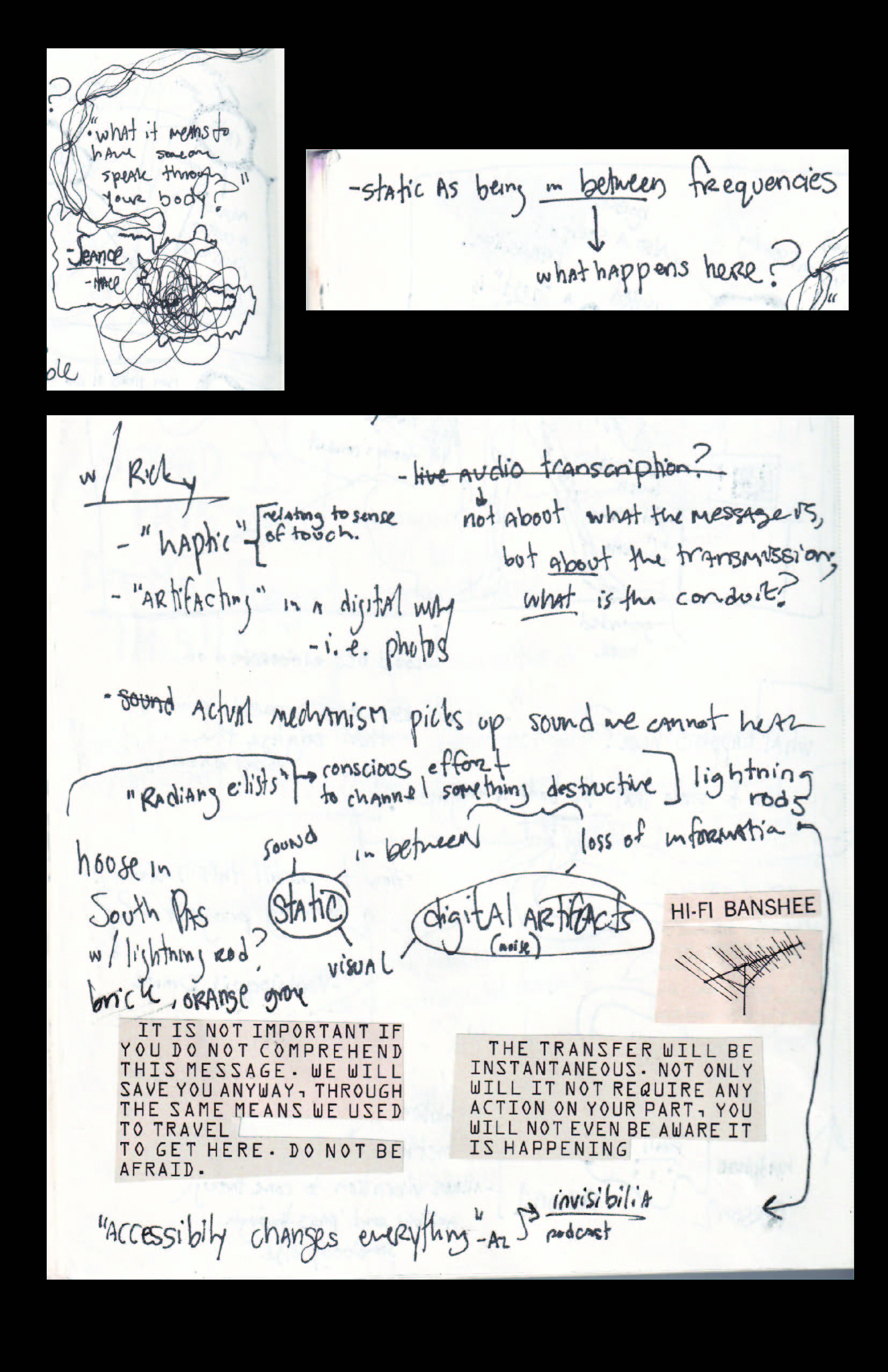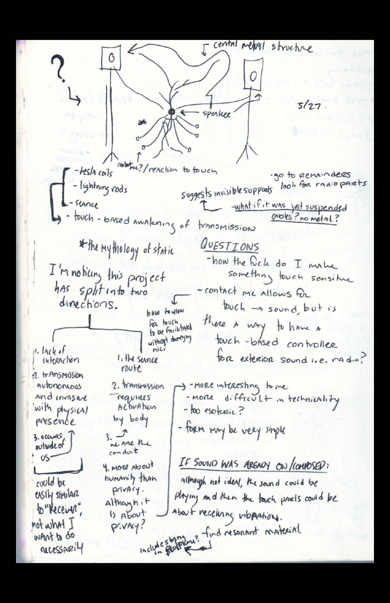 A printed 16-page booklet of notes, sketches, and writing documenting an in-progress sound and sculpture installation.