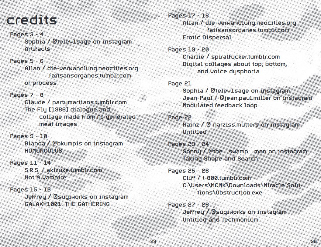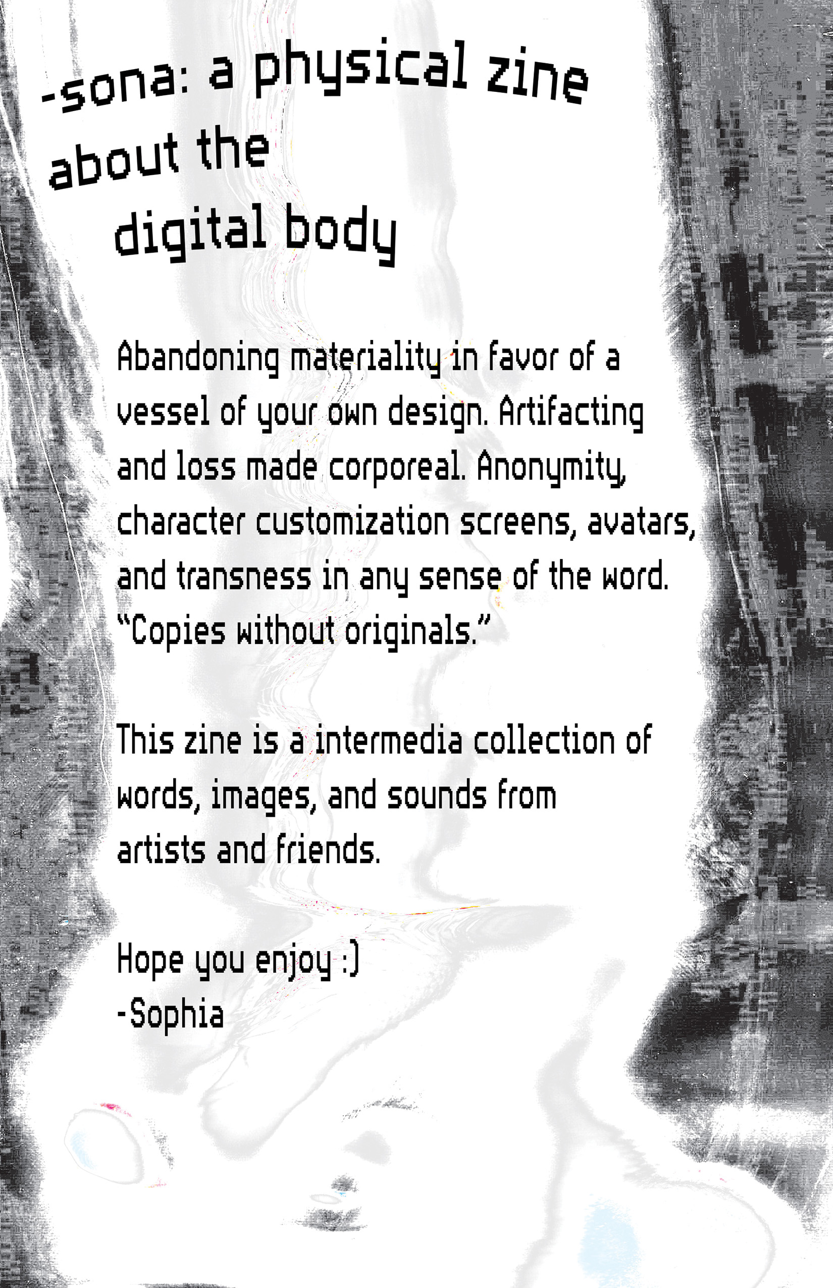 -SONA: a physical zine about the digital body Is a COLLABORATIVE multimedia zine curated and organized by Sophia Kaeser. It investigates how the limitlessness of cyberspace allows for endless physical change and extension to one's physical being. 15 copies were printed as folded 8.5 x 11 booklets. 32 pages.