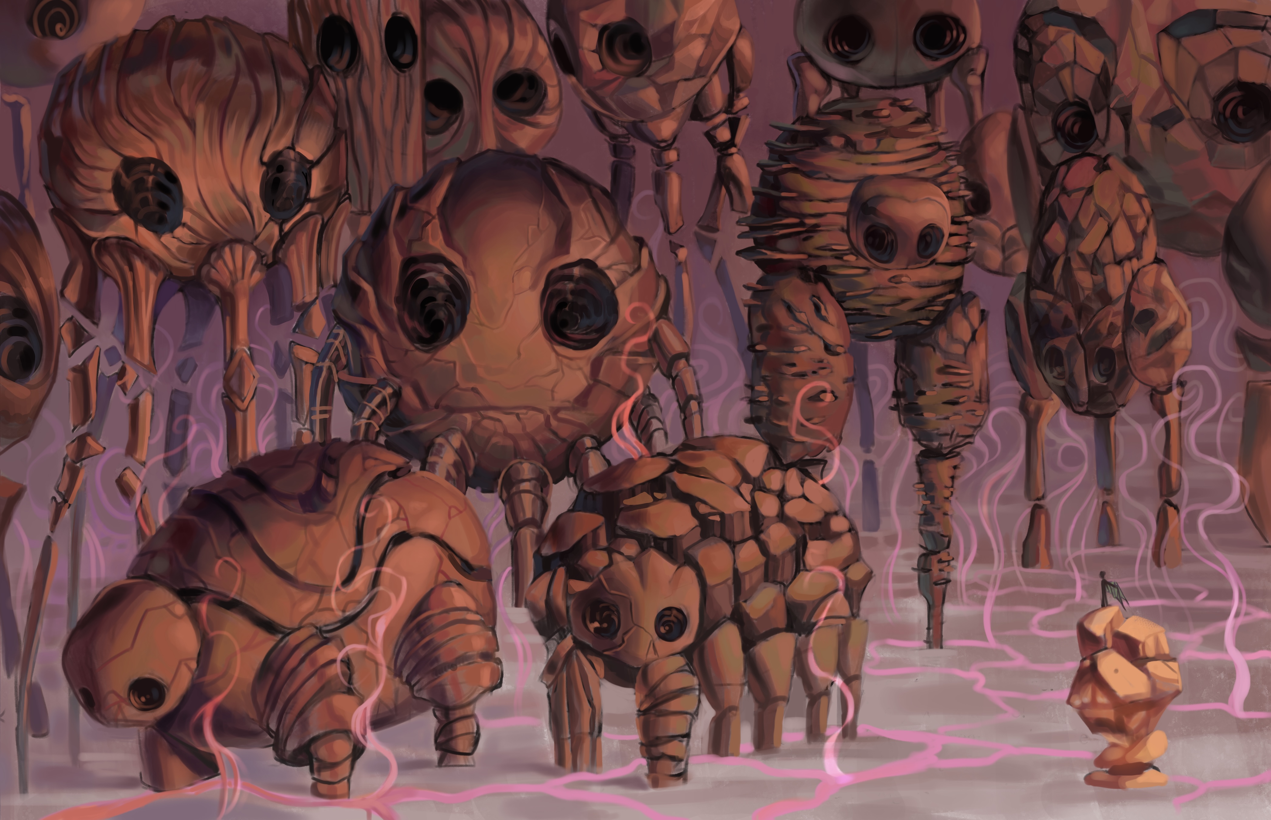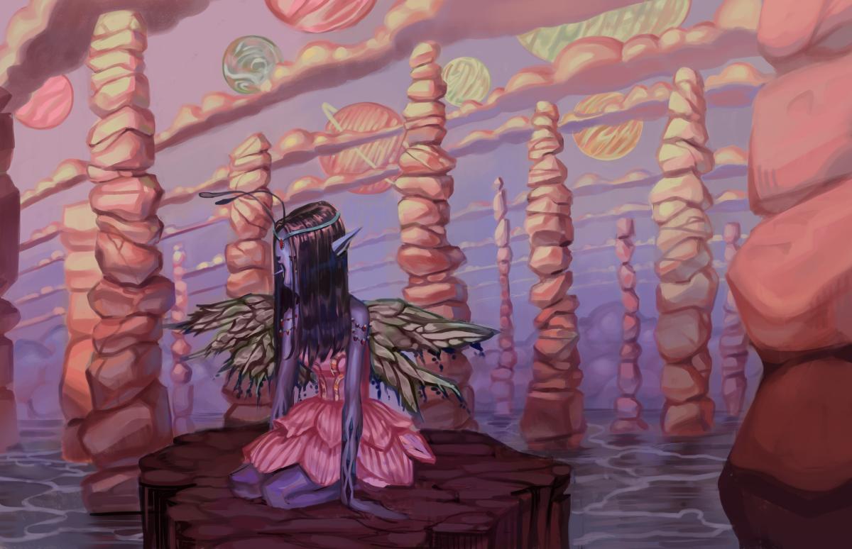 First thumbnails were made, then I made lineart, chose a color palette for a more cohesive look and rendered the paintings.