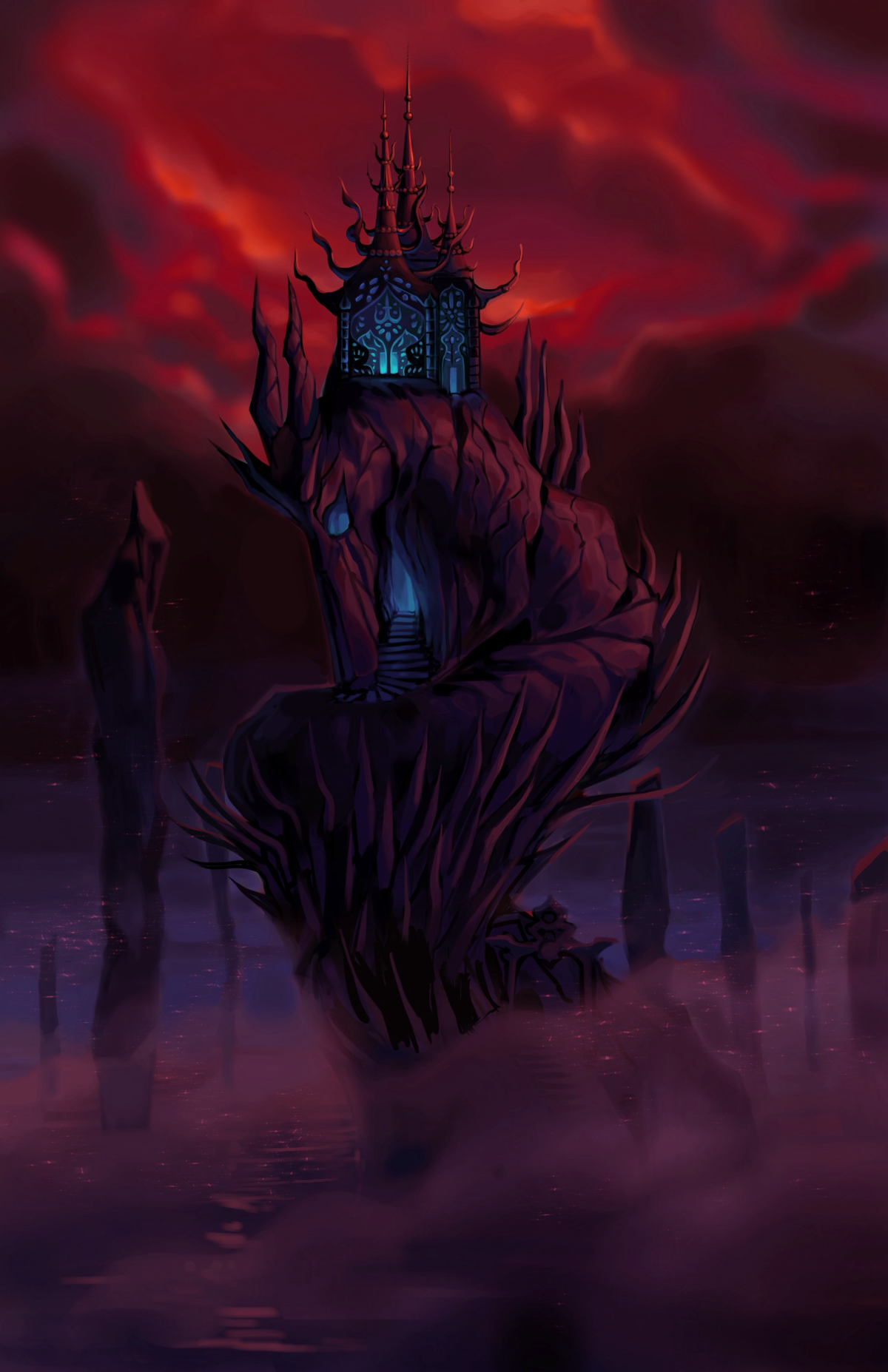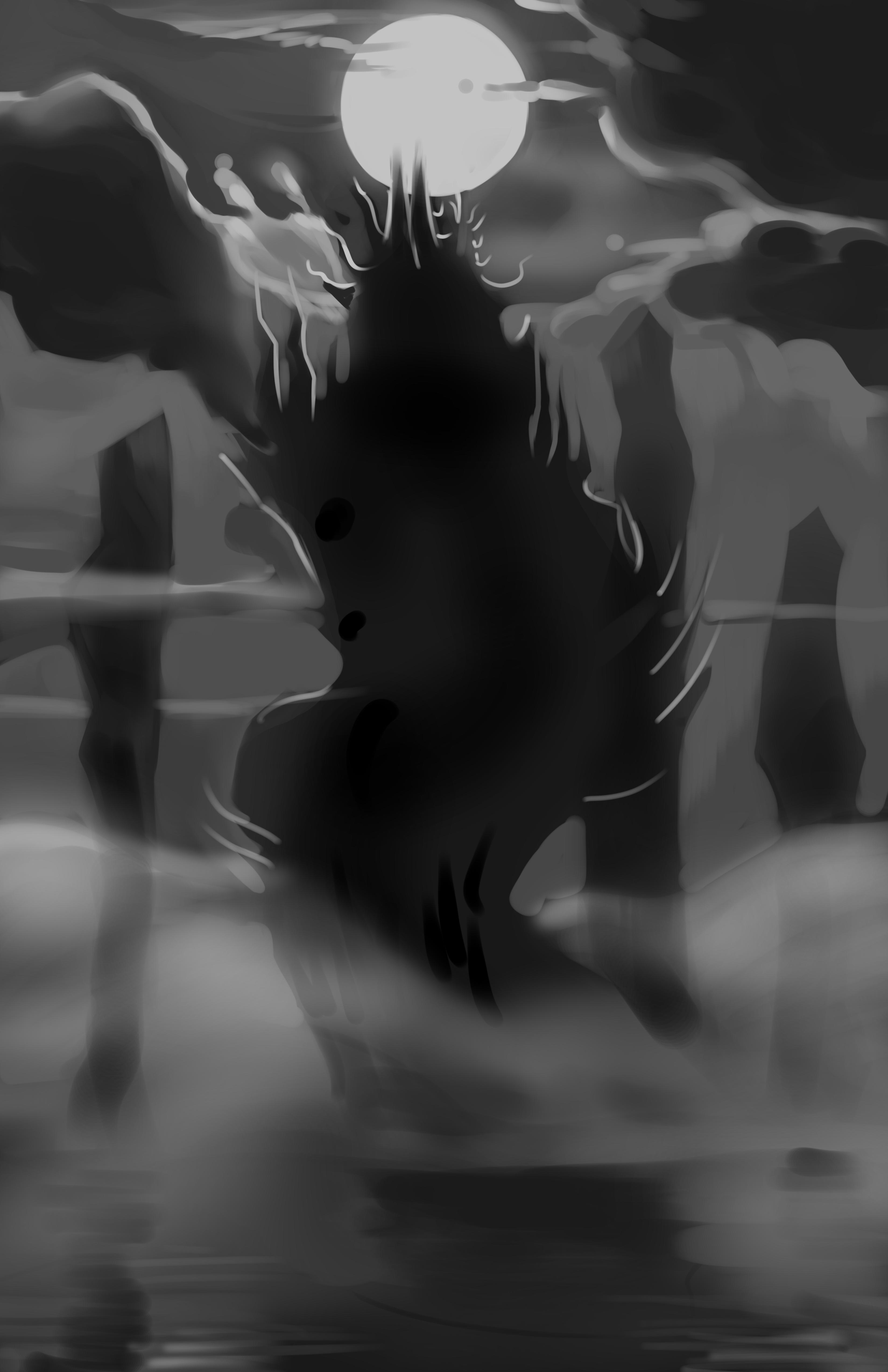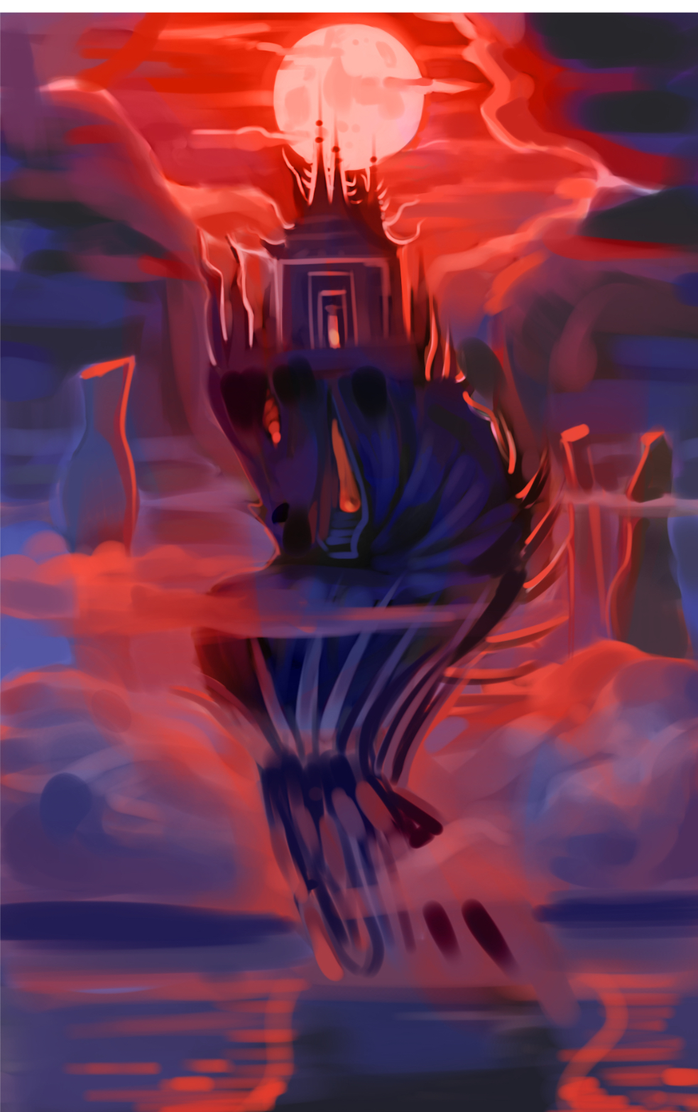 A island shaped like a dragon that is in a lake with the moon overhead in the dark of night.