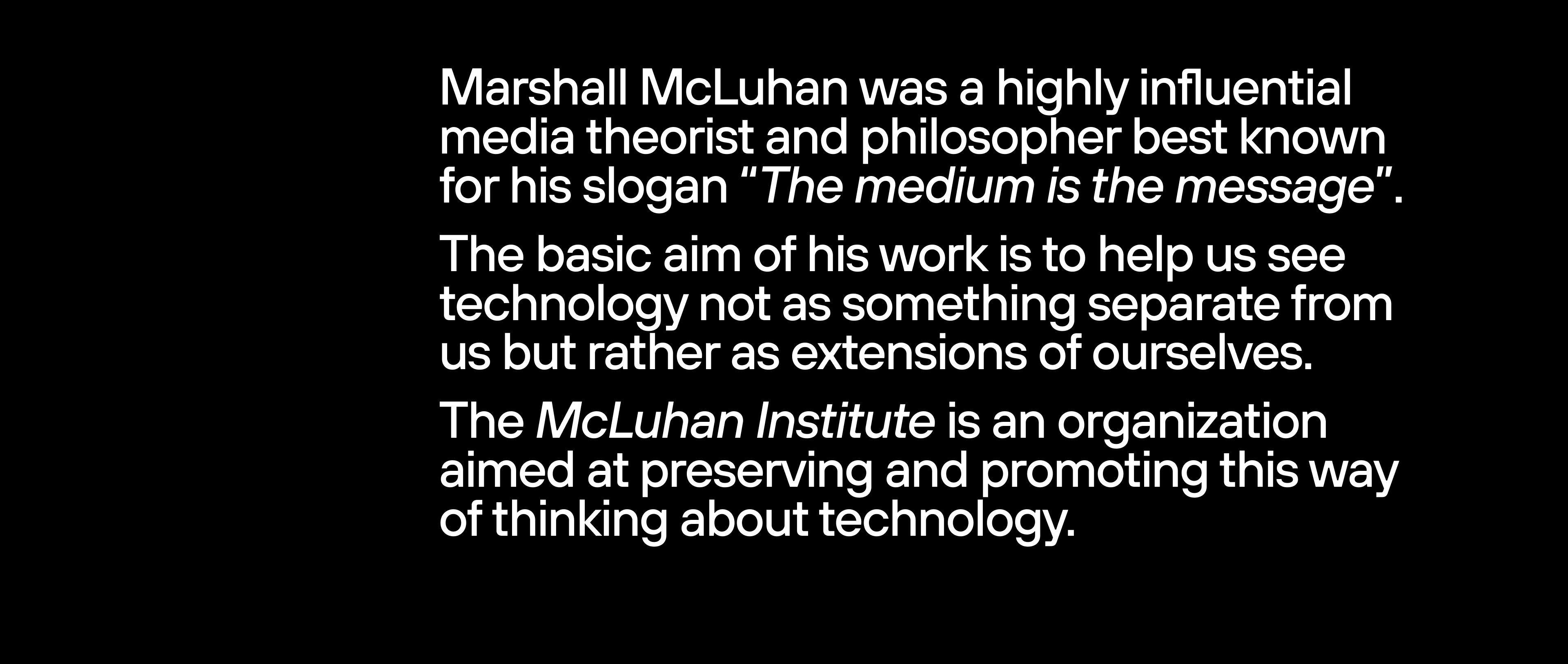 Marshall McLuhan was a highly influential media theorist and philosopher best known for his slogan “The medium is the message”. The basic aim of his work is to help us see technology not as something separate from us but rather as extensions of ourselves. The McLuhan Institute is an organization aimed at preserving and promoting this way of thinking about technology.