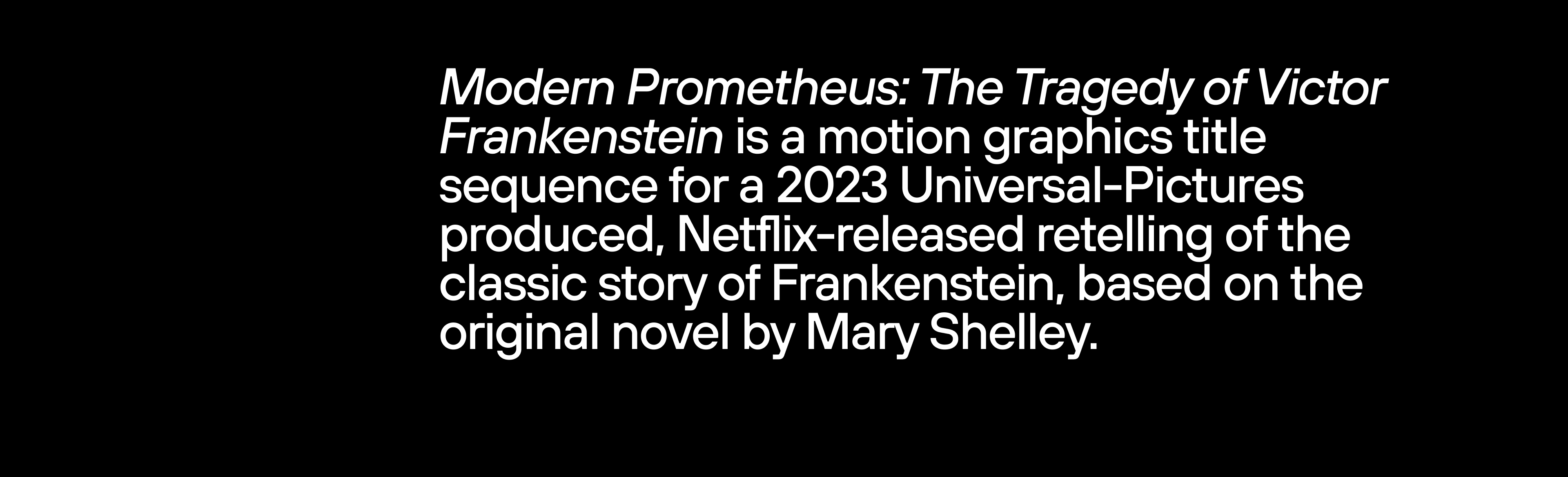 Modern Prometheus: The Tragedy of Victor Frankenstein is a motion graphics title sequence for a 2023 Universal-Pictures produced, Netflix-released retelling of the classic story of Frankenstein, based on the original novel by Mary Shelley.