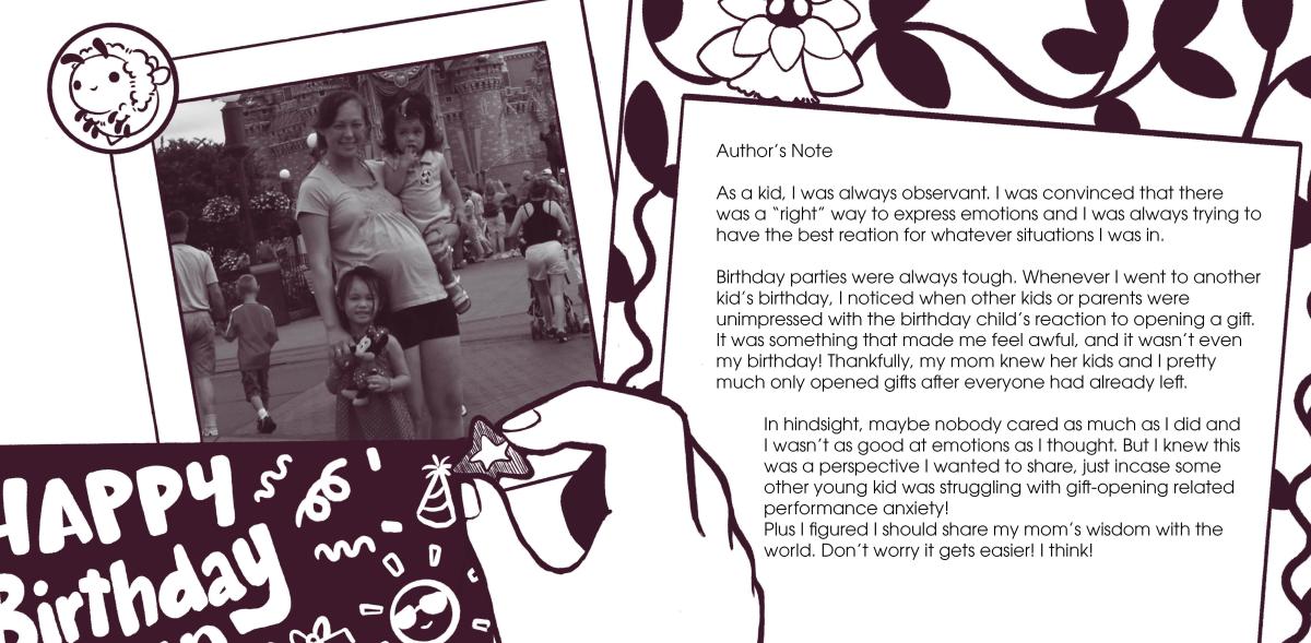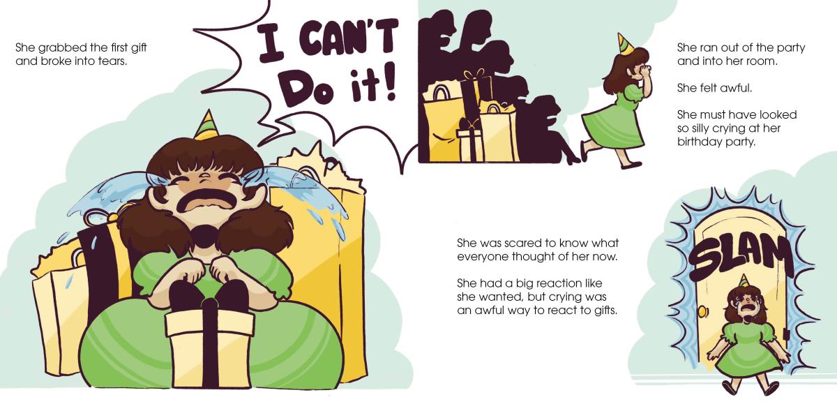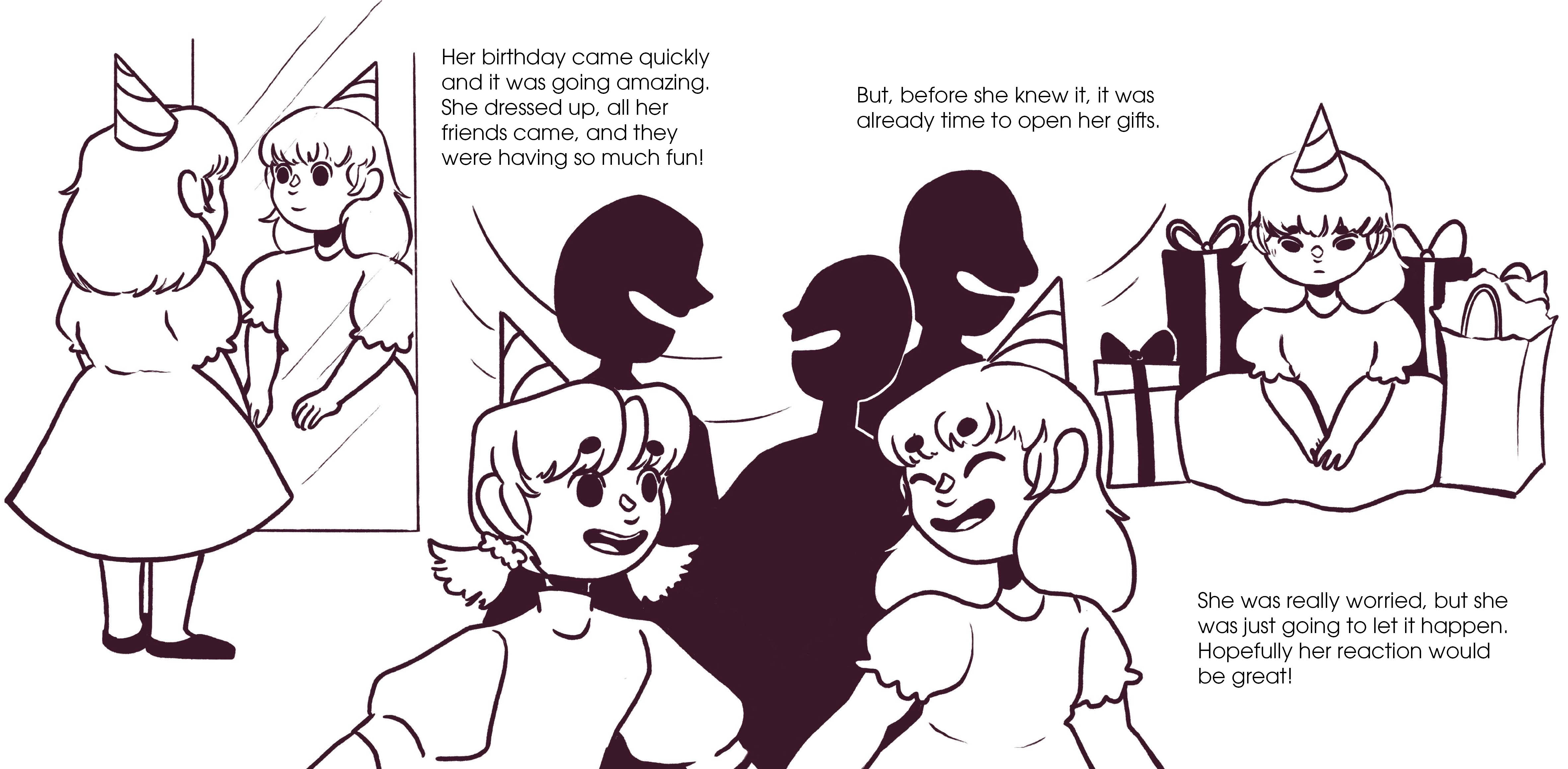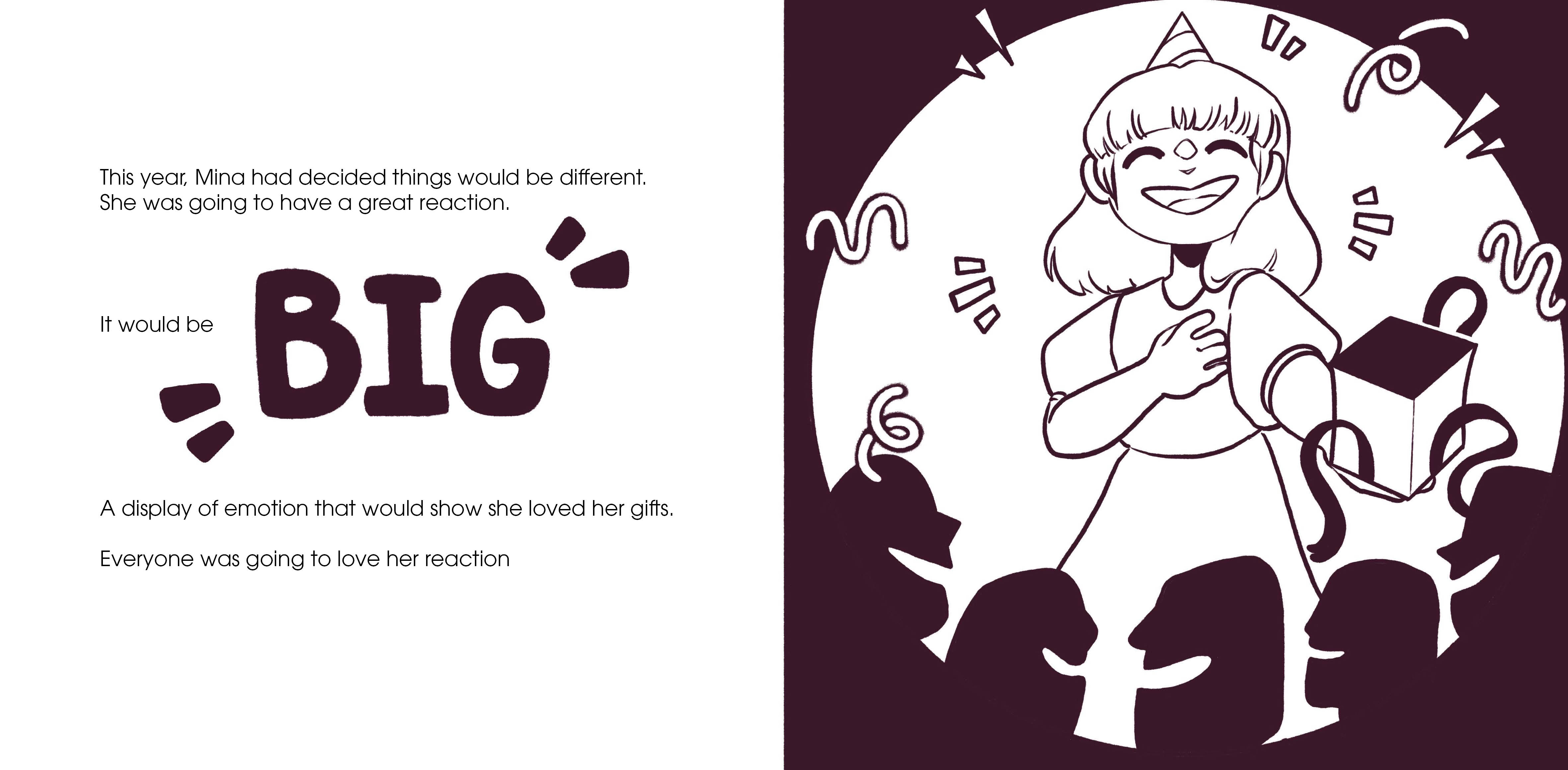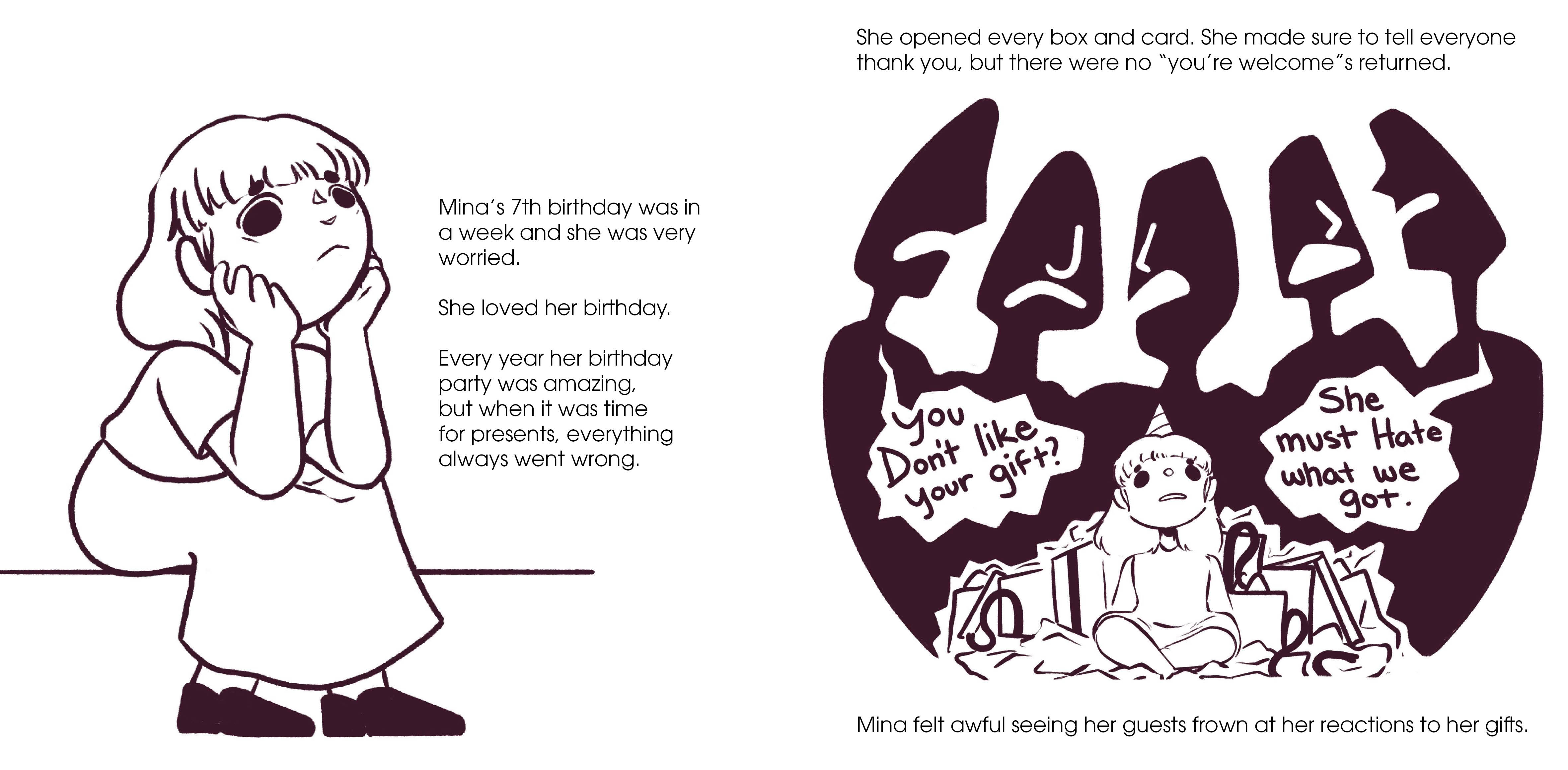 A children's book concept written and illustrated by myself. The story follows a young girl who's anxious about opening gifts at her birthday and having a "great" reaction.