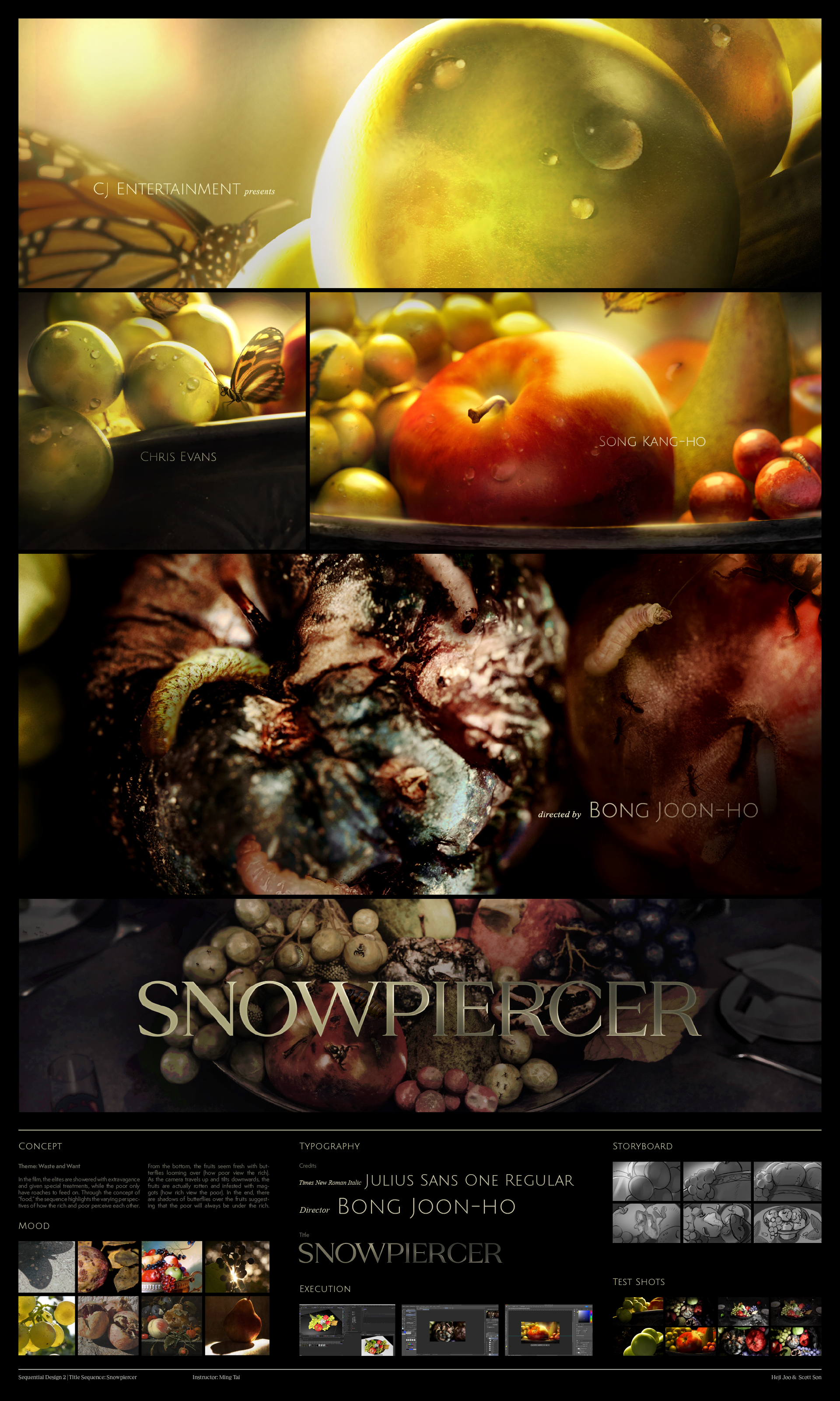 In the film, the elites are showered with extravagance and given special treatments, while the poor only have roaches to feed on. Through concept of "food," the sequence highlights the varying perspectives of how the rich and poor perceive each other. The 3D rendered fruit is shocased in different perspectives and finally reveals the rotten part only on the top view perspective.