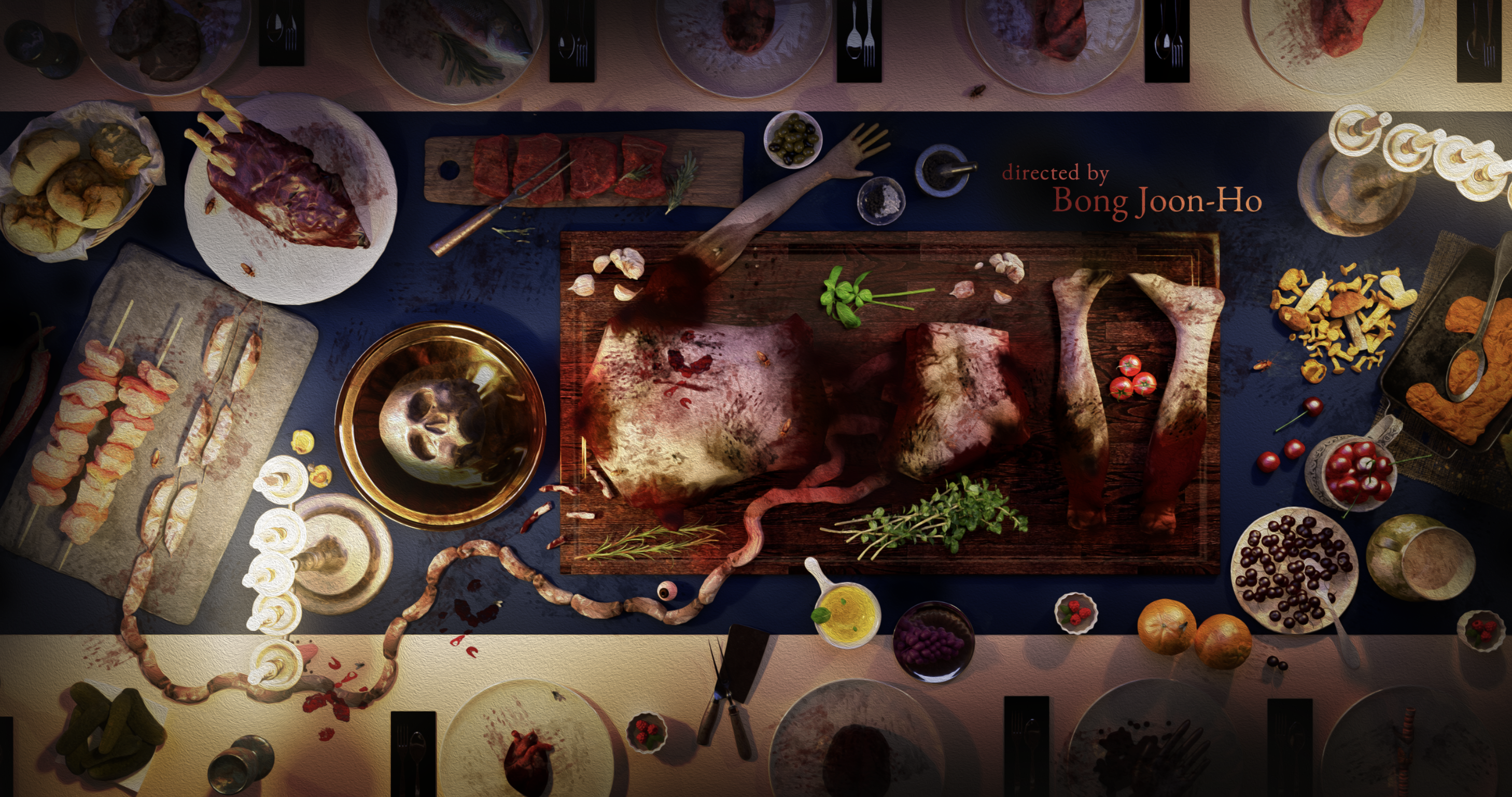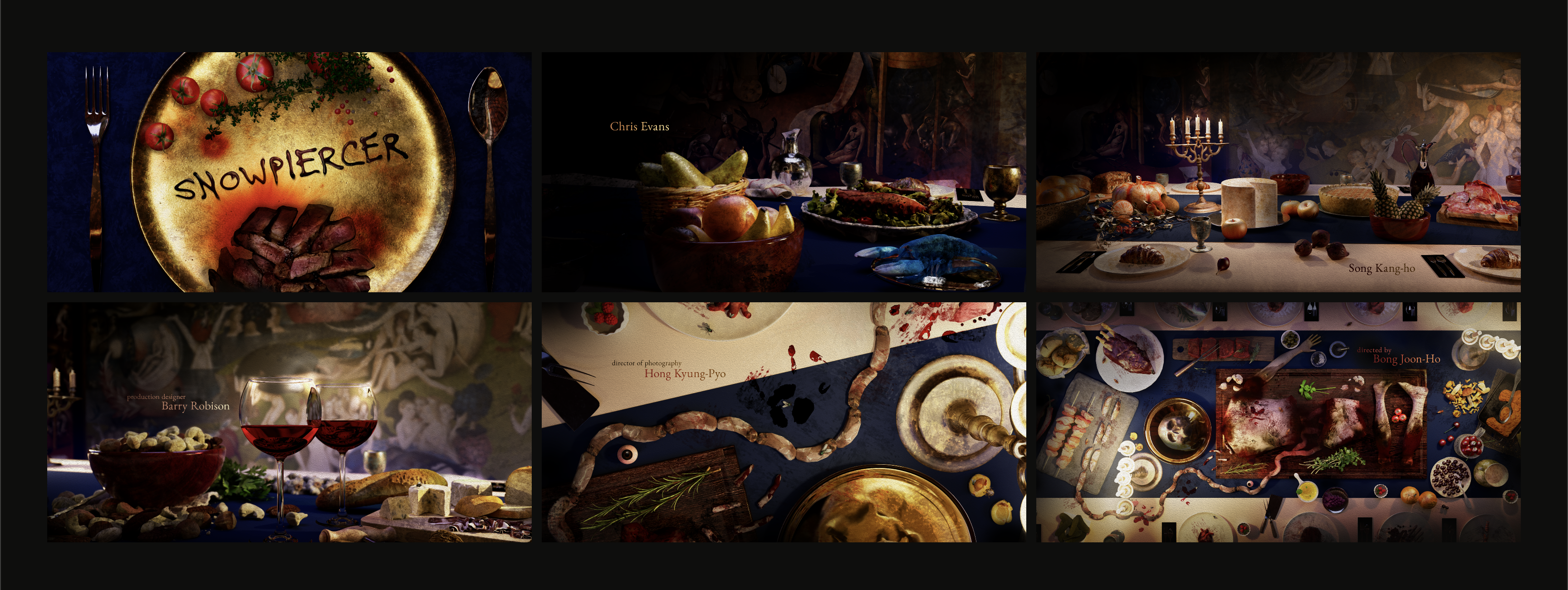 This project reimagines the main title sequence for the film, Snowpiercer. A notable theme is the cyclical nature of power. This sequence shows a societal transformation - the sequence begins with an opulent offering of edible delicacy paired with hellish and eerie paintings to show the states of the upper and lower class. By the end, the food is bloody, showing the breakdown of the elites while the happier paintings symbolize the rejoicing of the masses. Project Partner / Aaron Christian