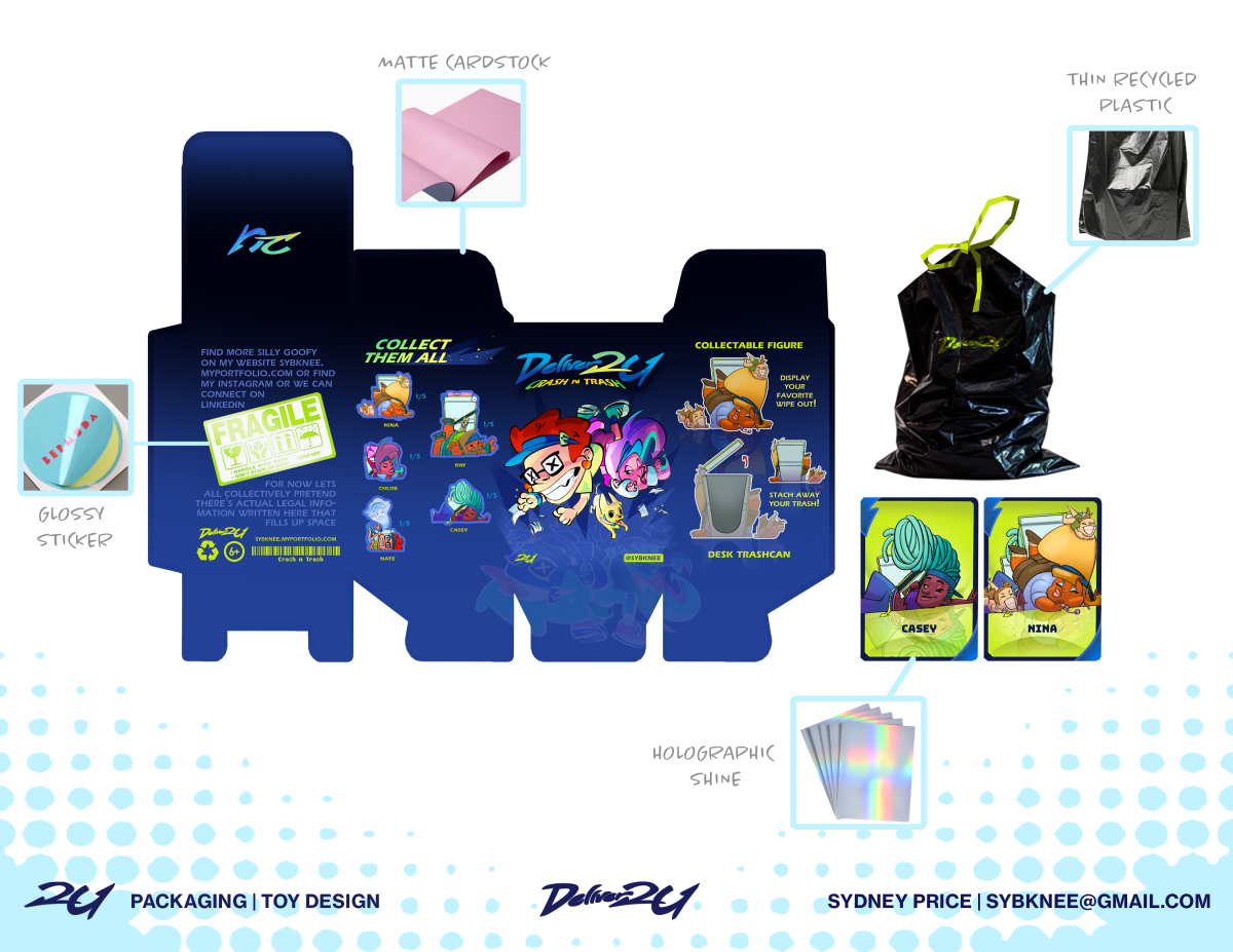 Deliver 2U: Crash n' Trash is a toy line inspired by the characters in the game "Deliver 2U." After the drivers CRASH their backpacks become desk TRASH cans. These figures can sit by your computer, holding candy wrappers, pencil shavings or other trinkets.
