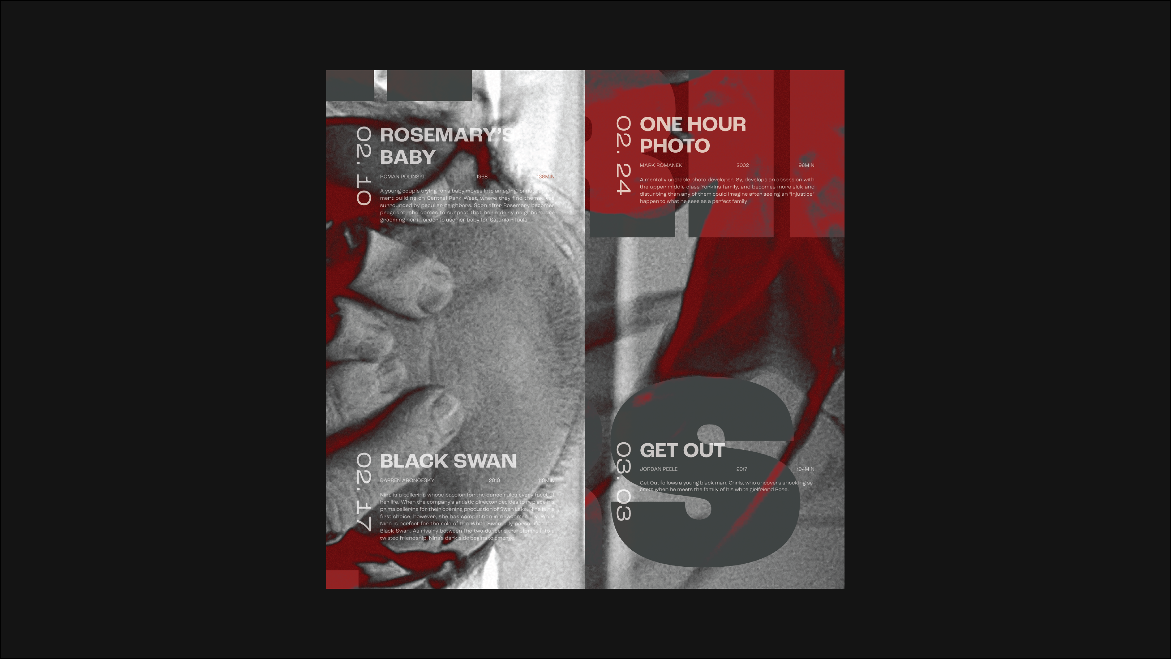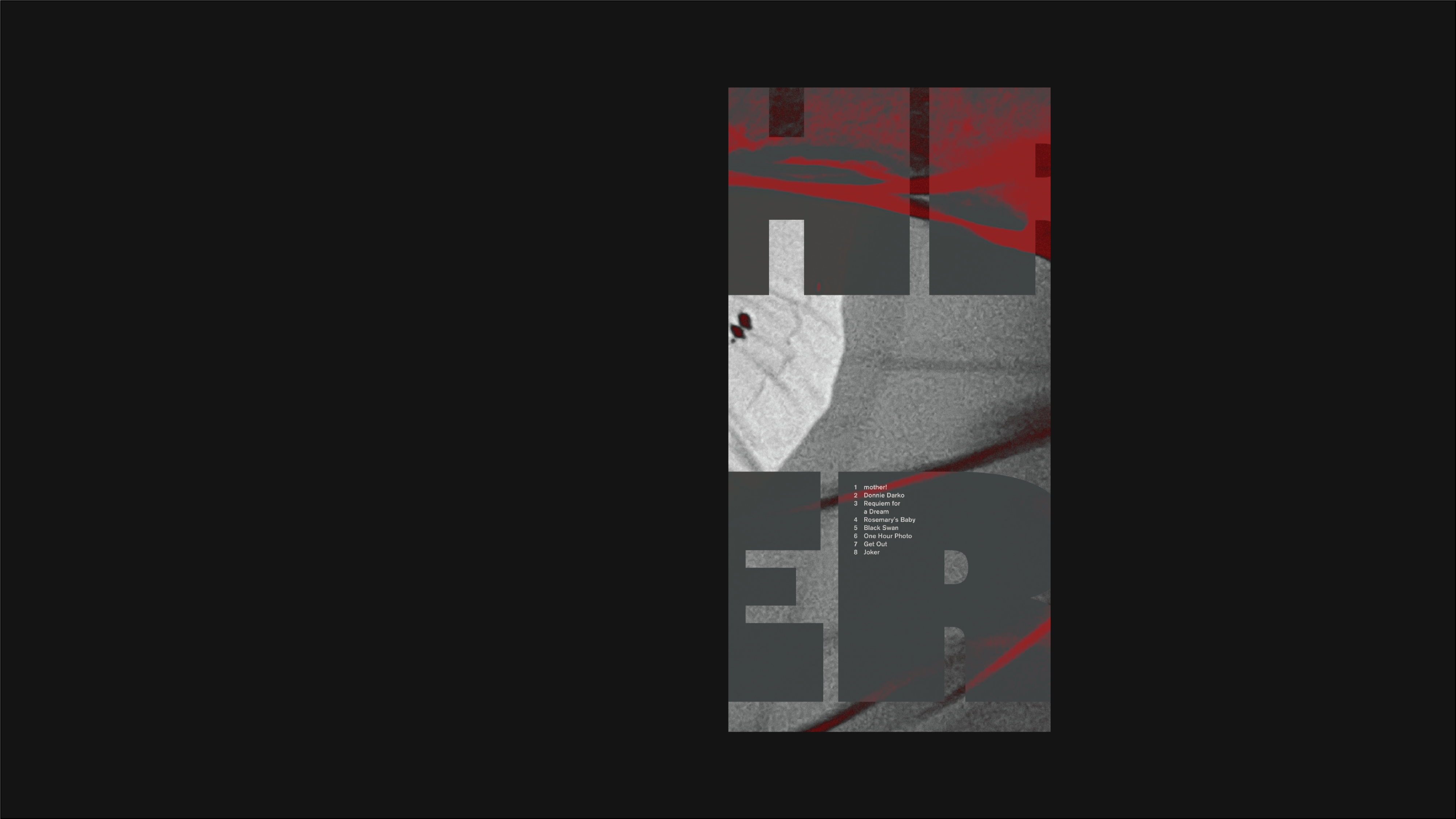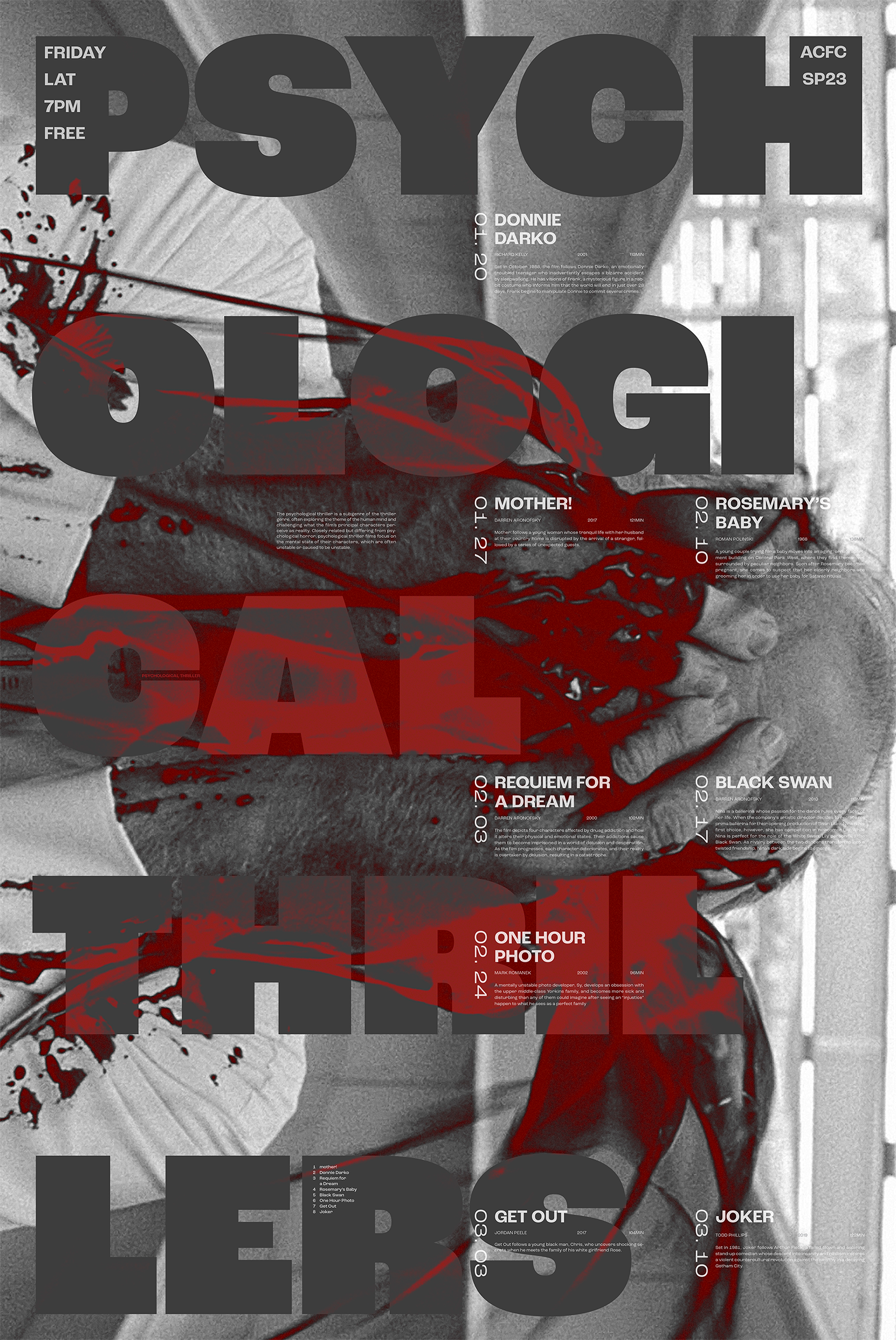 This project introduces a series of Psychological Thriller film showings in the form of a poster that can also act as a brochure. The image used in the poster is a still from One Hour Photo (2002), and the blood from the still is used as graphic elements.