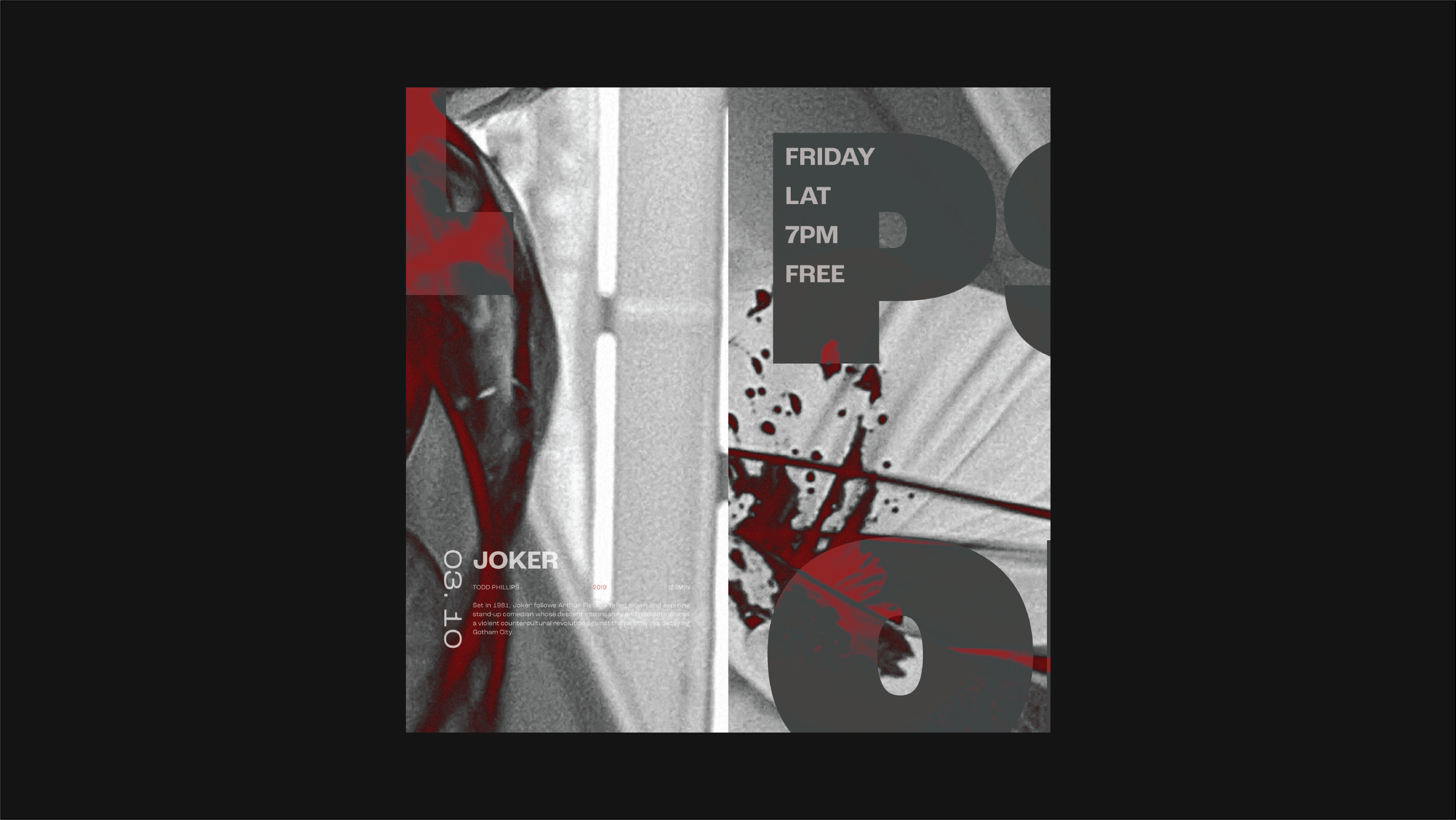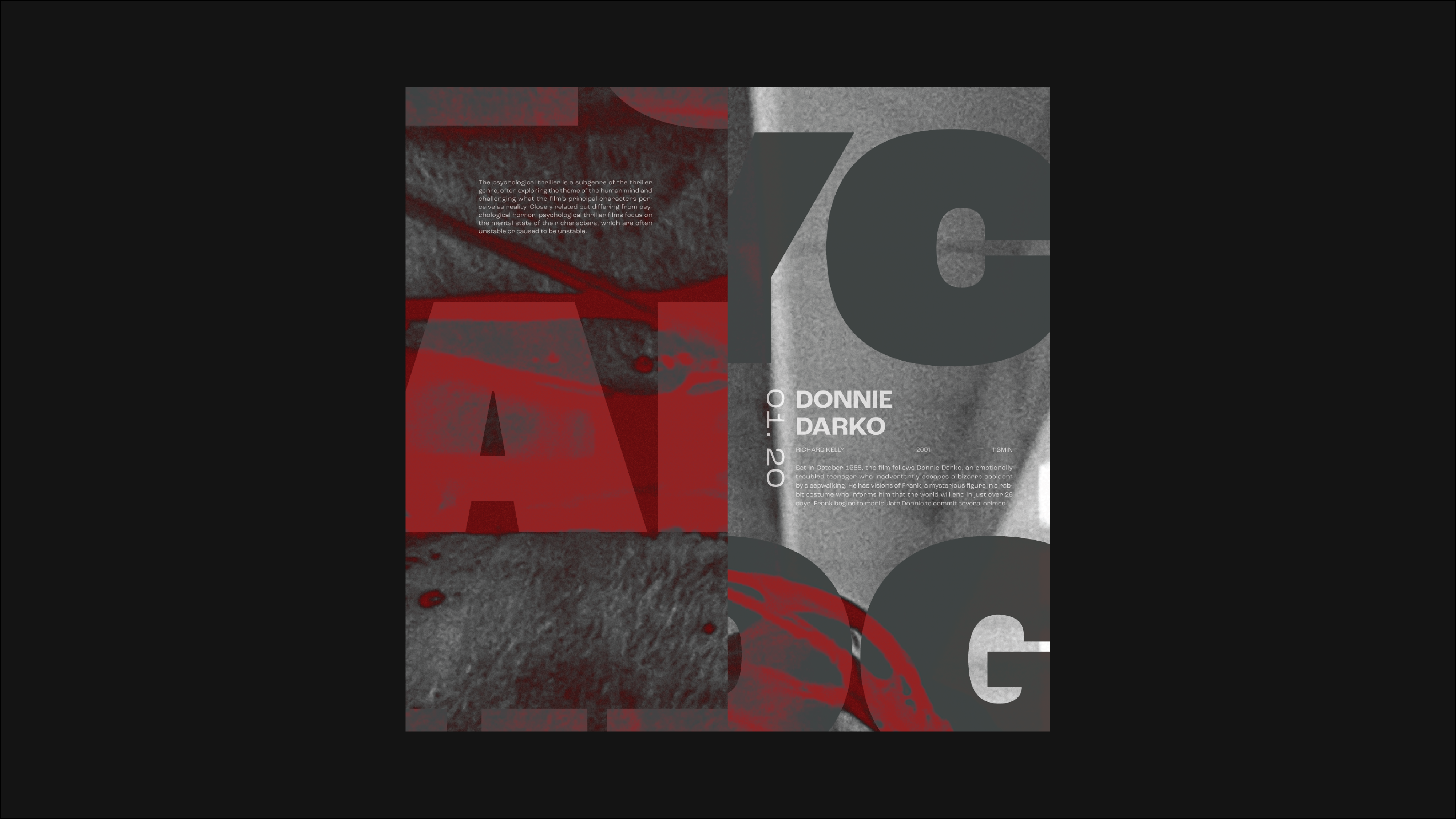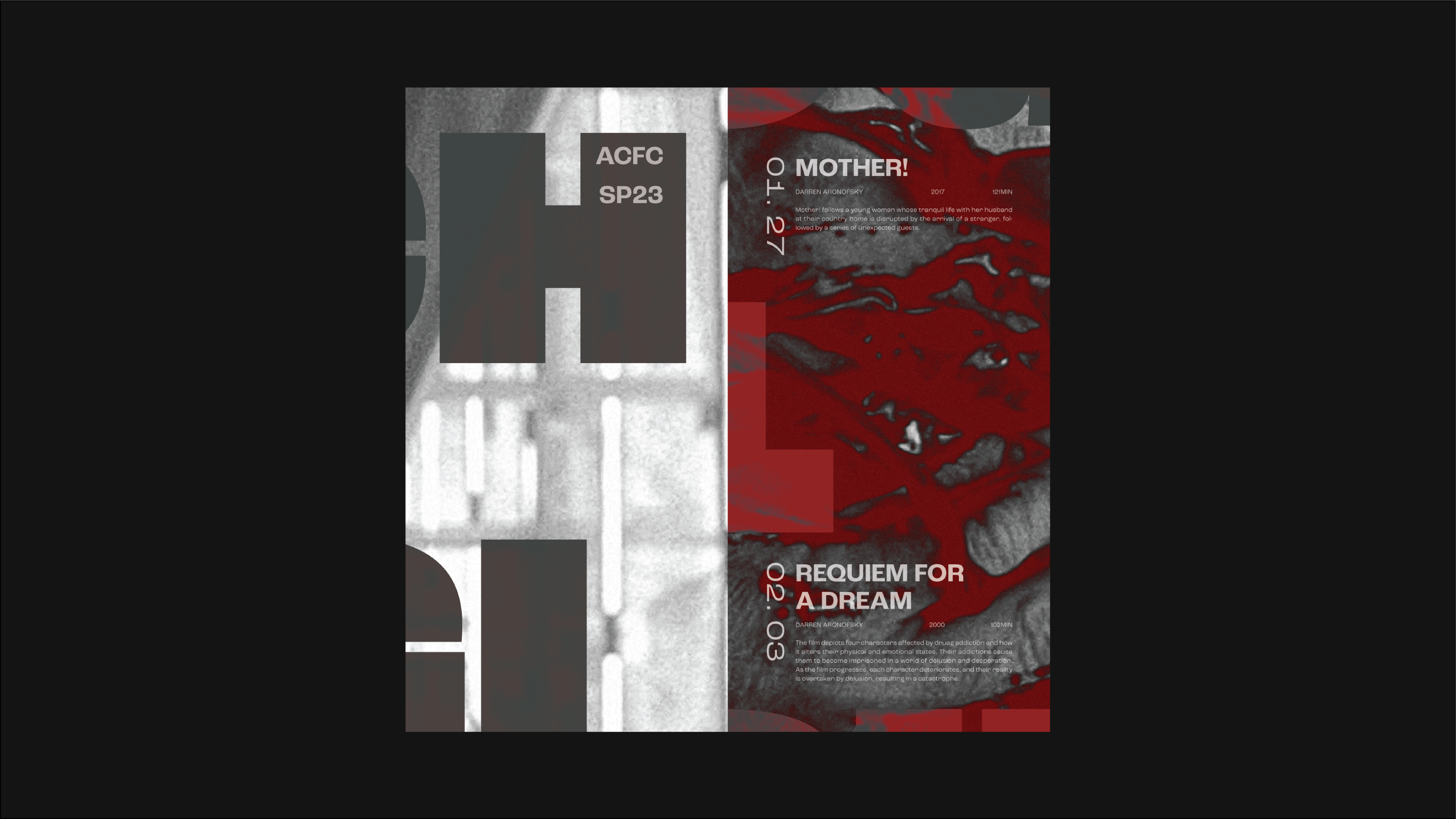 This project introduces a series of Psychological Thriller film showings in the form of a poster that can also act as a brochure. The image used in the poster is a still from One Hour Photo (2002), and the blood from the still is used as graphic elements.