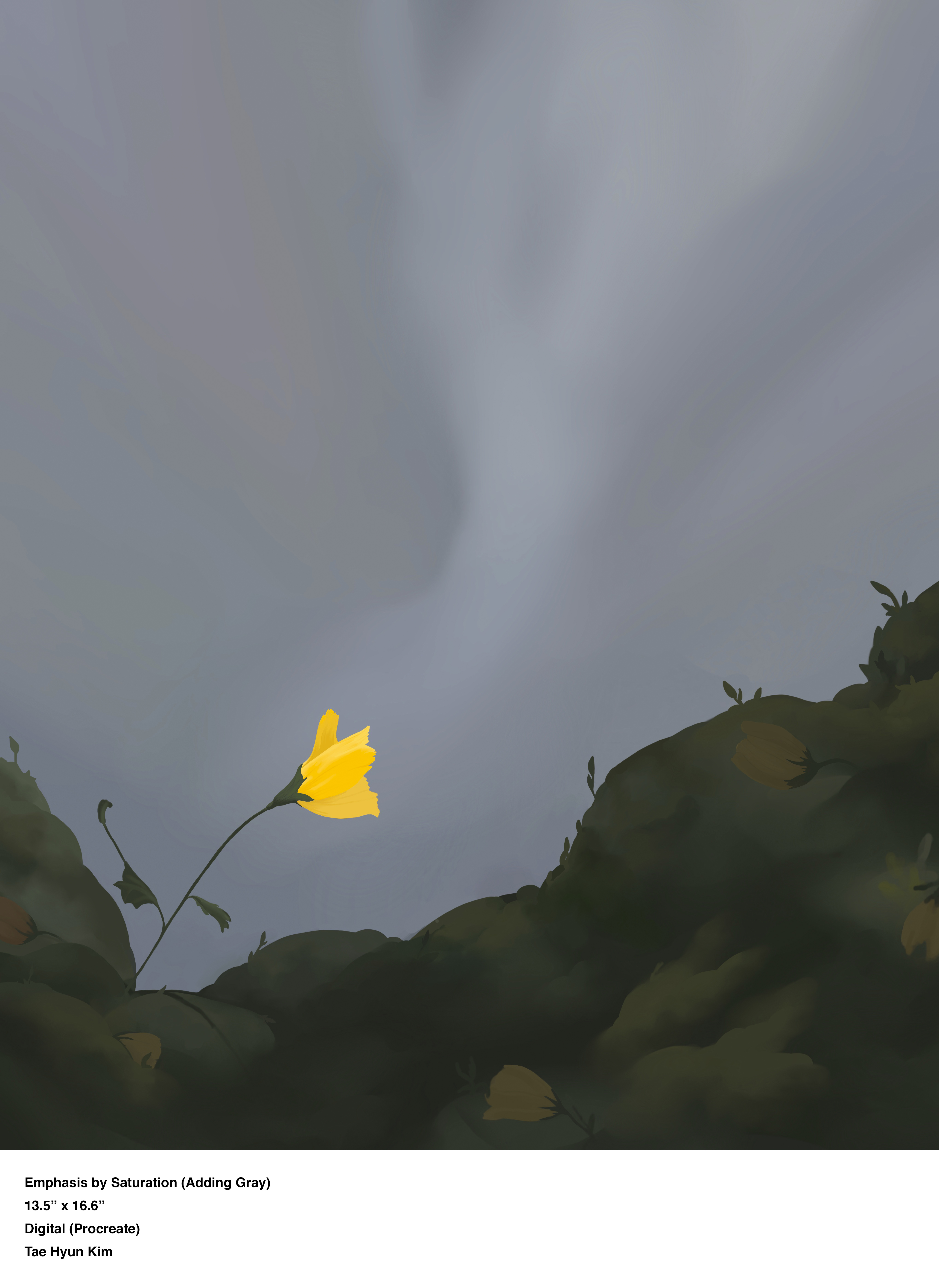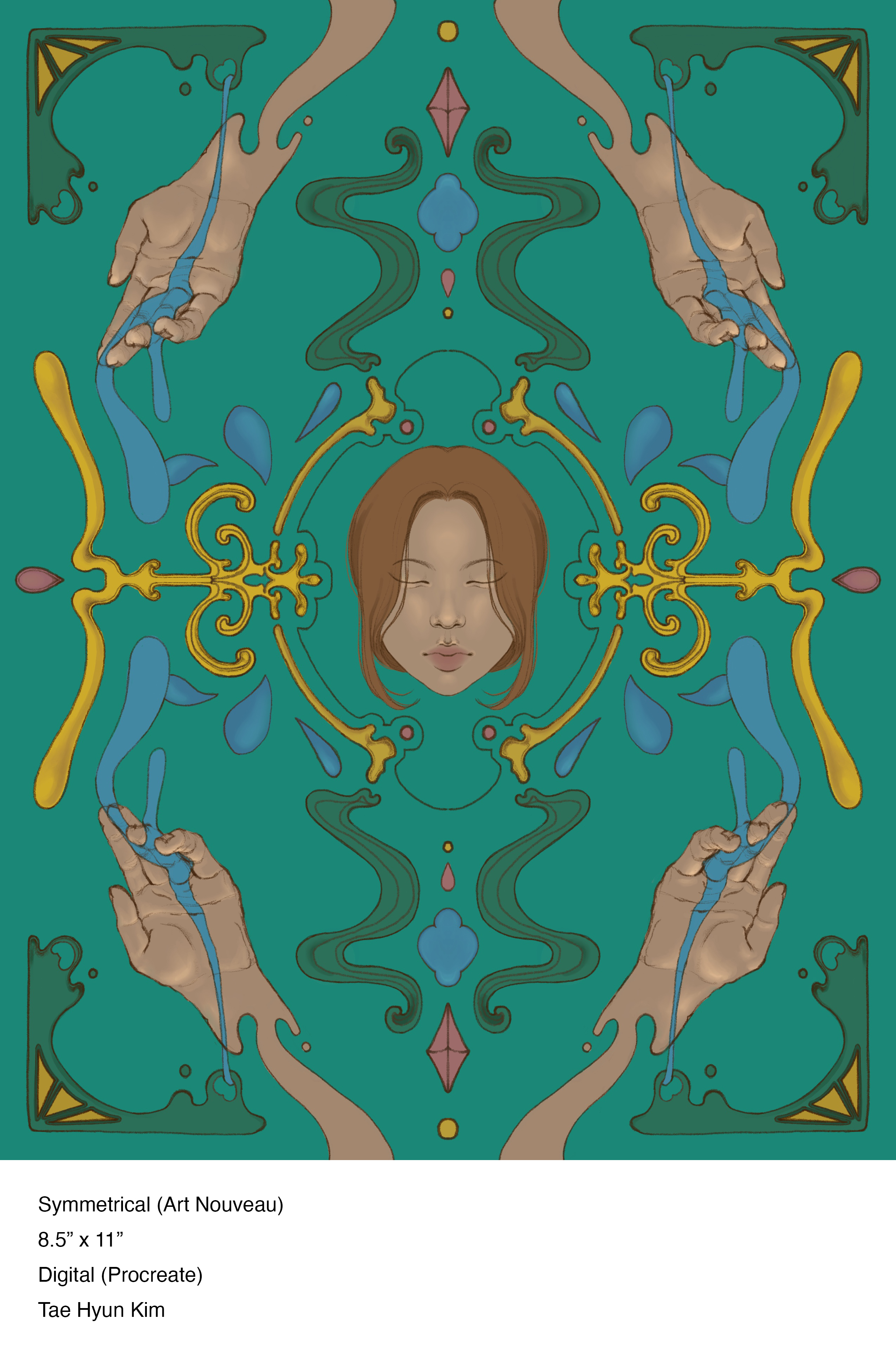 We were instructed to create different compositions up until Week 7 based on different elements of design. For the midterm, we chose two of our different compositions to develop, and I decided to choose symmetry (using elements of Art Nouveau) and saturation (by adding gray).