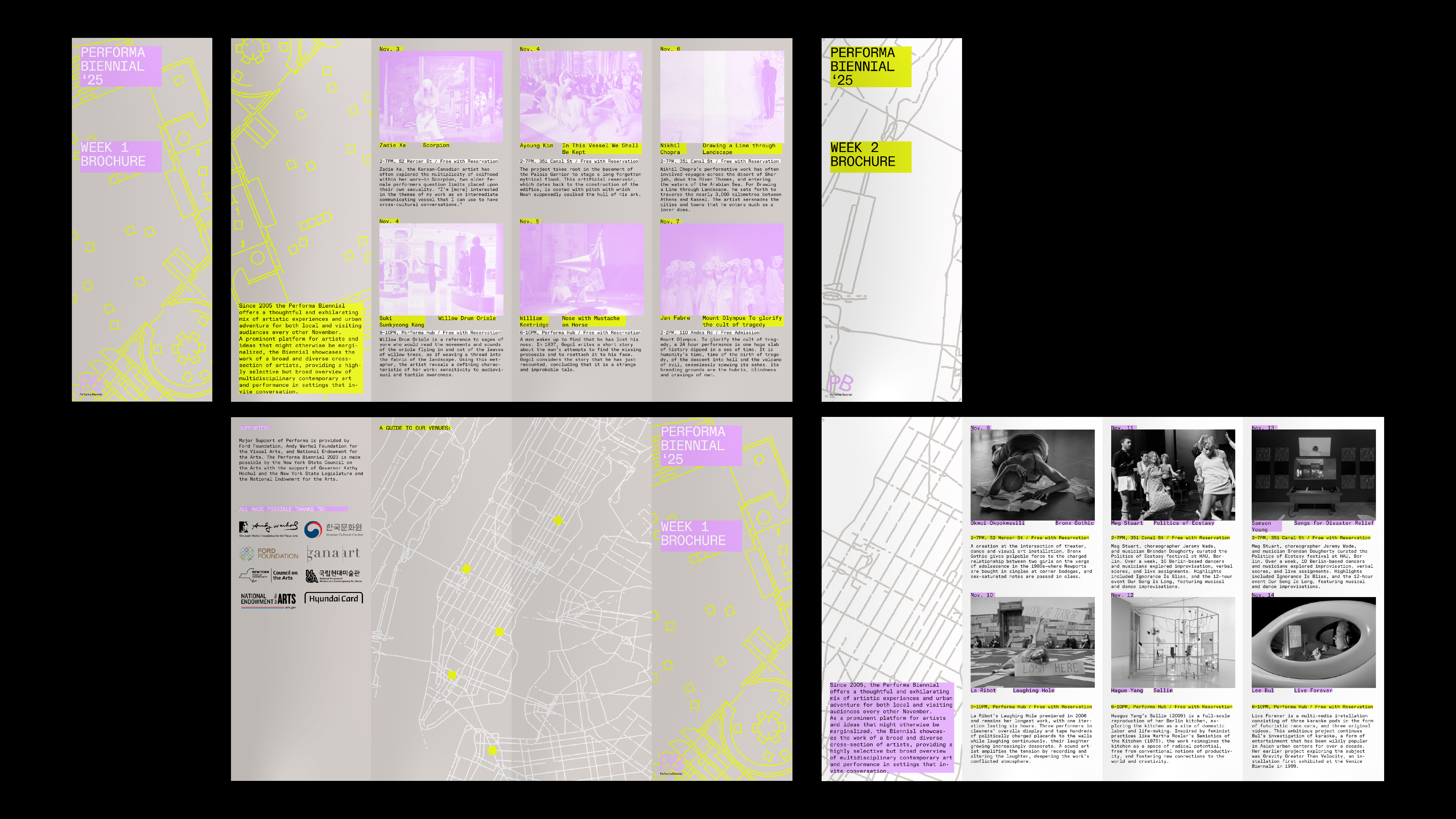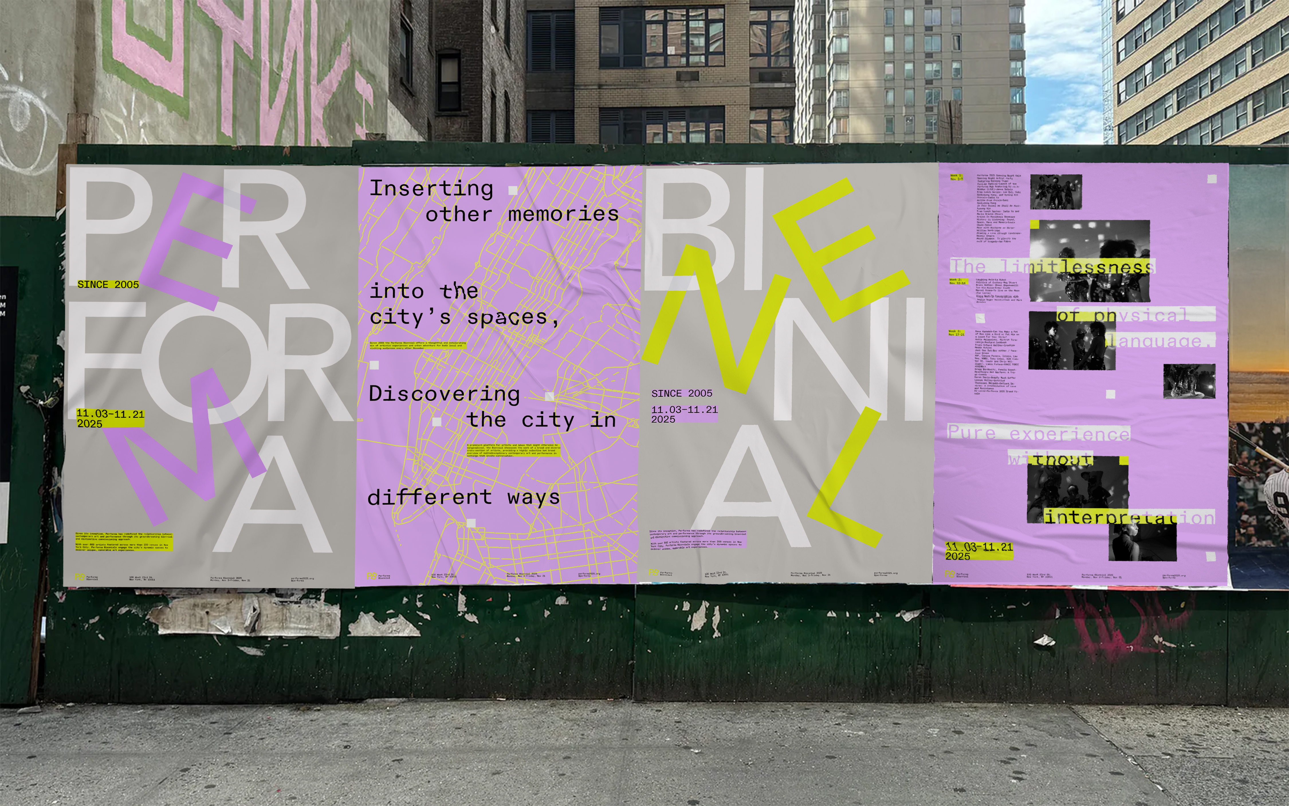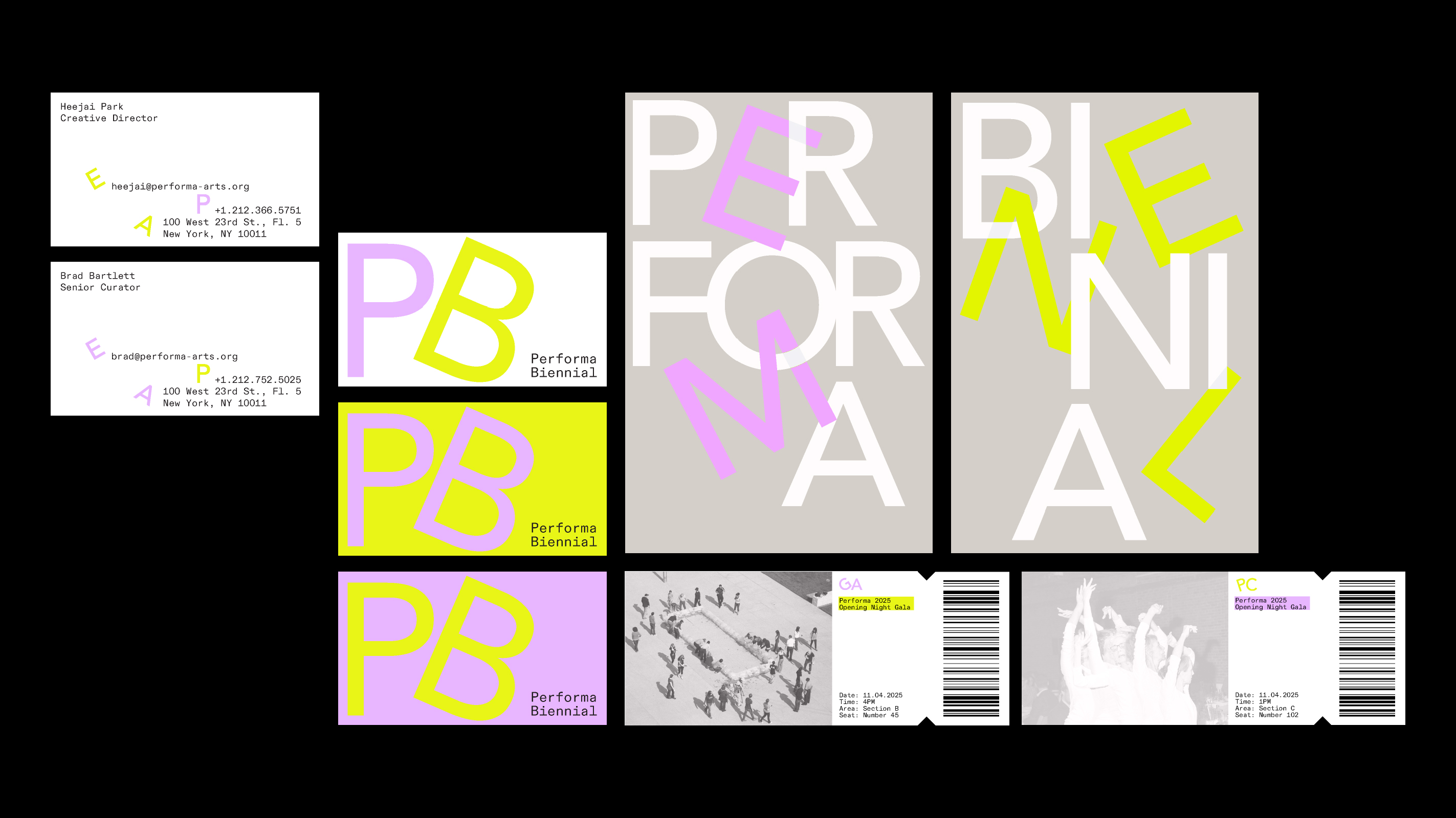 Founded in 2005, the Performa Biennial is recognized as the first biennial to highlight the significance of performance in art history. To honor its dedication to the performing arts and its connection to New York City, the rebrand centers around the idea of movement—movement of artists on stage, movement of stage elements, and movement of the audience and visitors throughout the city.