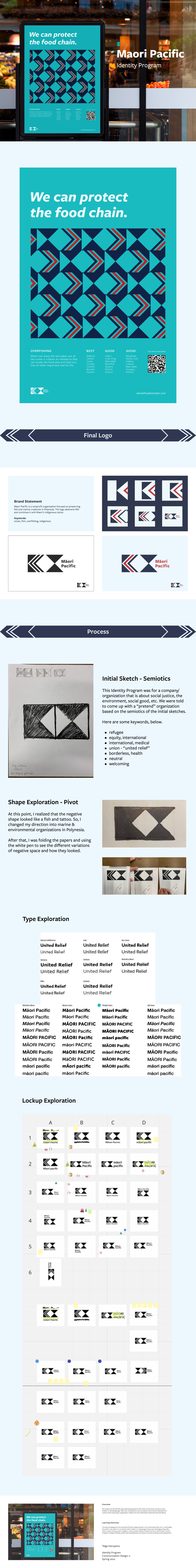 This project started off with quick sketching sessions for five weeks. At this point, we had so much freedom in developing logos. After this, we picked the most successful ones to build an identity from. I picked a fish conservatory organization in Maori since the initial sketch looked like fish and tattoos.