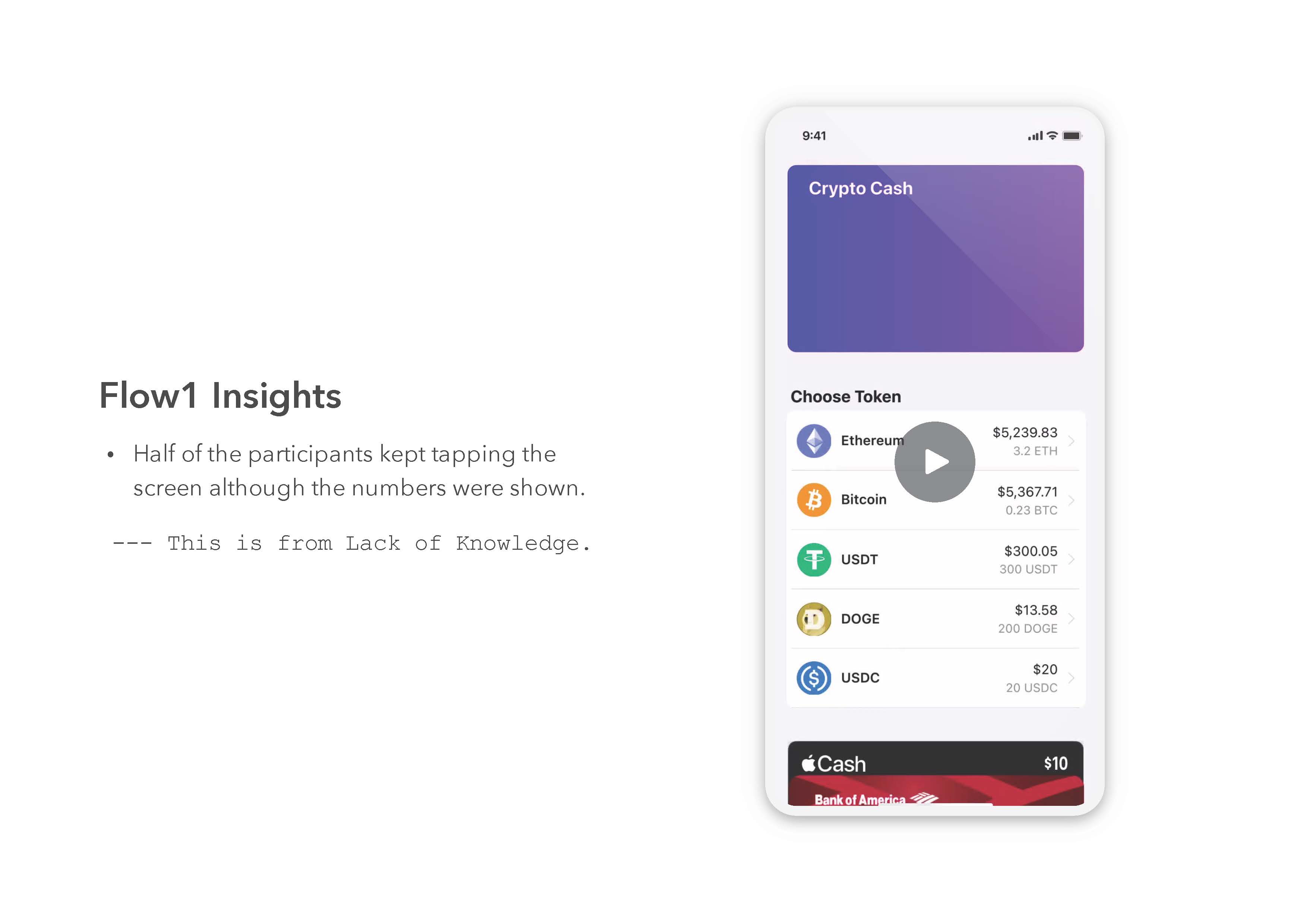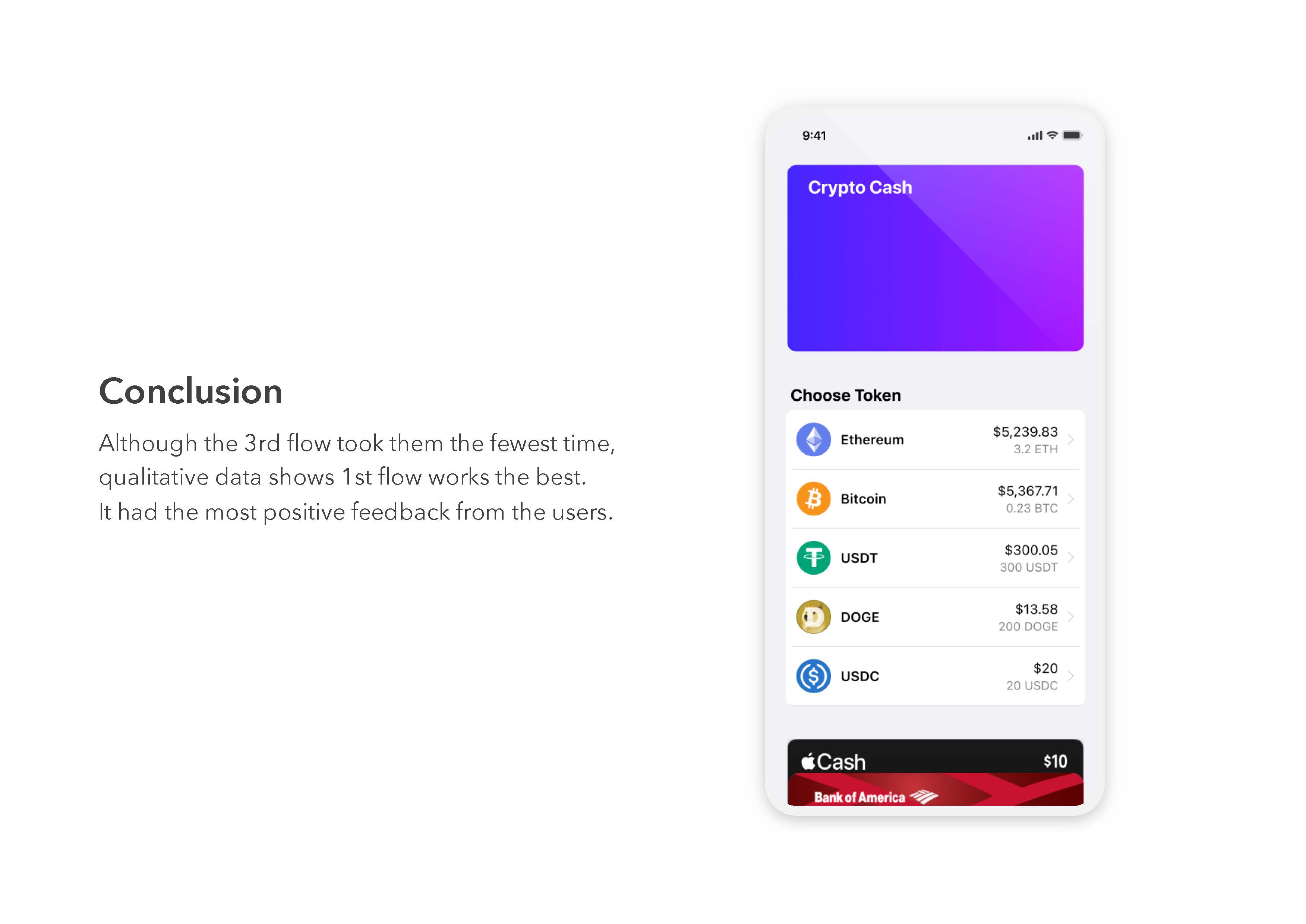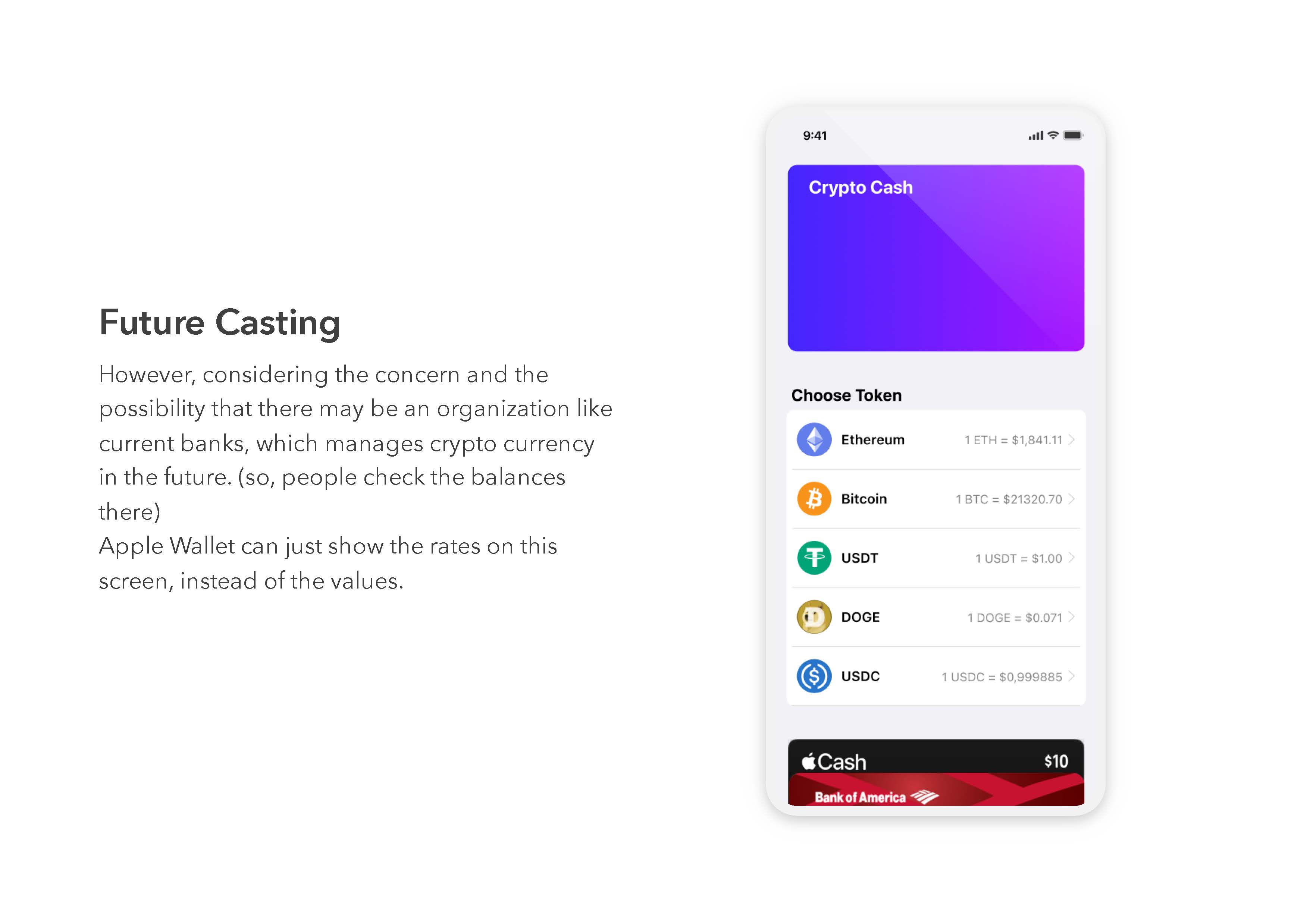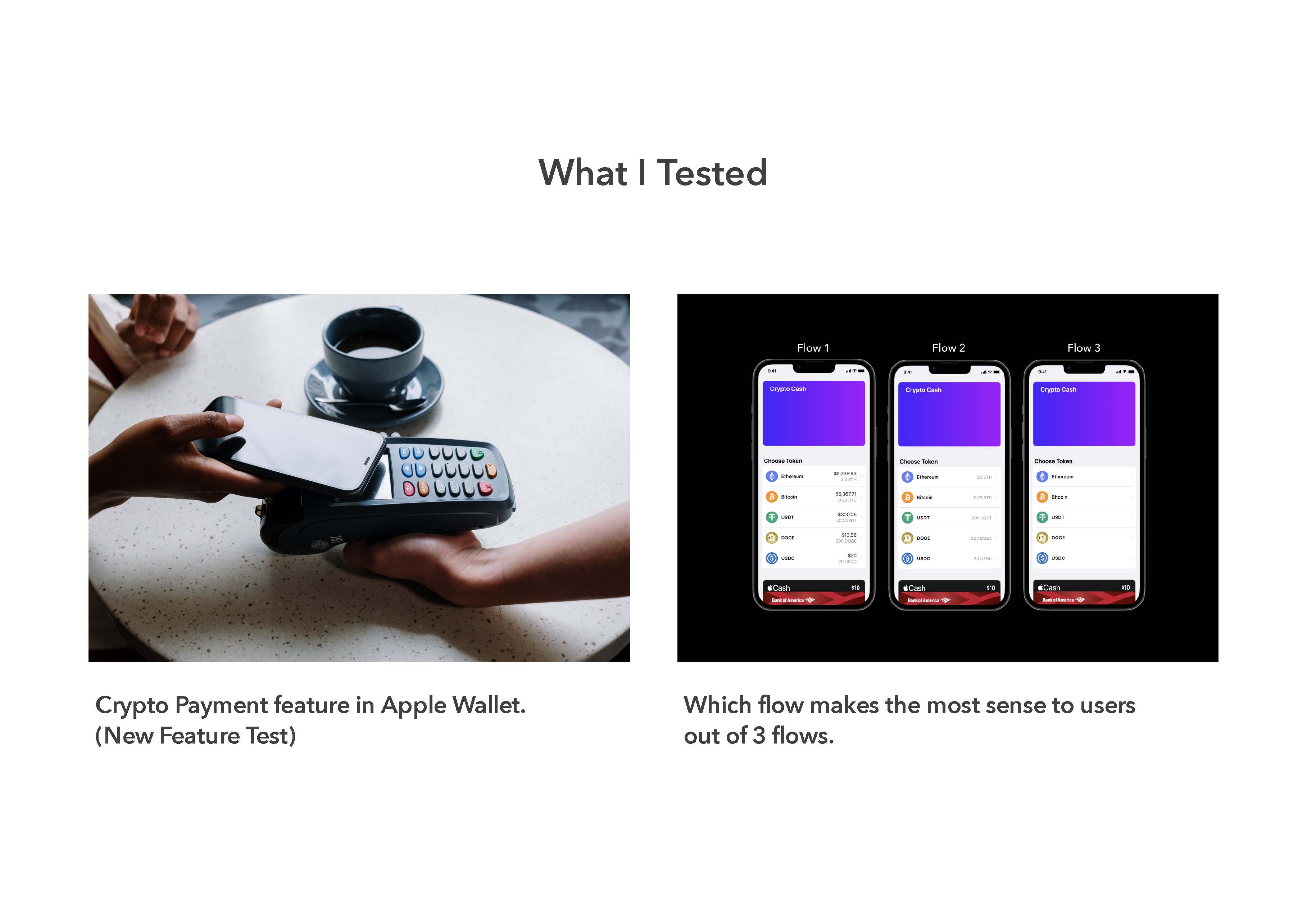 For this final, I implemented Crypto Payment feature in Apple Wallet app. And tested if I successfully implemented the feature in Apple Wallet and how much information users want to see on the specific page, "Choose Token" page. Click the link to see the interactive presentation. (you can click images to see them in bigger sizes)
