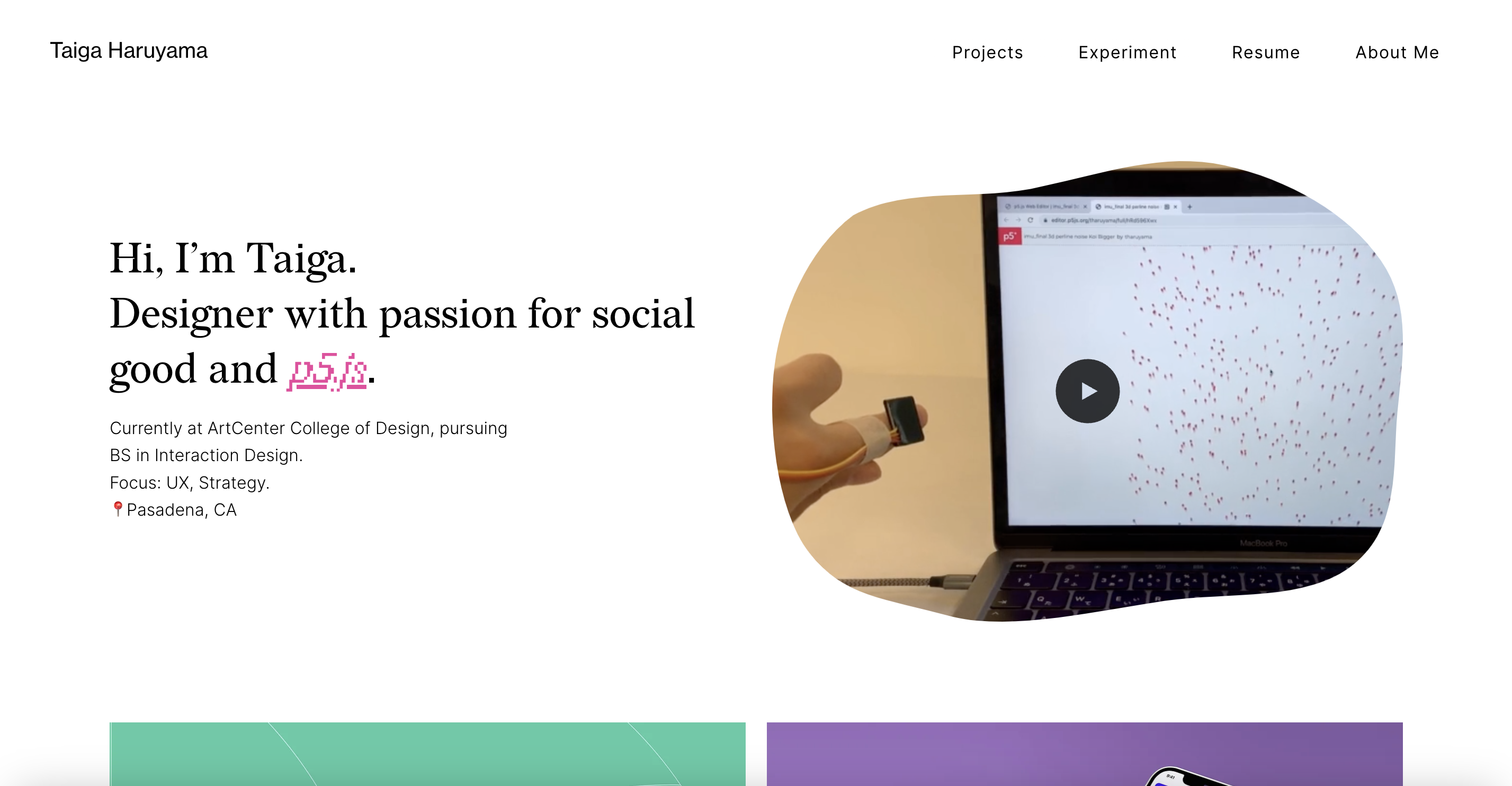 Graduates Select DepartmentBrand Design & StrategyCreative DirectionEntertainment DesignFilmFine ArtFurniture, Lighting and FixturesGraduate ArtGraduate FilmGraduate Graphic DesignGraduate Interaction DesignGraduate Spatial Experience DesignGraphic DesignIllustrationIndustrial DesignInteraction DesignMedia Design PracticesPhotography and ImagingProduct DesignSpatial Experience DesignTransportation DesignTransportation Systems and Design Back to Projects Taiga Haruyama BS in Interaction Design — Interaction Design Portfolio Site Hello World. Image