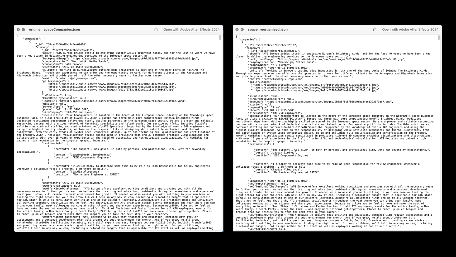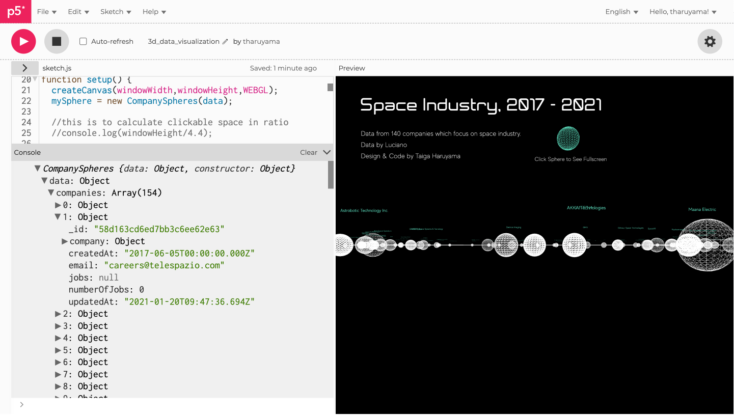 Using json data sheets, I created an interactive 3D data visualization on p5.js, The data was about companies in space industry. The size of each sphere represents the number of employees at a company, while the distance of each sphere from the center point indicates its year of establishment, ranging from 2017 to 2021.