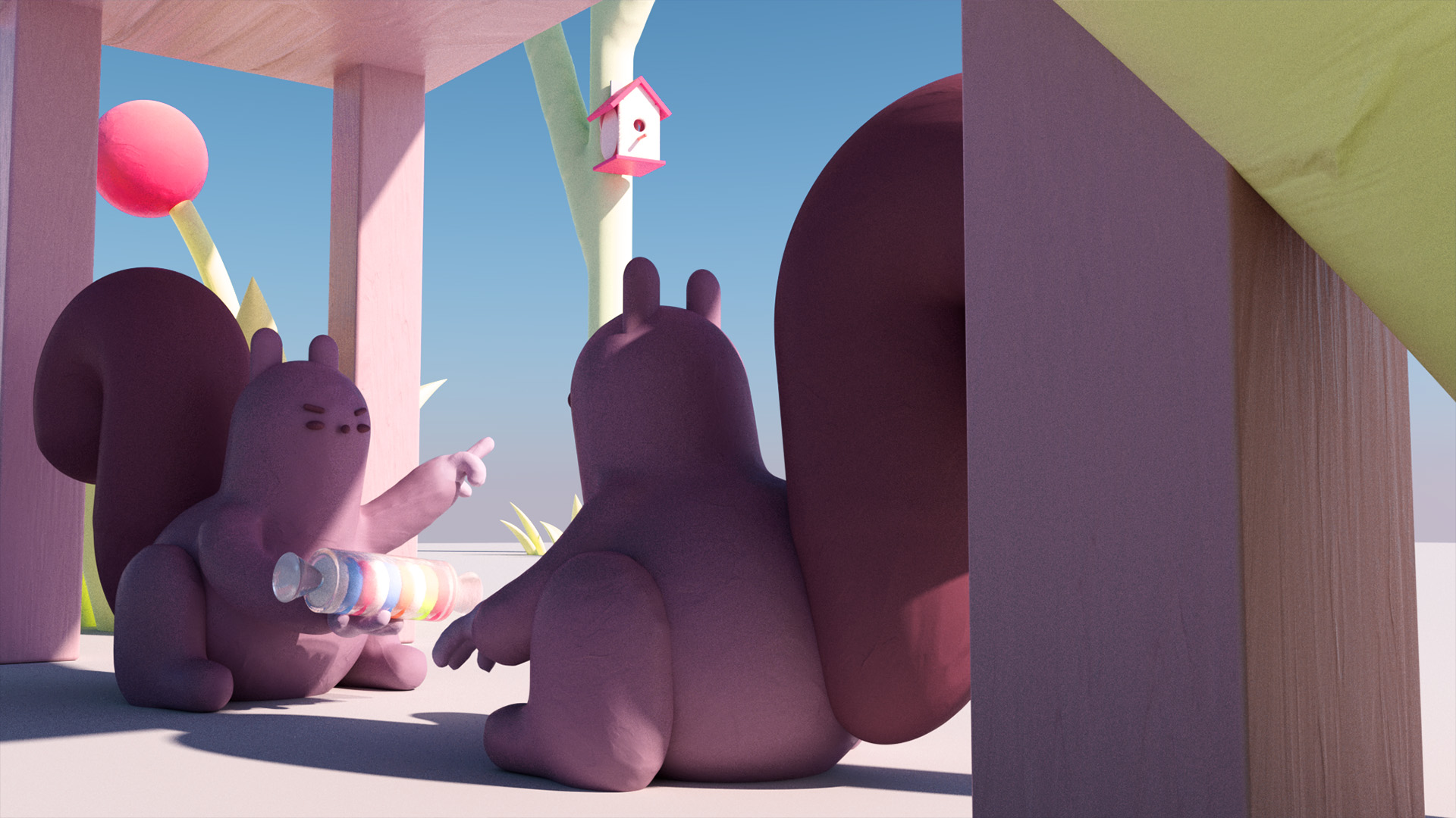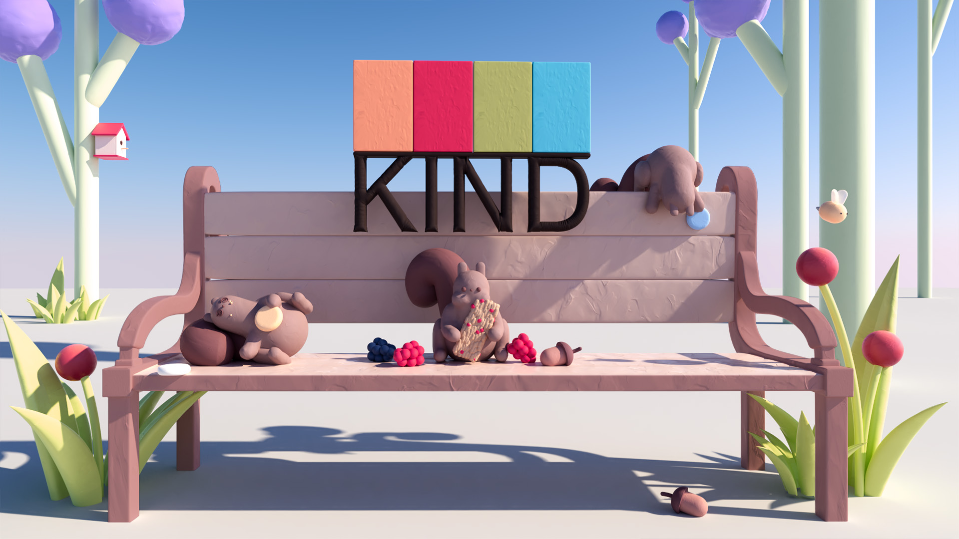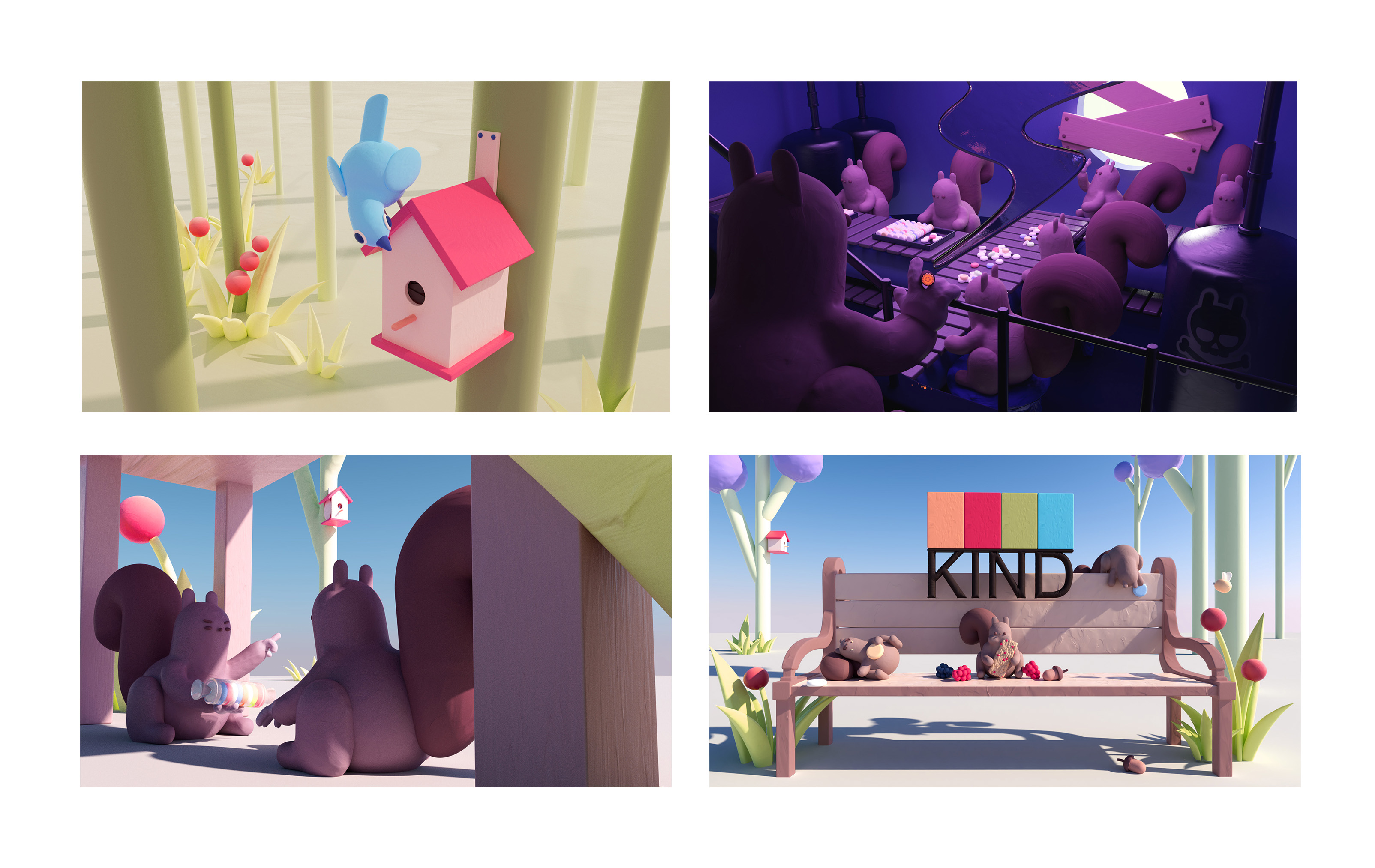 My concept for KIND focuses on a return to nature through real, all-natural ingredients. The camera first establishes the boarded-up birdhouse as the base of operation for manufacturing dangerous, addictive candy. We pan out to reveal the squirrels distributing these products from the shadows. Safely basking in the sunlight above is the one squirrel that chose to eat KIND instead.