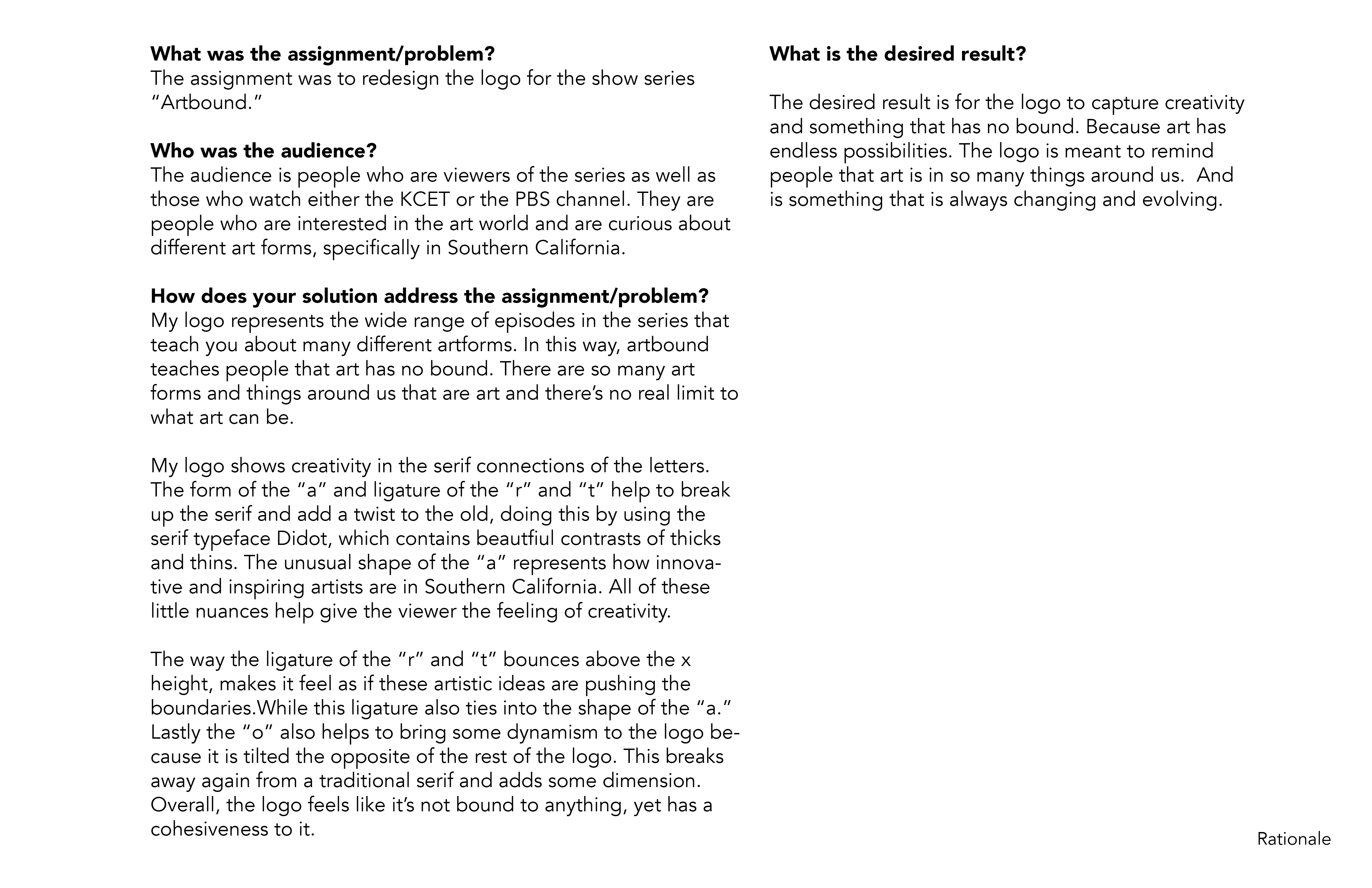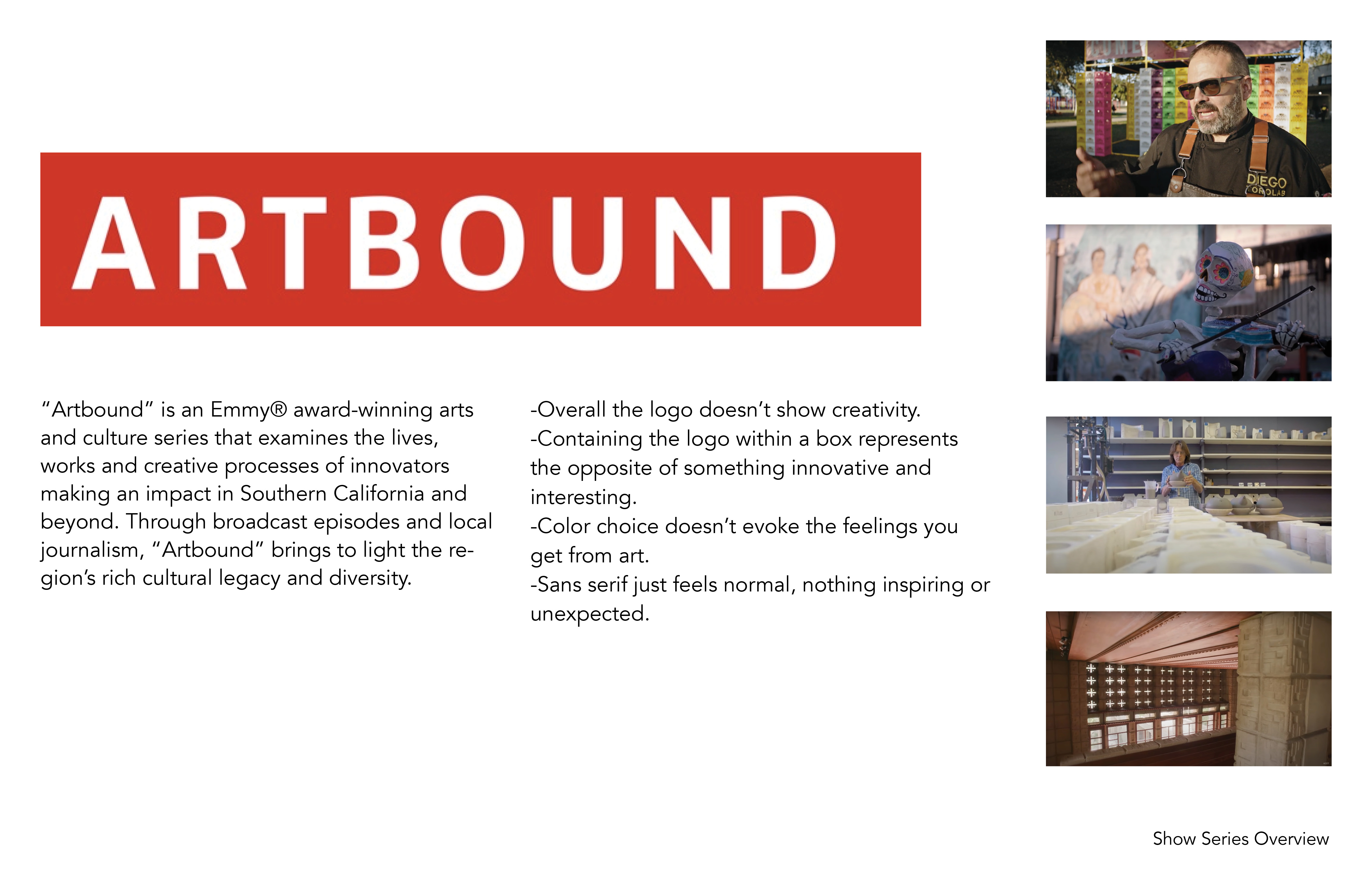 This is my redesign of the Artbound logo. After doing research about the show series and watching an array of episodes, I redesigned the logo to show creativity hidden within something that may seem ordinary at first because I think that there is art everywhere around us, and Artbound highlights that.