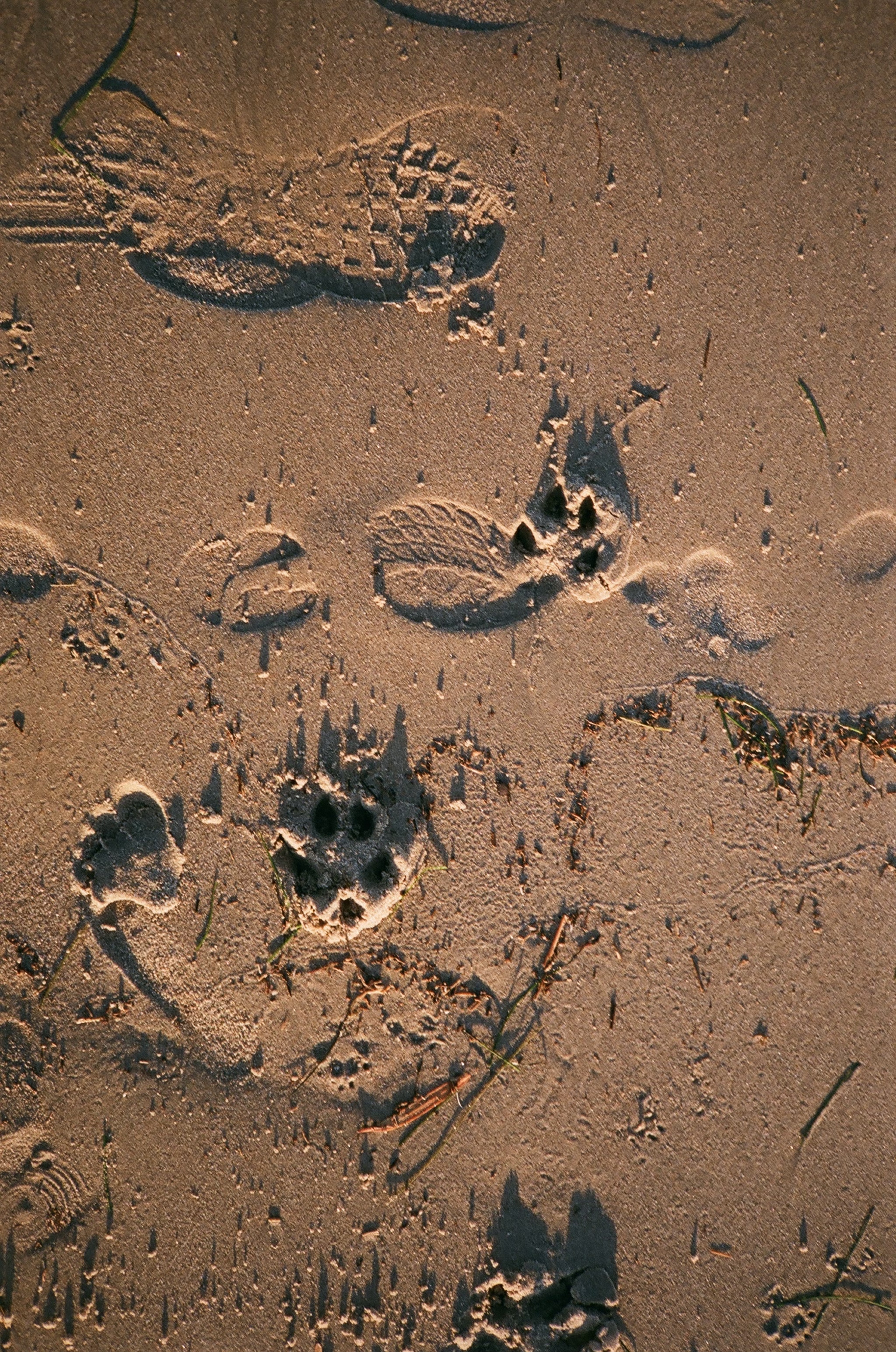The beach is also a place for pets, children, and adults. I feel this image shows these three coming together. The shoe prints, footprints and paw prints.