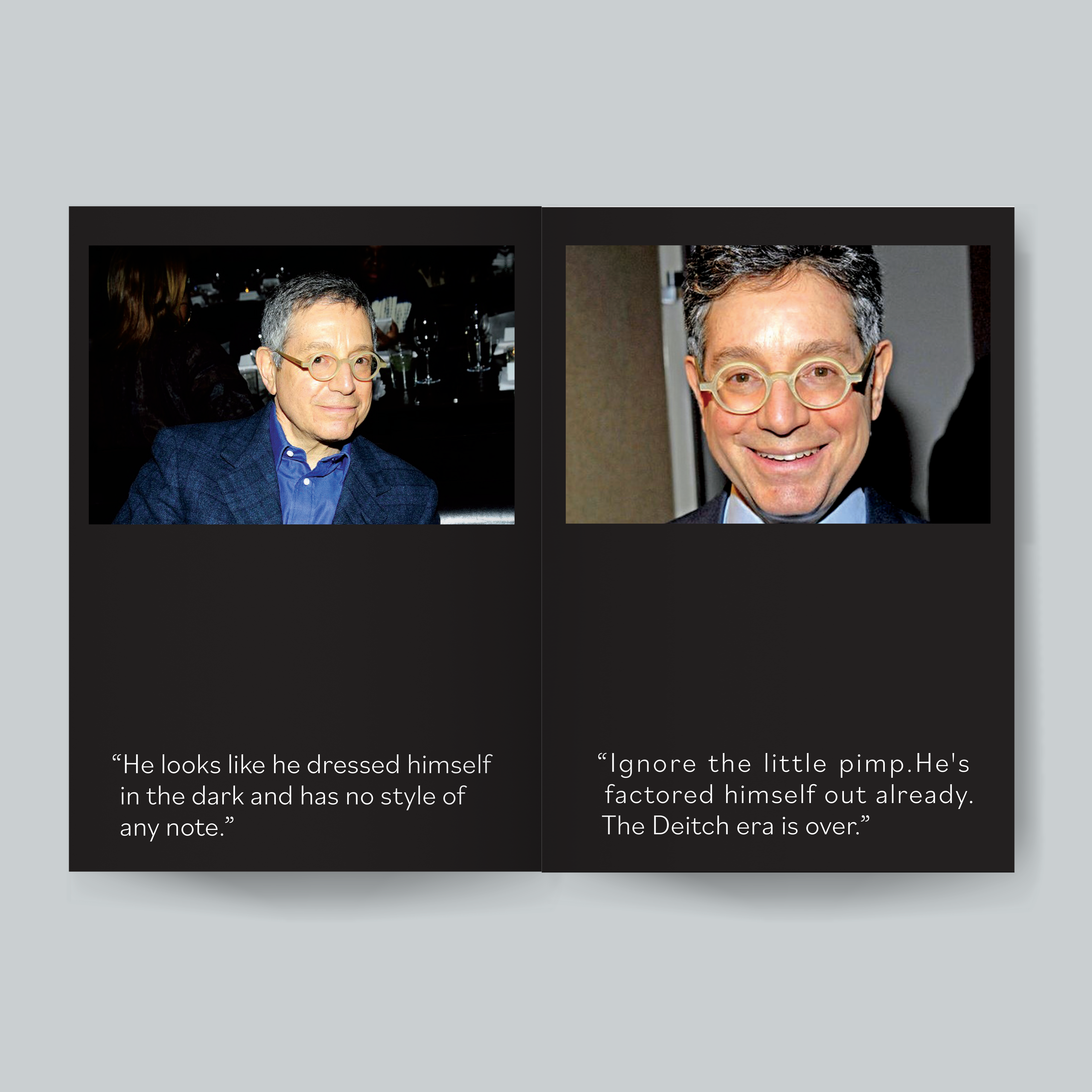 The engawa or entrance to the book. This section is contrasting images of Jeffrey Deitch smiling with the many criticisms that have been said about him. This represents the idea that although Deitch has received a lot of hate and criticism, he goes on with his life and doesn't change who he is, he embraces it.