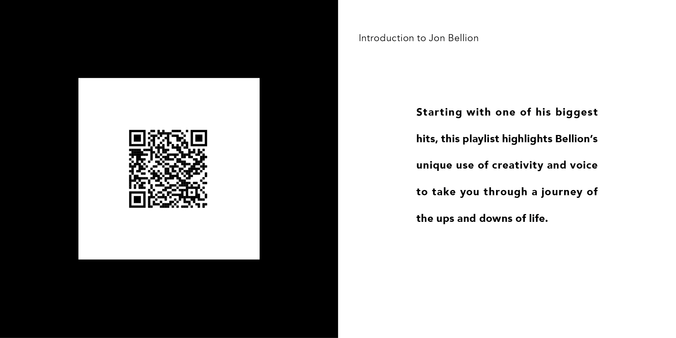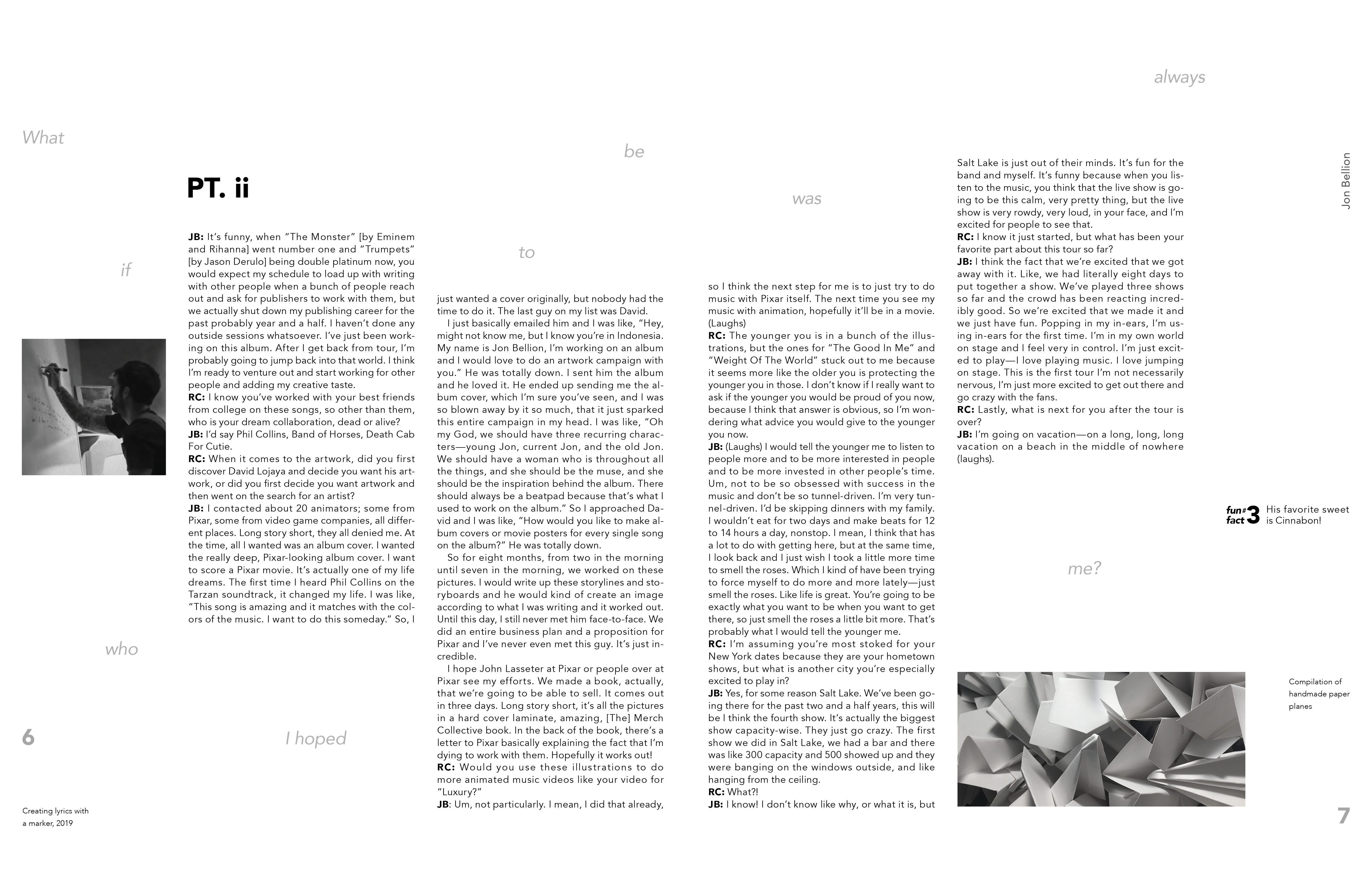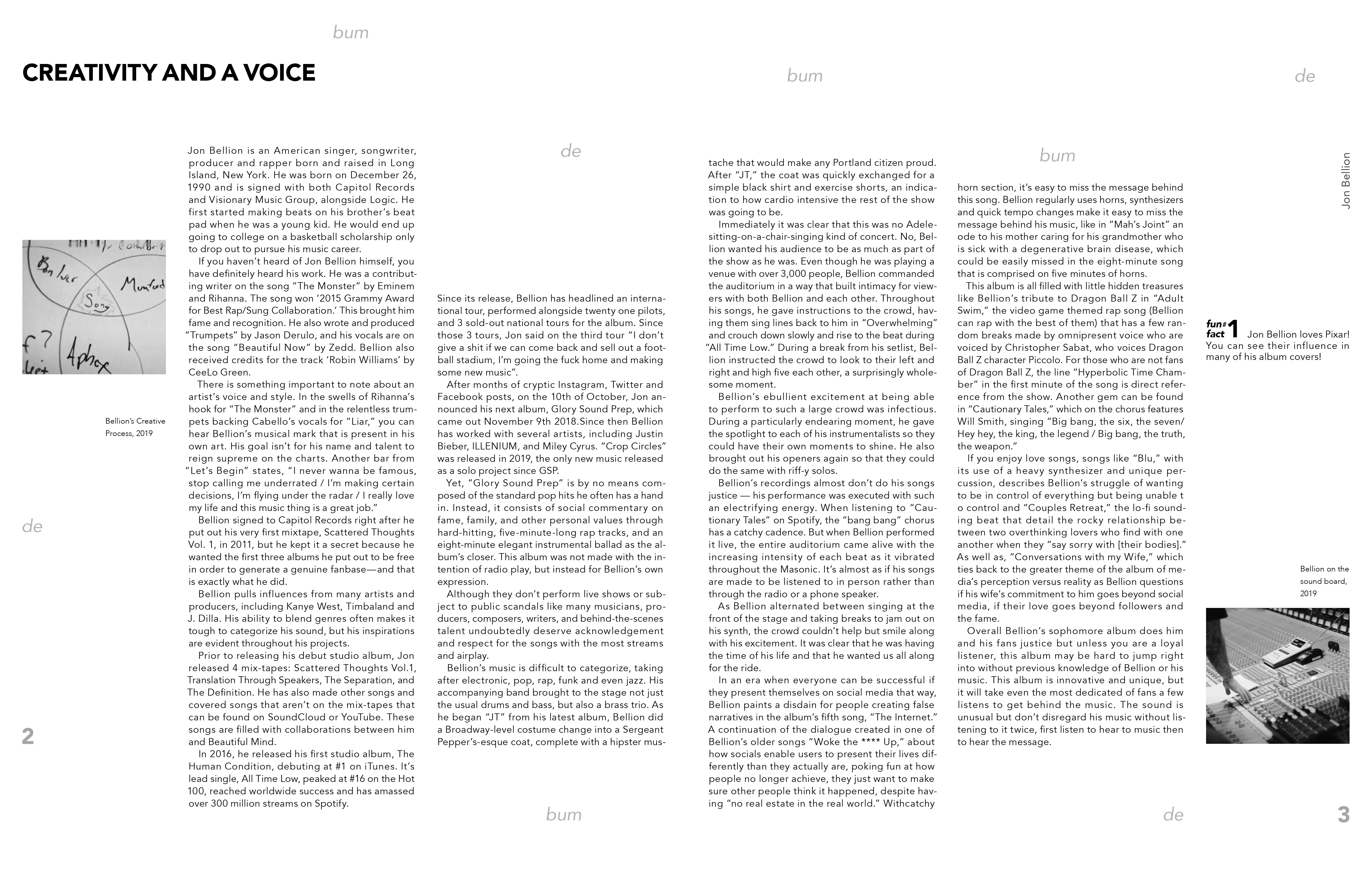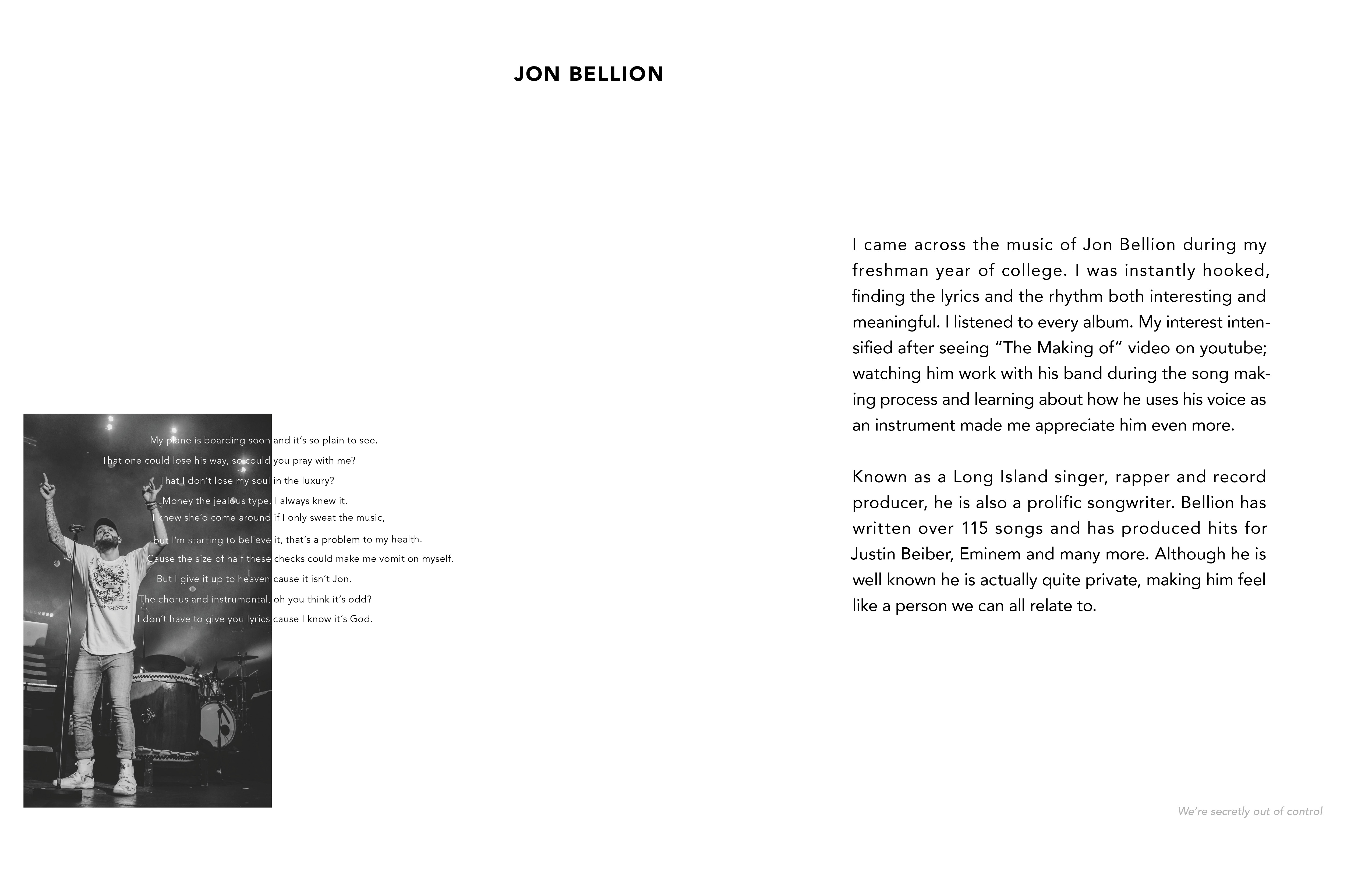 Work in Progres- To be printed soon! This is a book about Jon Bellion, which introduces you to him and his music. It is made to inform viewers about Jon Bellion and interest them to look into the artist. It includes a mini foldout in the center of the book which has a QR code that leads you to a custom playlist I curated to introduce viewers to Bellion's music.