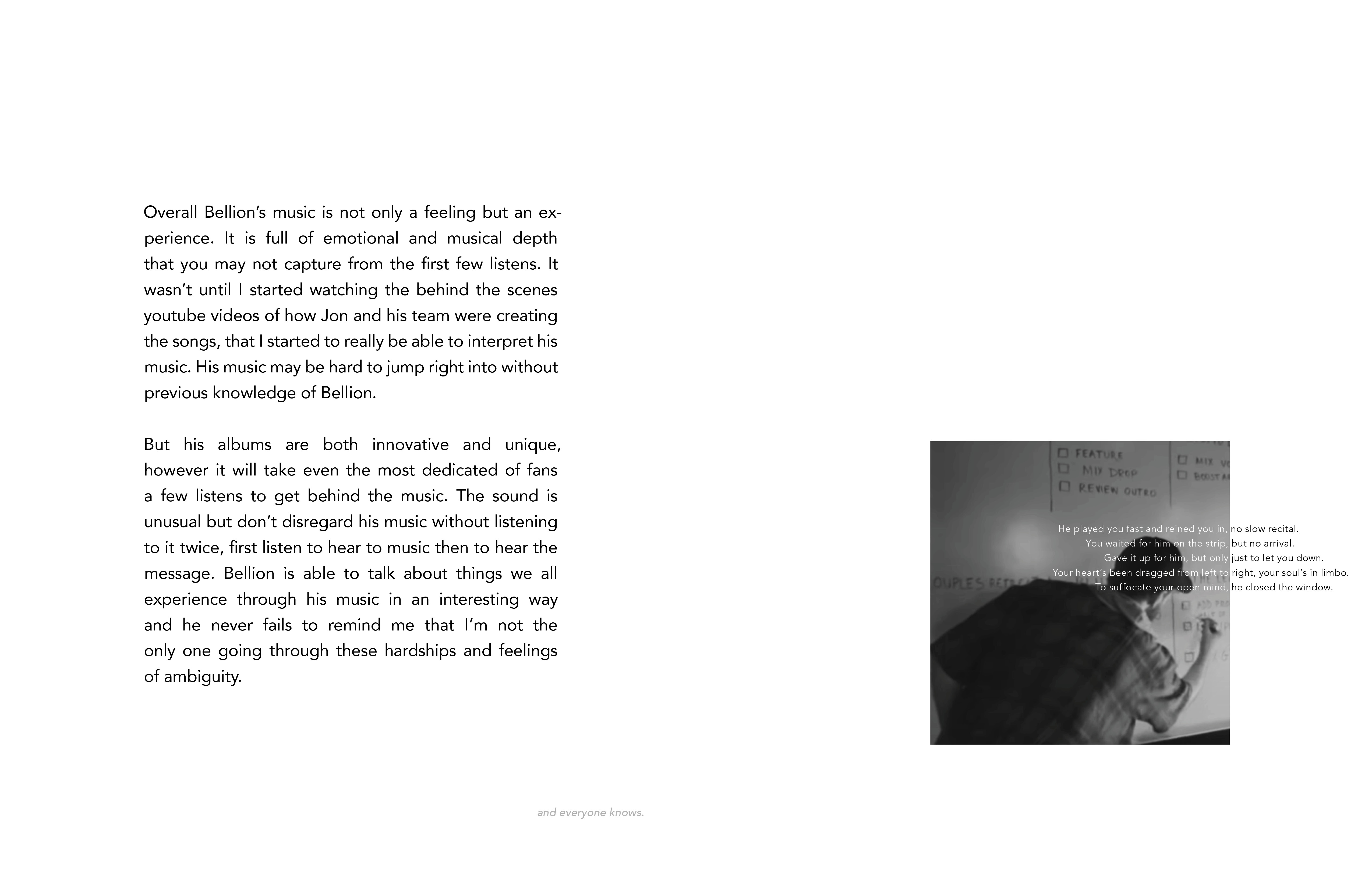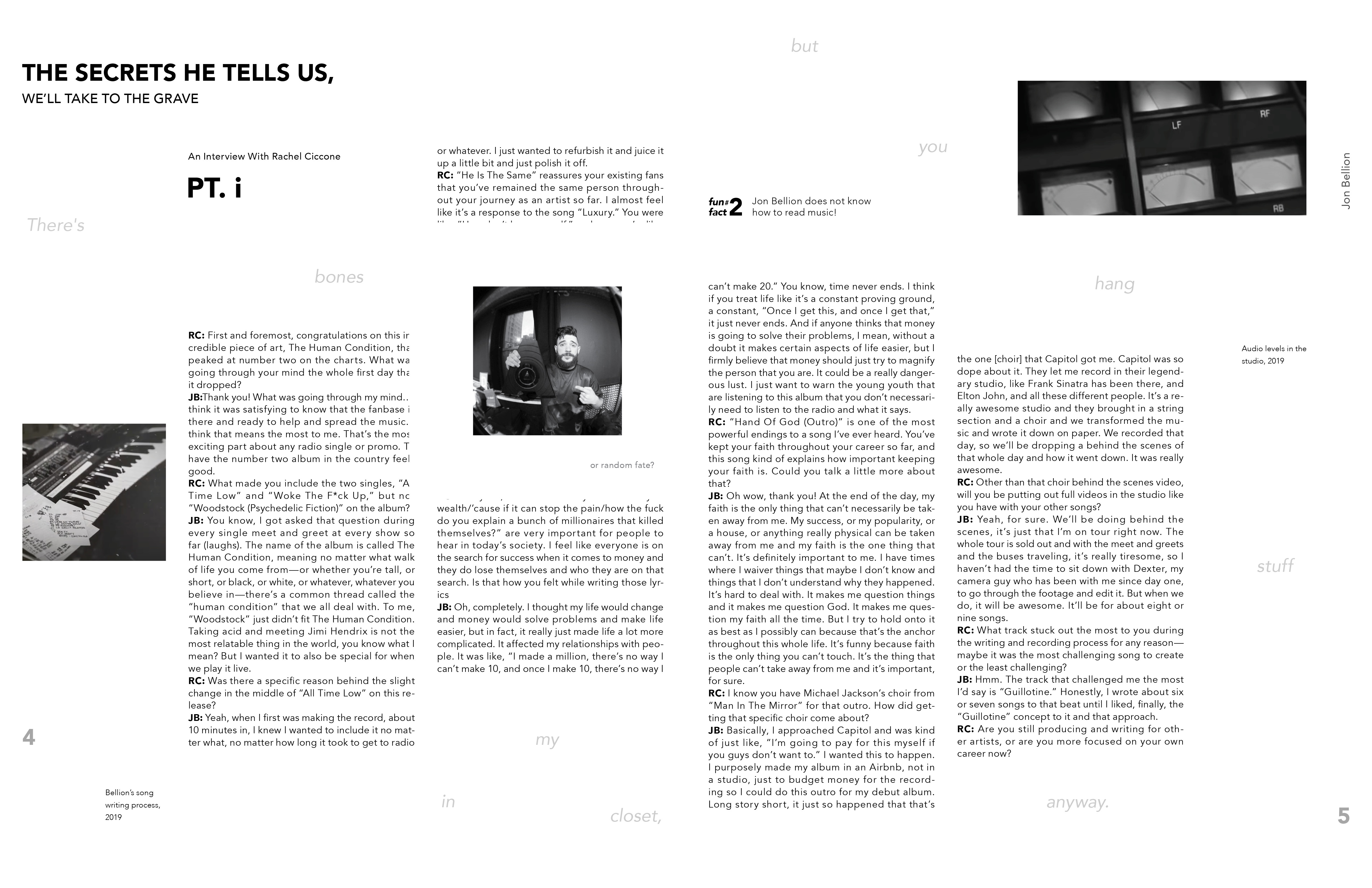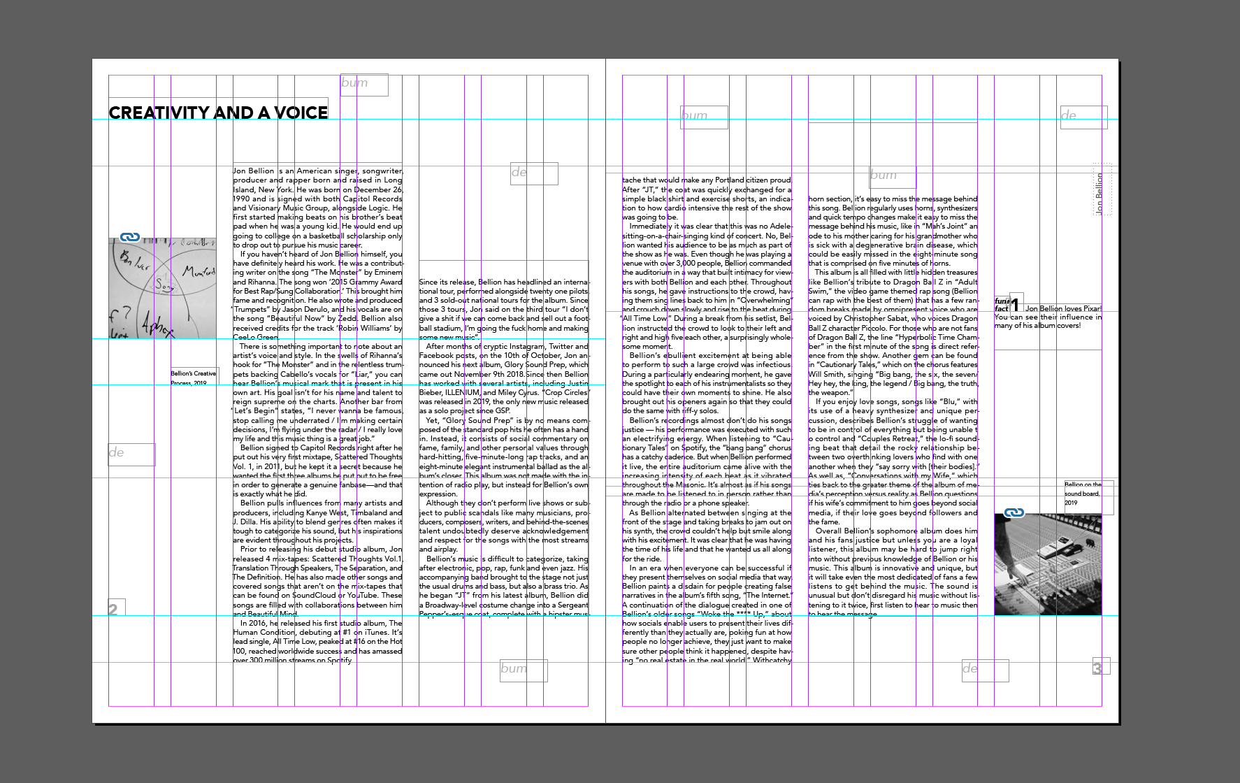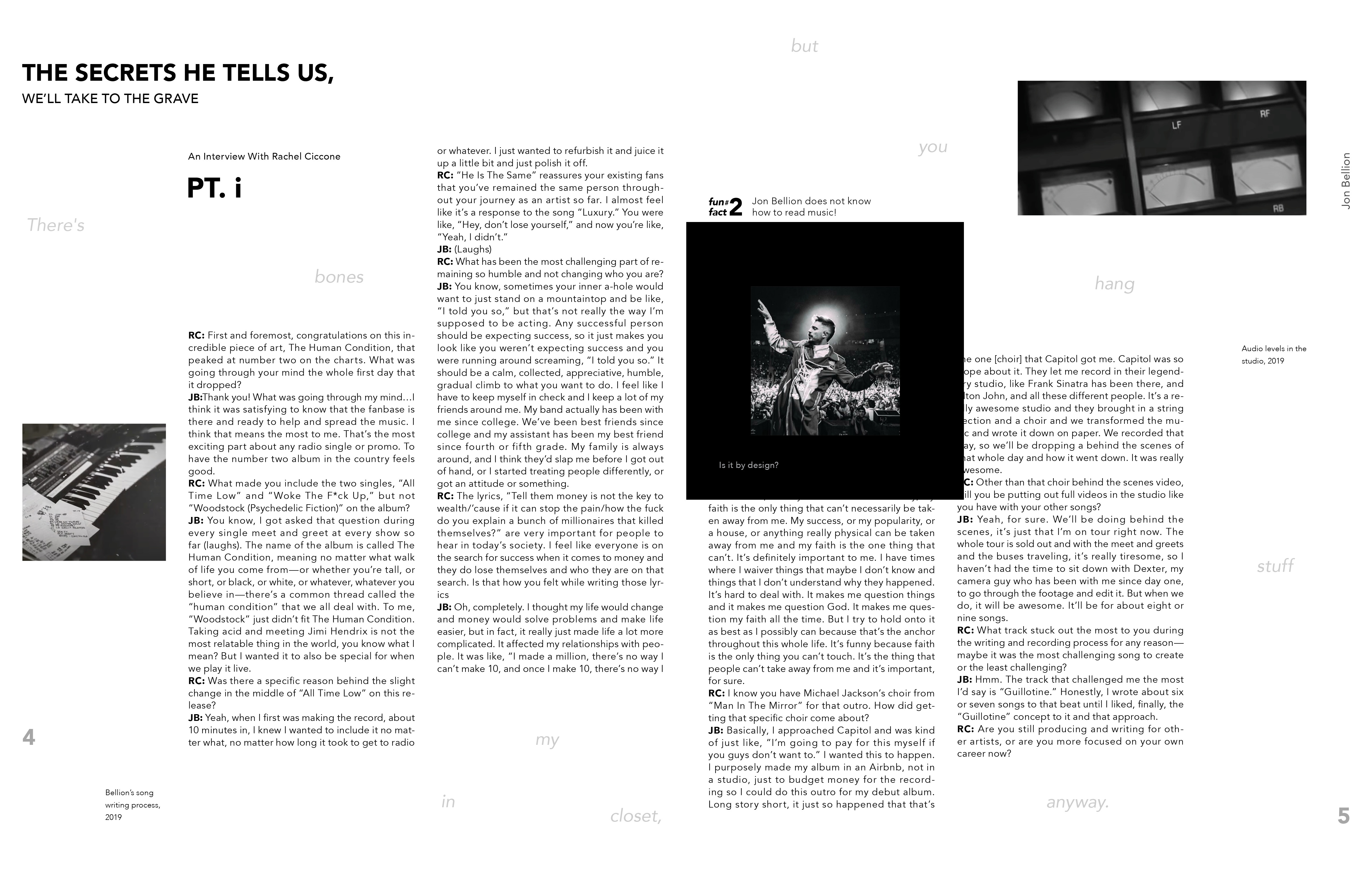 Work in Progres- To be printed soon! This is a book about Jon Bellion, which introduces you to him and his music. It is made to inform viewers about Jon Bellion and interest them to look into the artist. It includes a mini foldout in the center of the book which has a QR code that leads you to a custom playlist I curated to introduce viewers to Bellion's music.