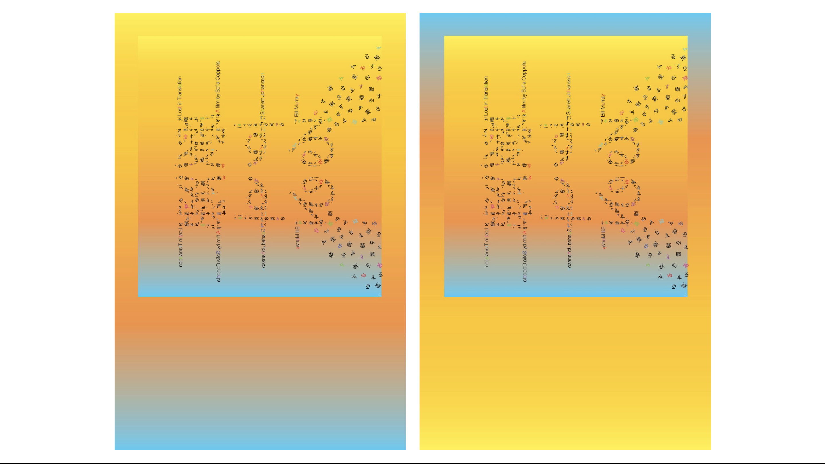 This is a movie poster for the re-release of "Lost in Translation", directed by Sofia Coppola. For this, we couldn't utilize any images from the movie and so my concept was to write the word "love" in Japanese and have it breaking apart and glitching. I was inspired by the city lights of Japan, ASCII art, and Japanese gradients