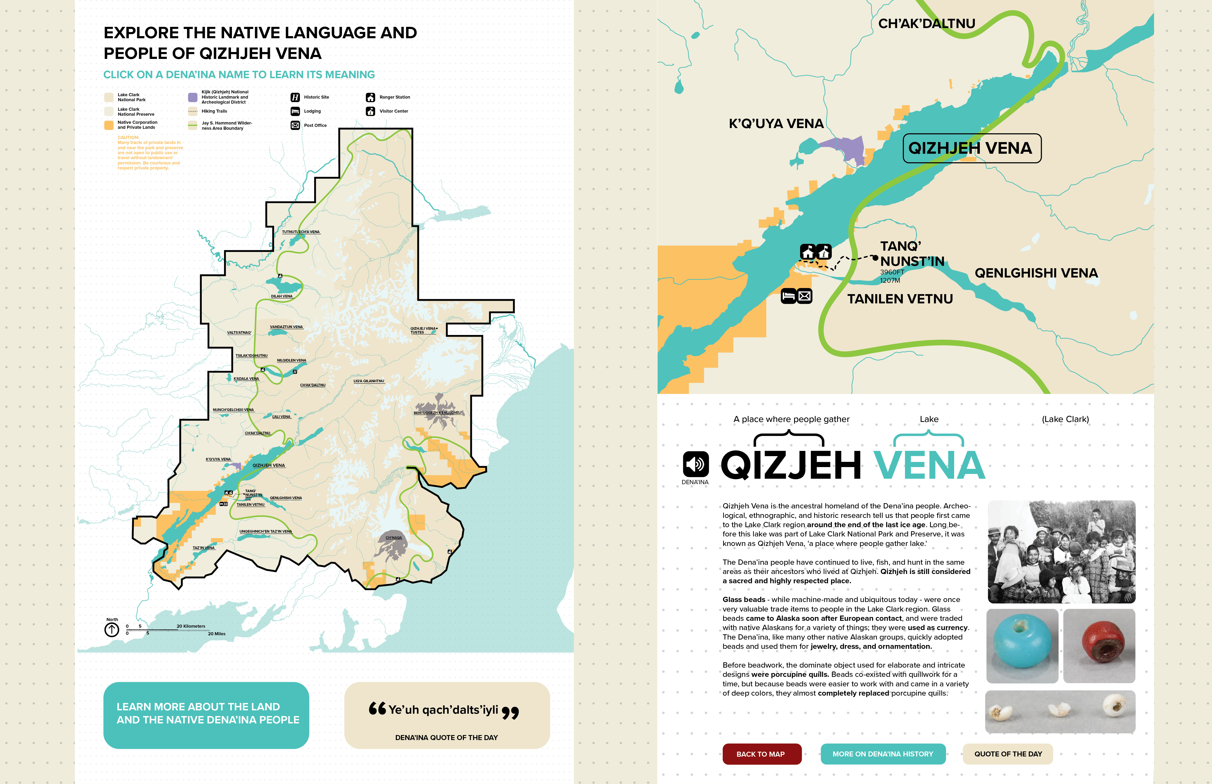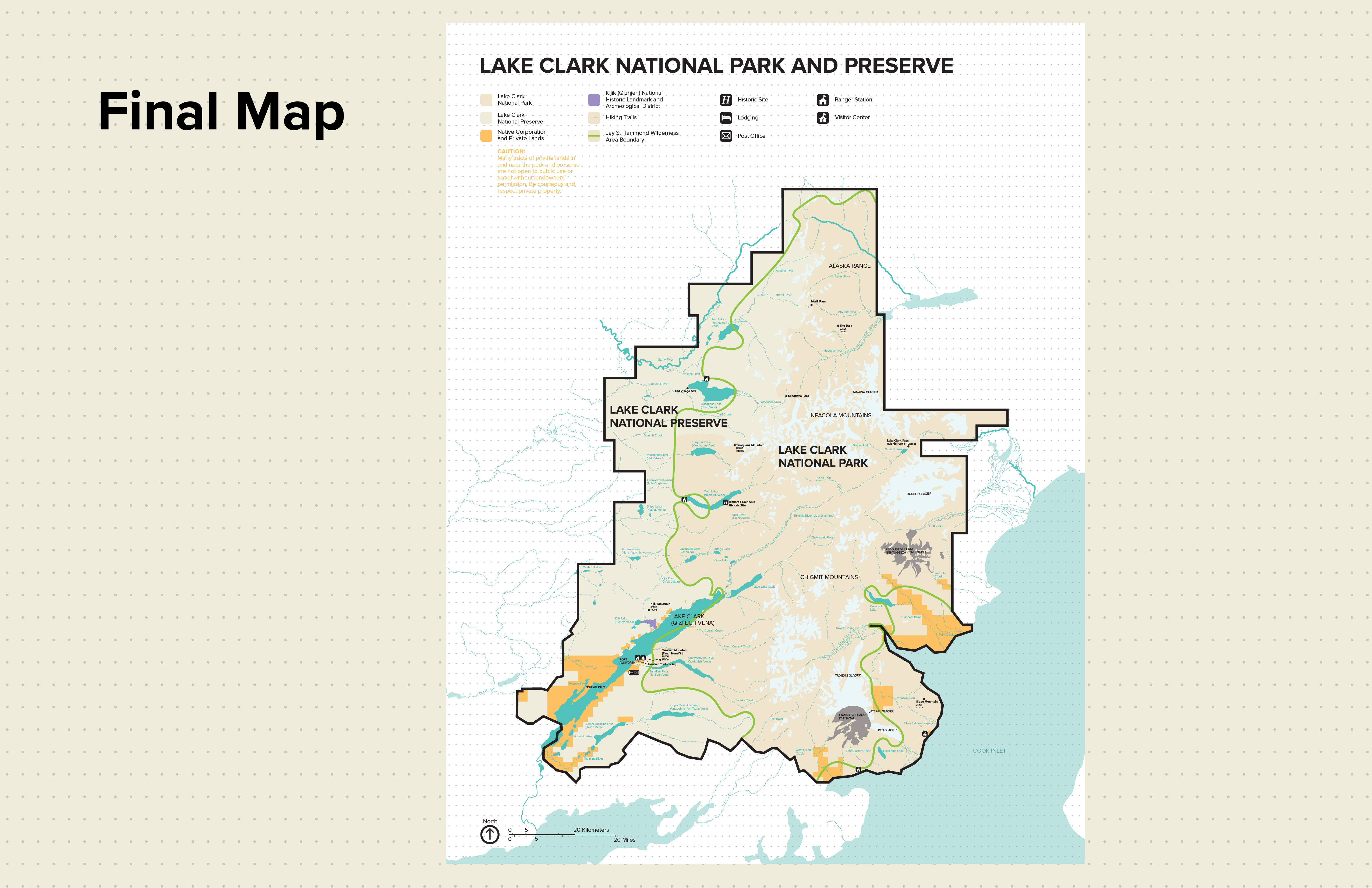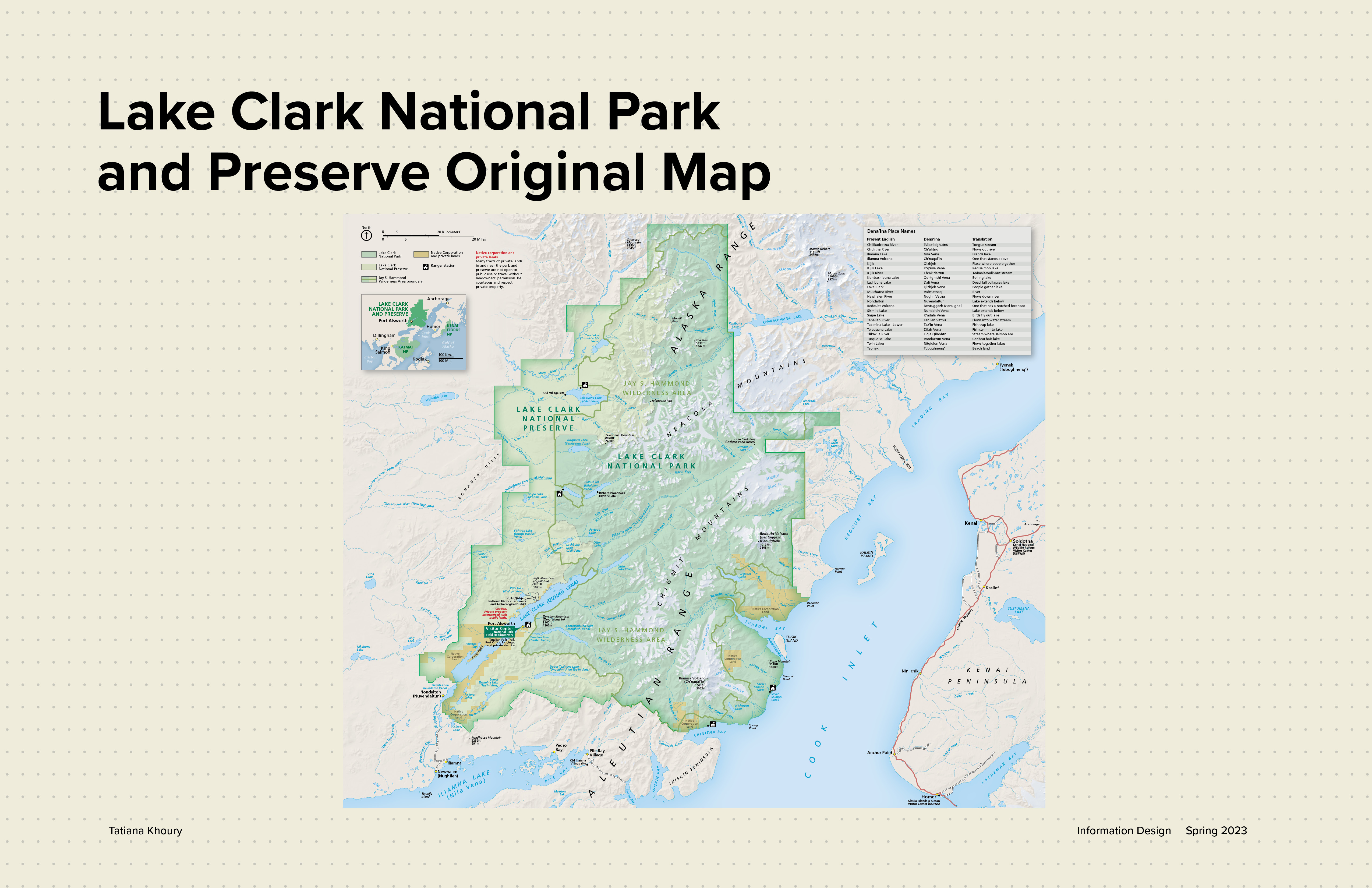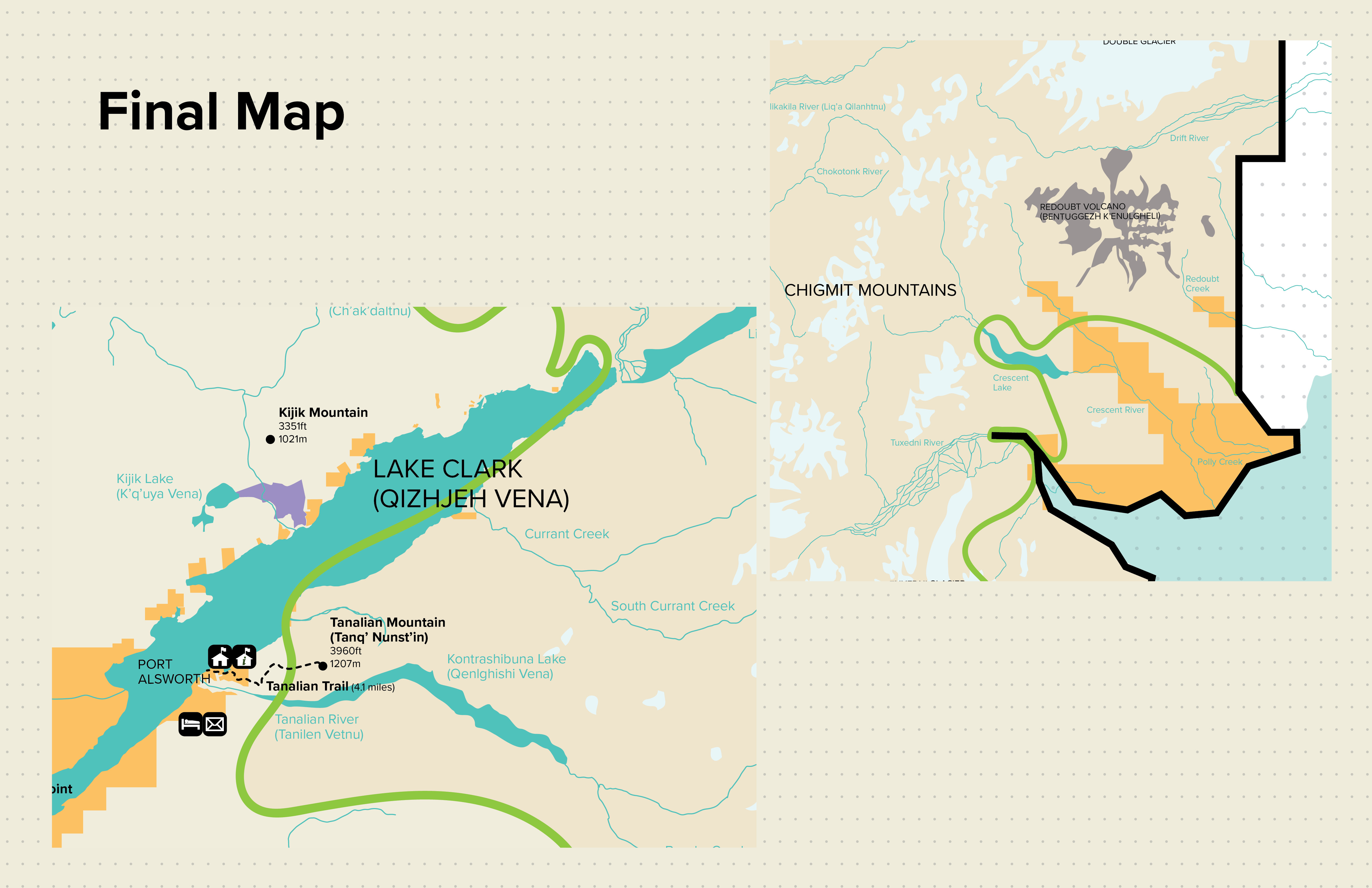 This map redesign for the National Park Service project was in collaboration with Austin Liu and Annika Lee. Each of us had different locations with different terrains. As a team, we decided on how every single detail of the map would be designed. After we created the system and implemented it, each person created their own extension of the map. For my map I decided to focus on the native people of Lake Clark National Park in Alaska, the Dena'ina.