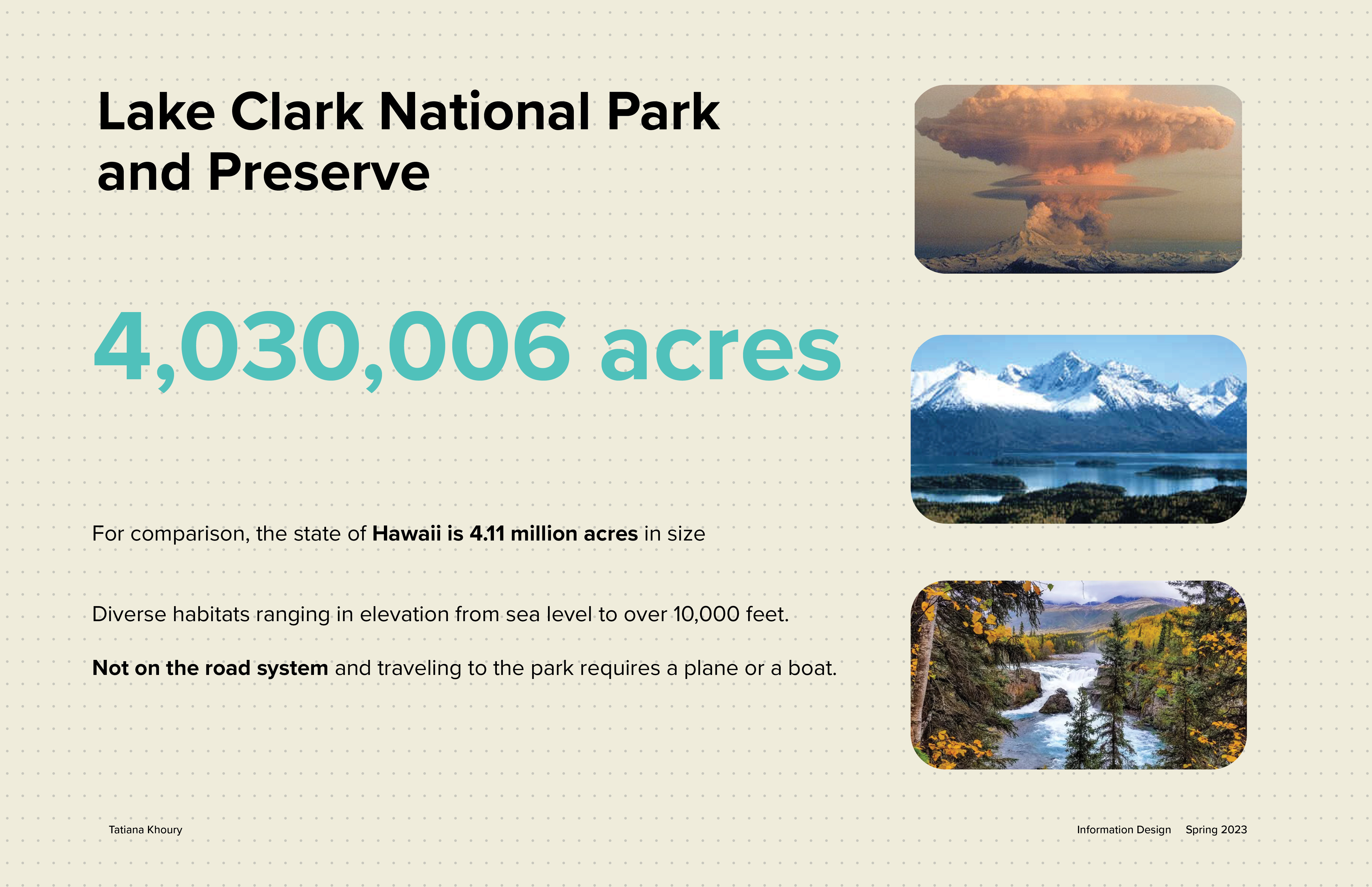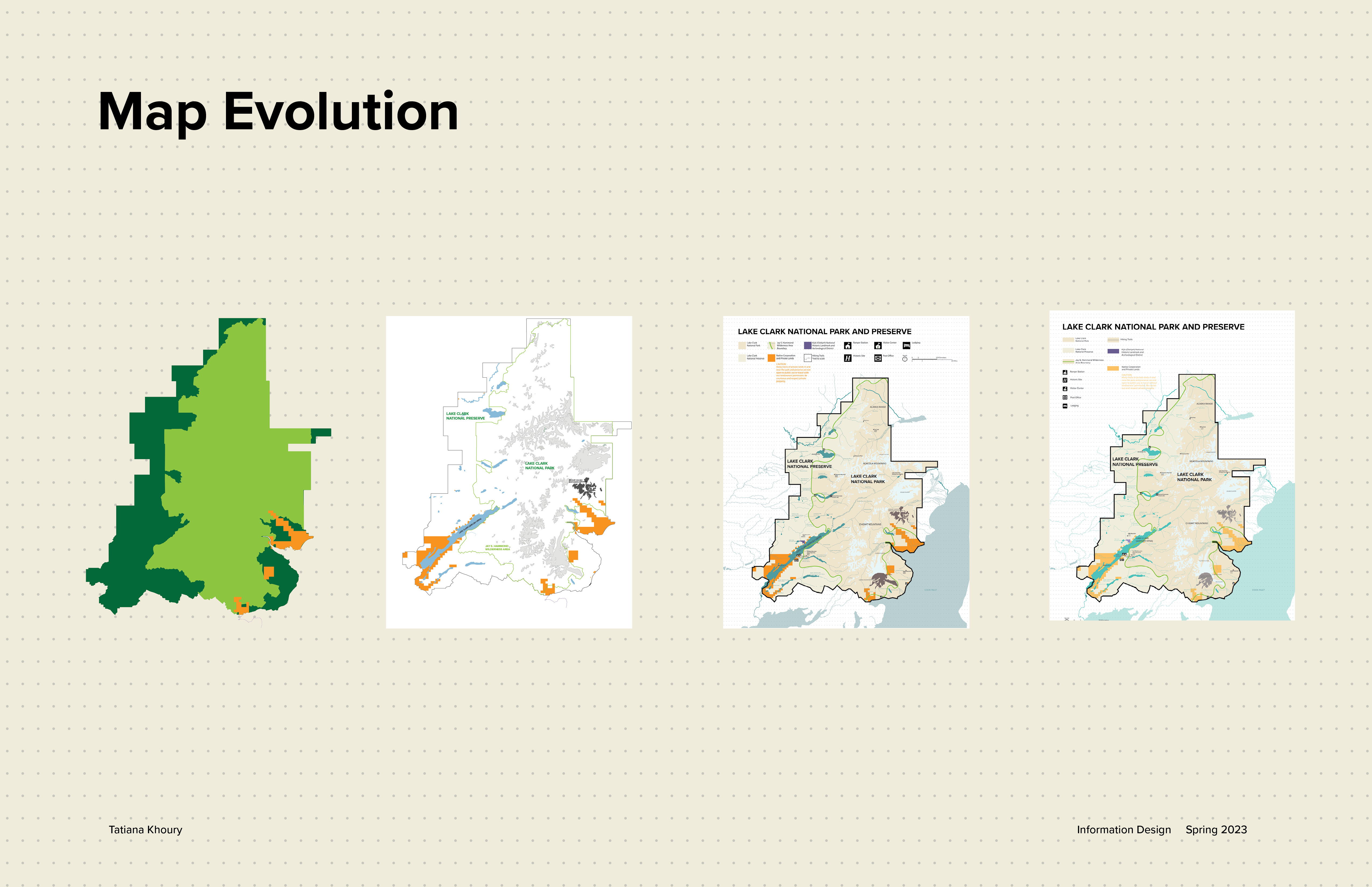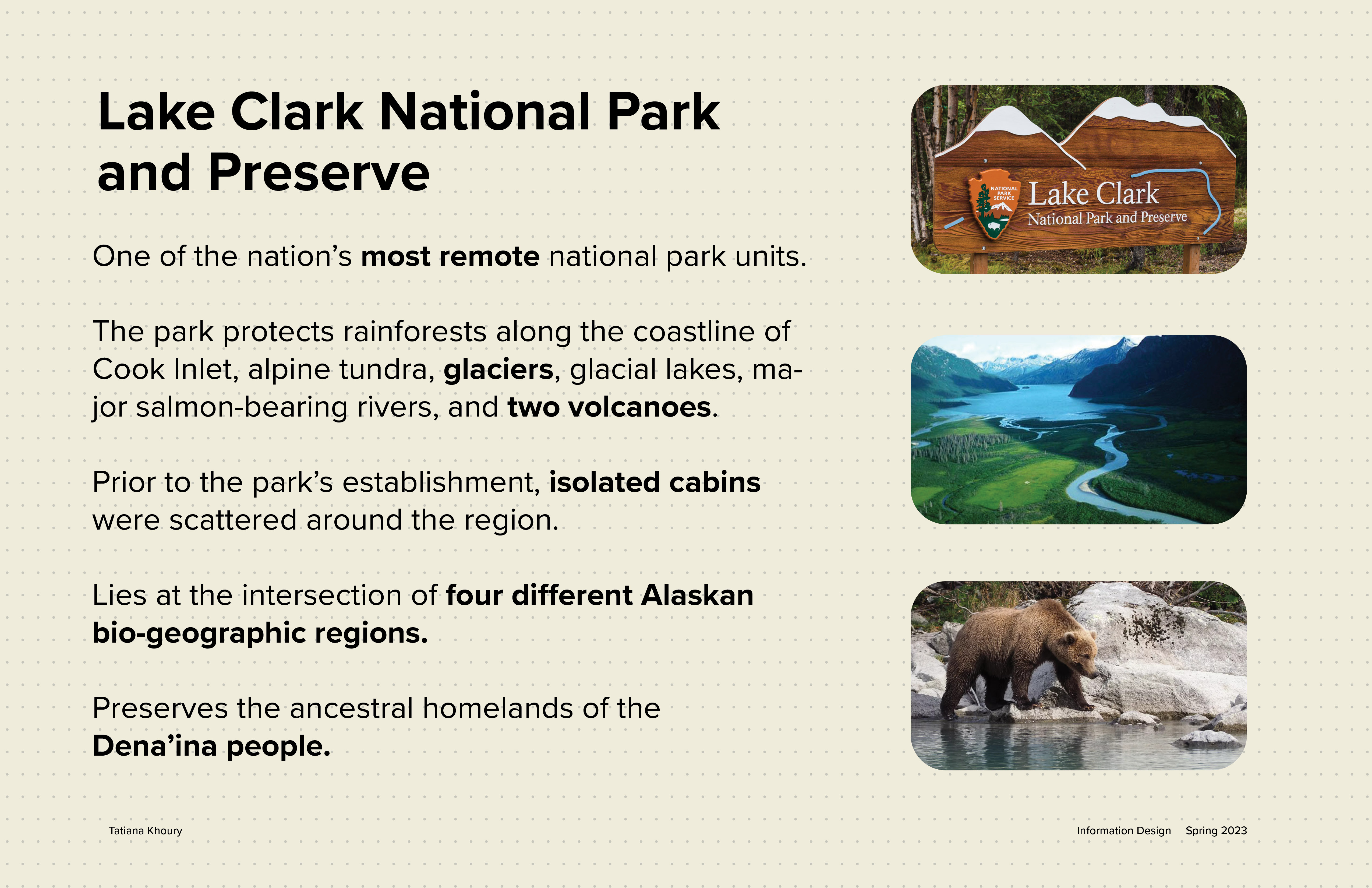 This map redesign for the National Park Service project was in collaboration with Austin Liu and Annika Lee. Each of us had different locations with different terrains. As a team, we decided on how every single detail of the map would be designed. After we created the system and implemented it, each person created their own extension of the map. For my map I decided to focus on the native people of Lake Clark National Park in Alaska, the Dena'ina.