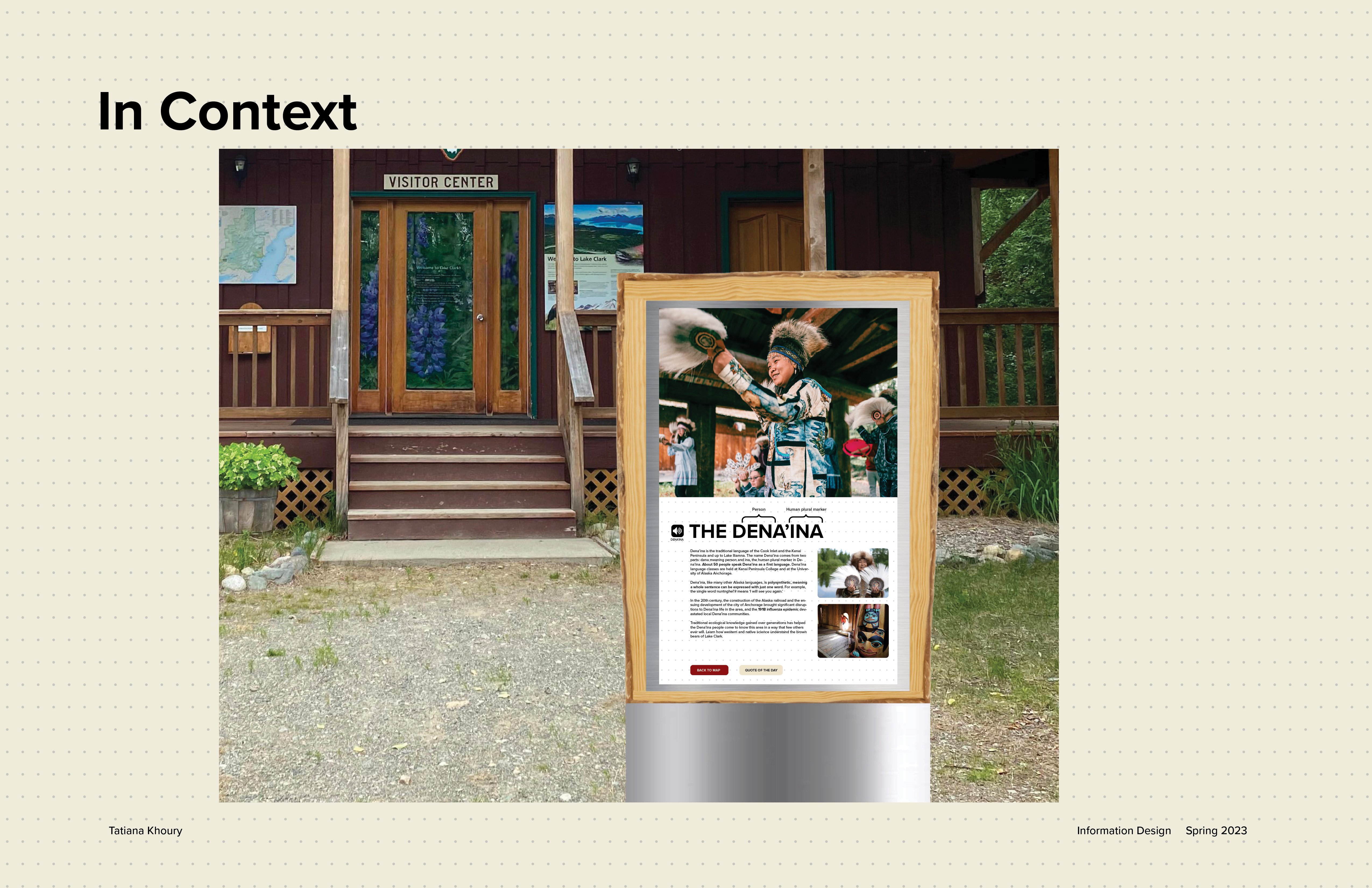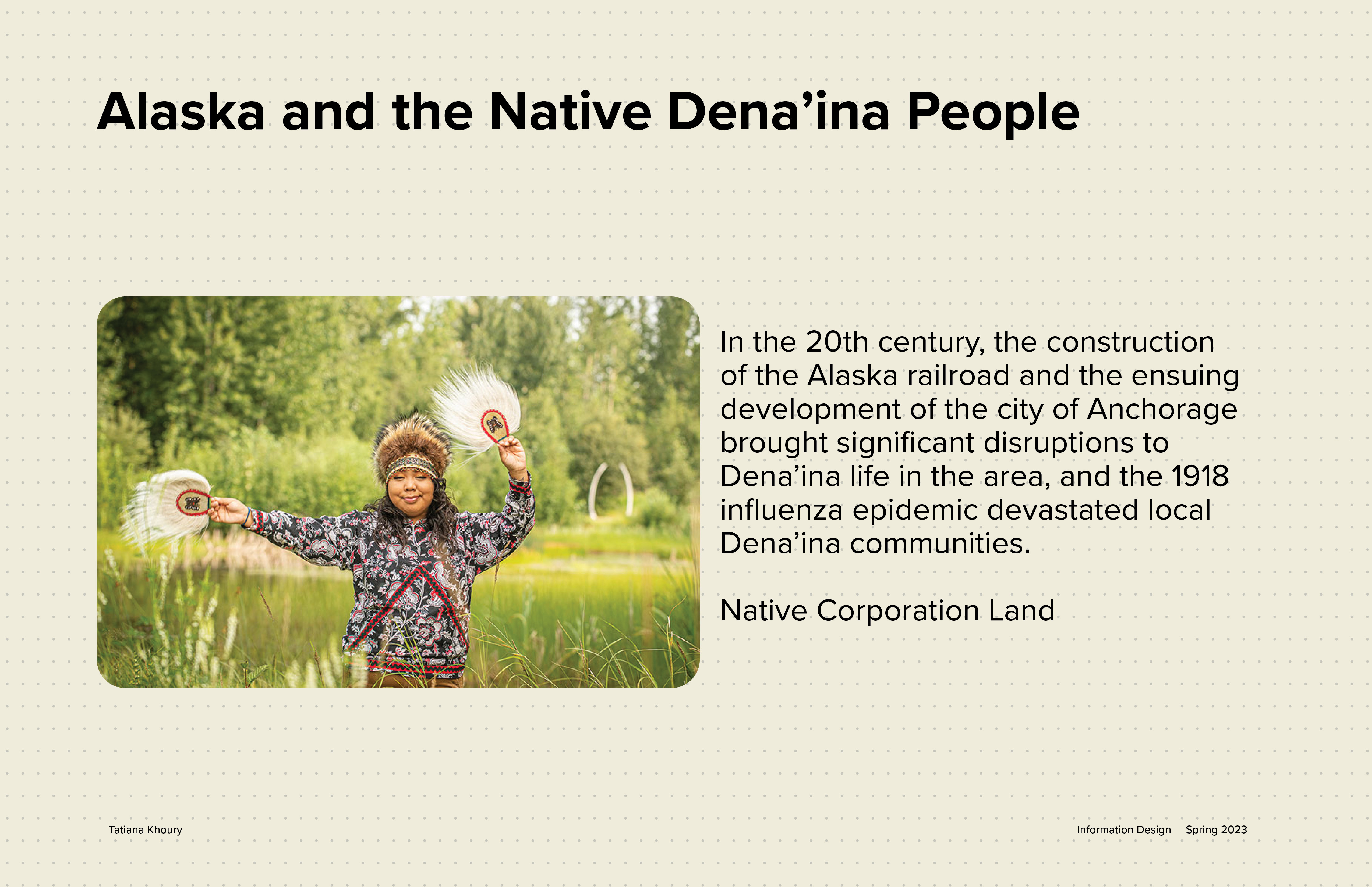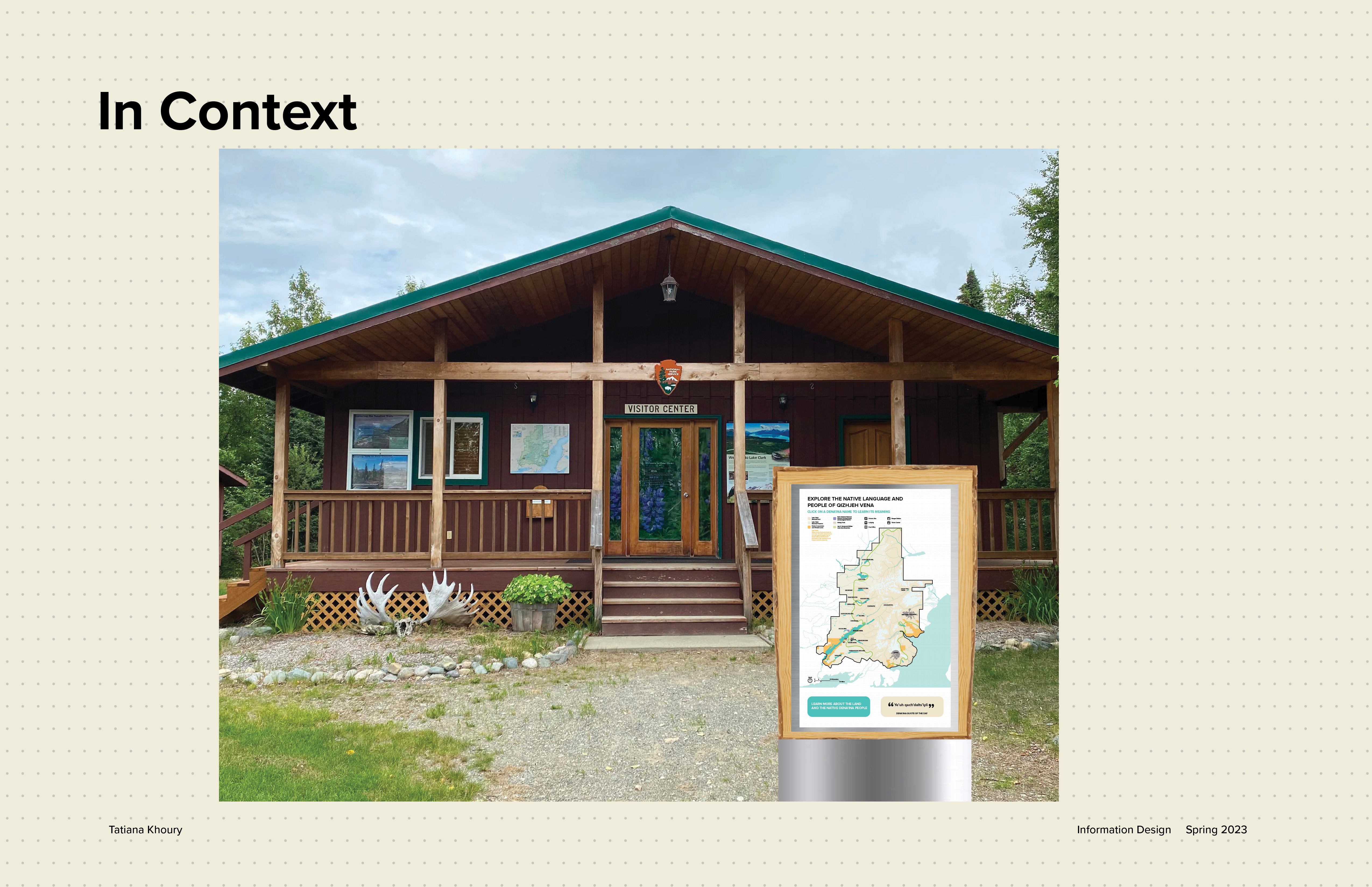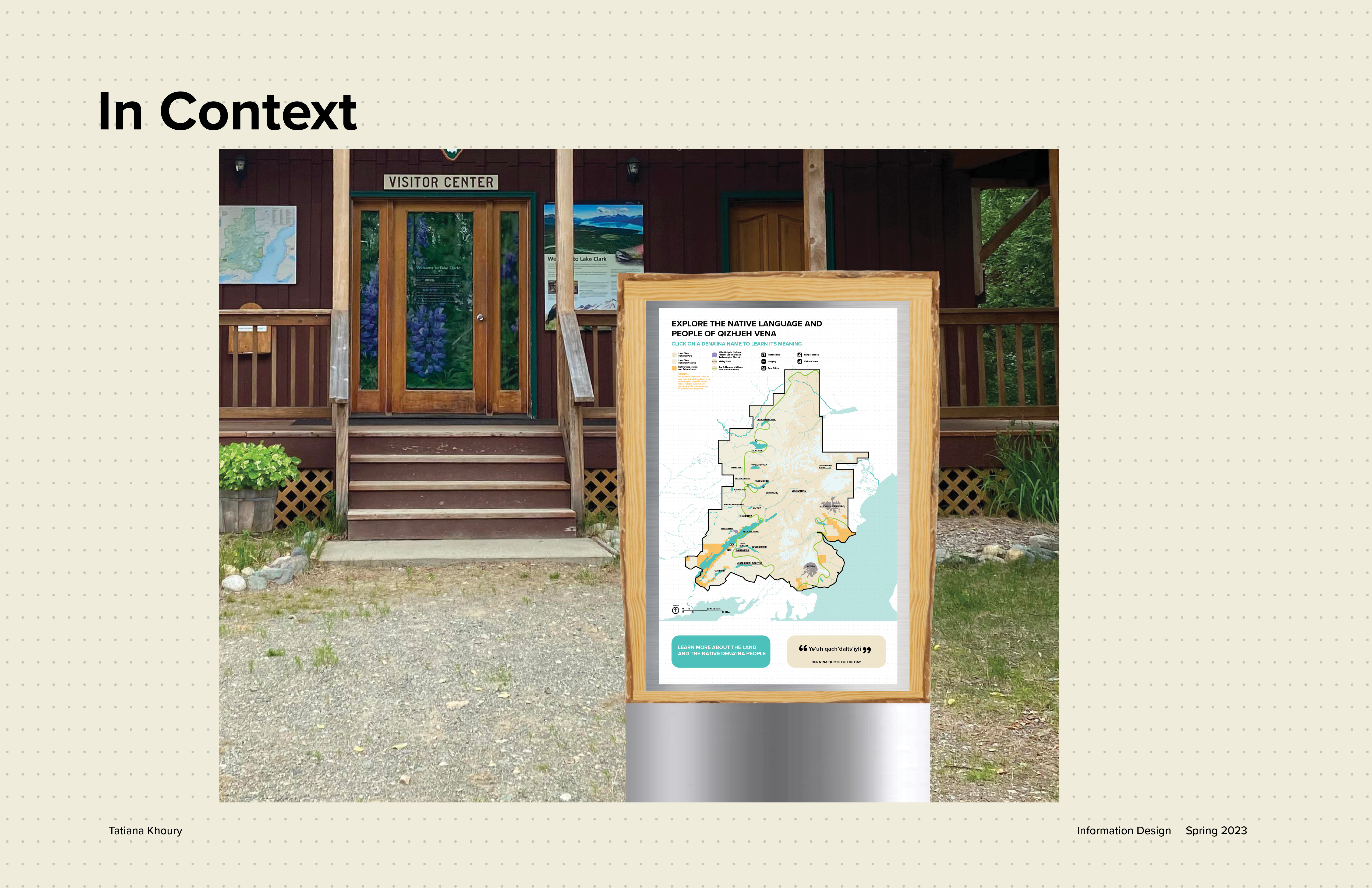 This map redesign for the National Park Service project was in collaboration with Austin Liu and Annika Lee. Each of us had different locations with different terrains. As a team, we decided on how every single detail of the map would be designed. After we created the system and implemented it, each person created their own extension of the map. For my map I decided to focus on the native people of Lake Clark National Park in Alaska, the Dena'ina.