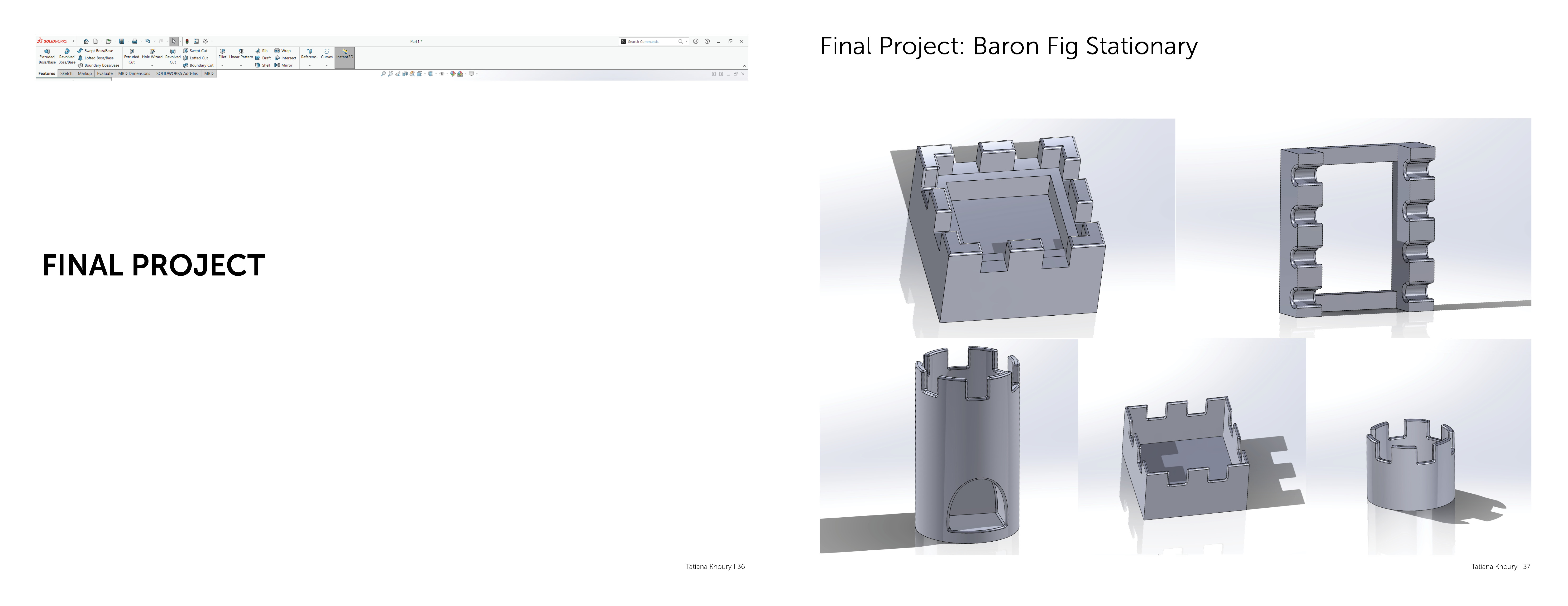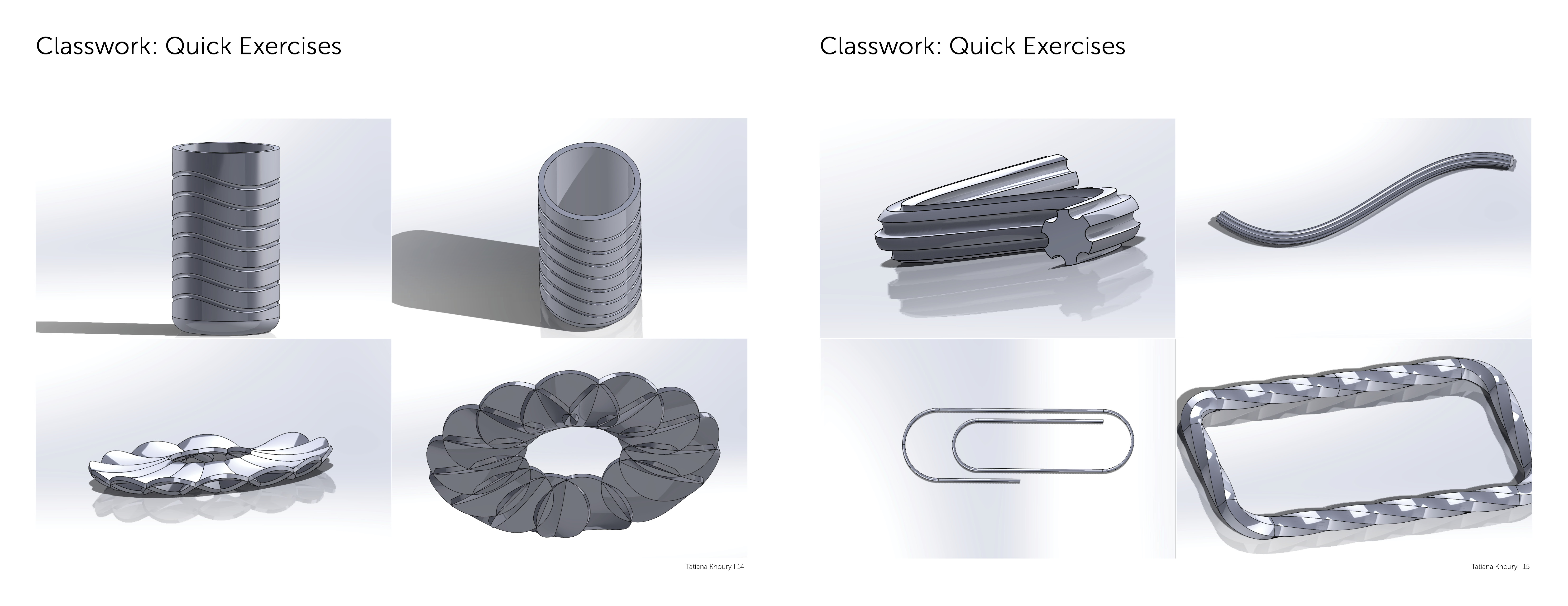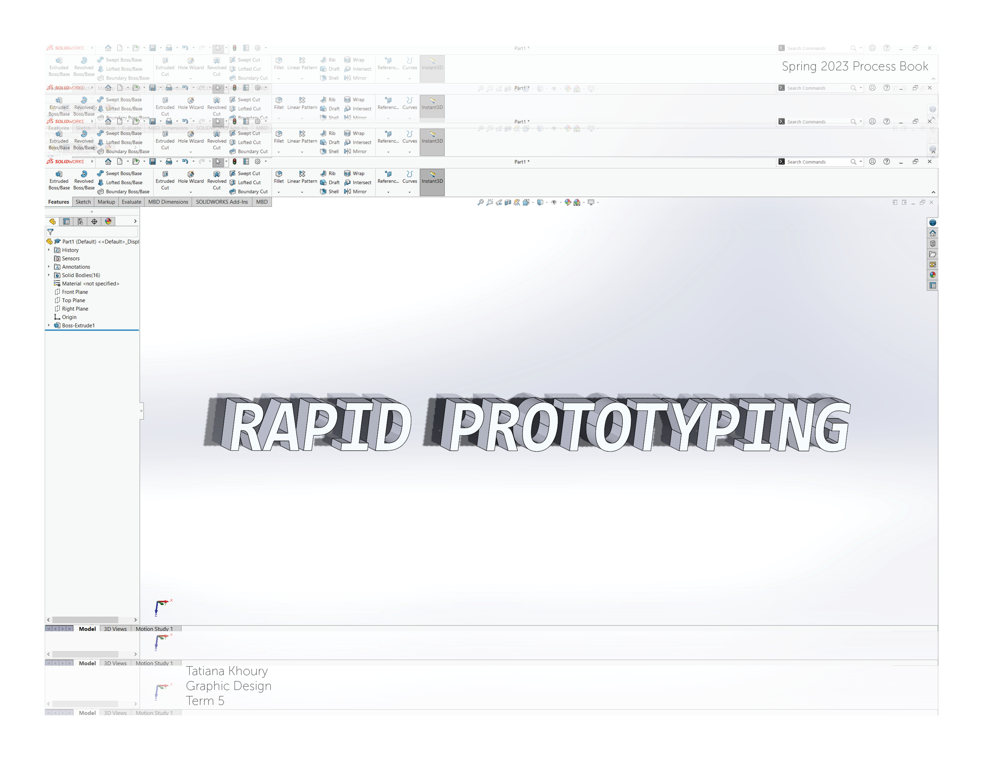 This is my documentation of everything I created in Rapid Prototyping. It includes classwork, homework and full projects. Although a lot of these were difficult for me to complete, it is very rewarding for me to see my progress from week 2 all the way to week 14. For the design of the book, I used the interface of Solidworks to create my cover and divider pages!