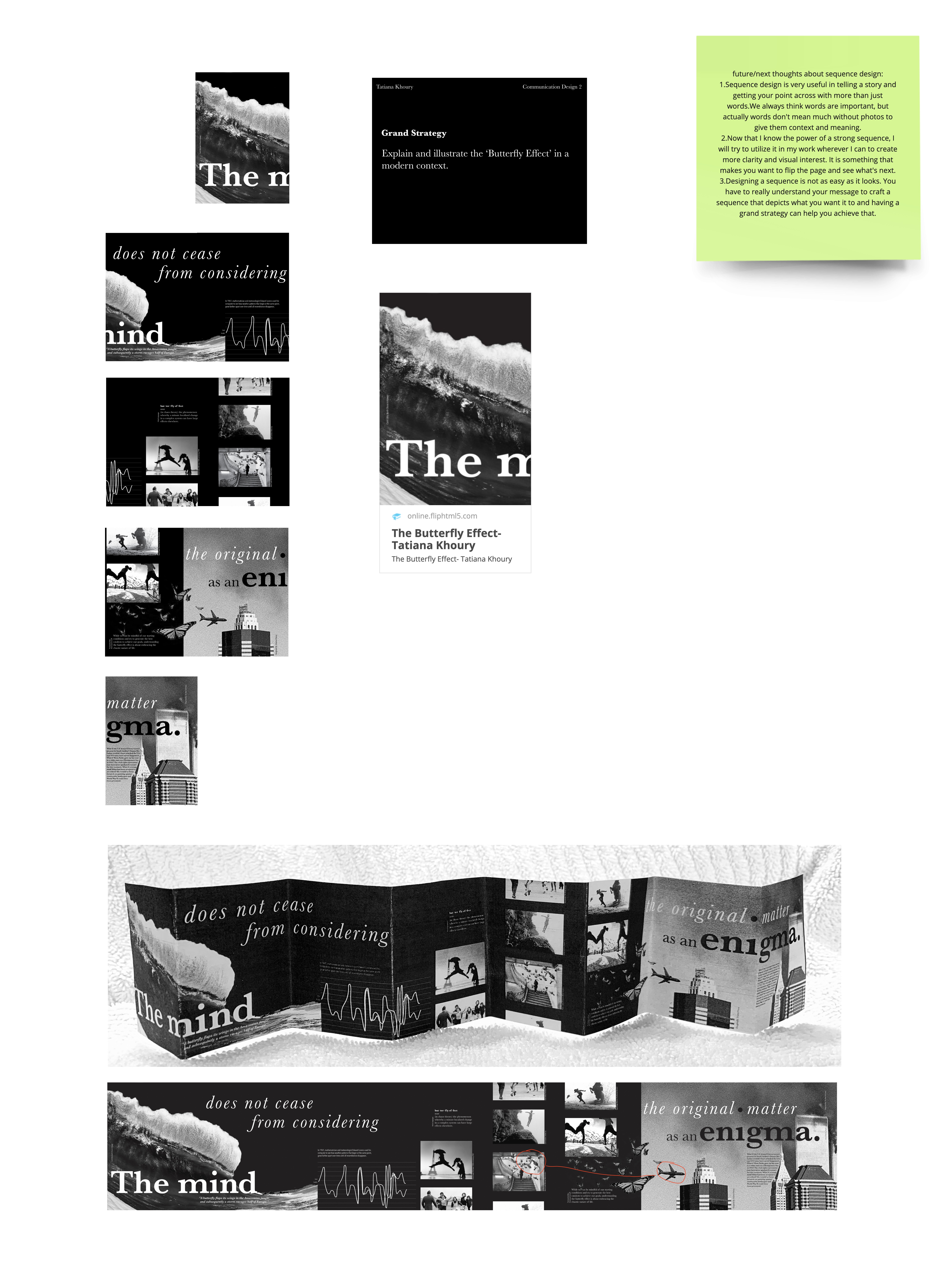 Sequence design is very useful in telling a story and getting your point across with more than just words. Understanding and utilizing word and image interdependency is probably my biggest takeaway from this. Also being conscious of folds and designing strategically, to keep the viewer wanting to turn the page. I also learned the importance of a grand strategy to make sure that every element included supports your goal, and this really helped me focus on my message.