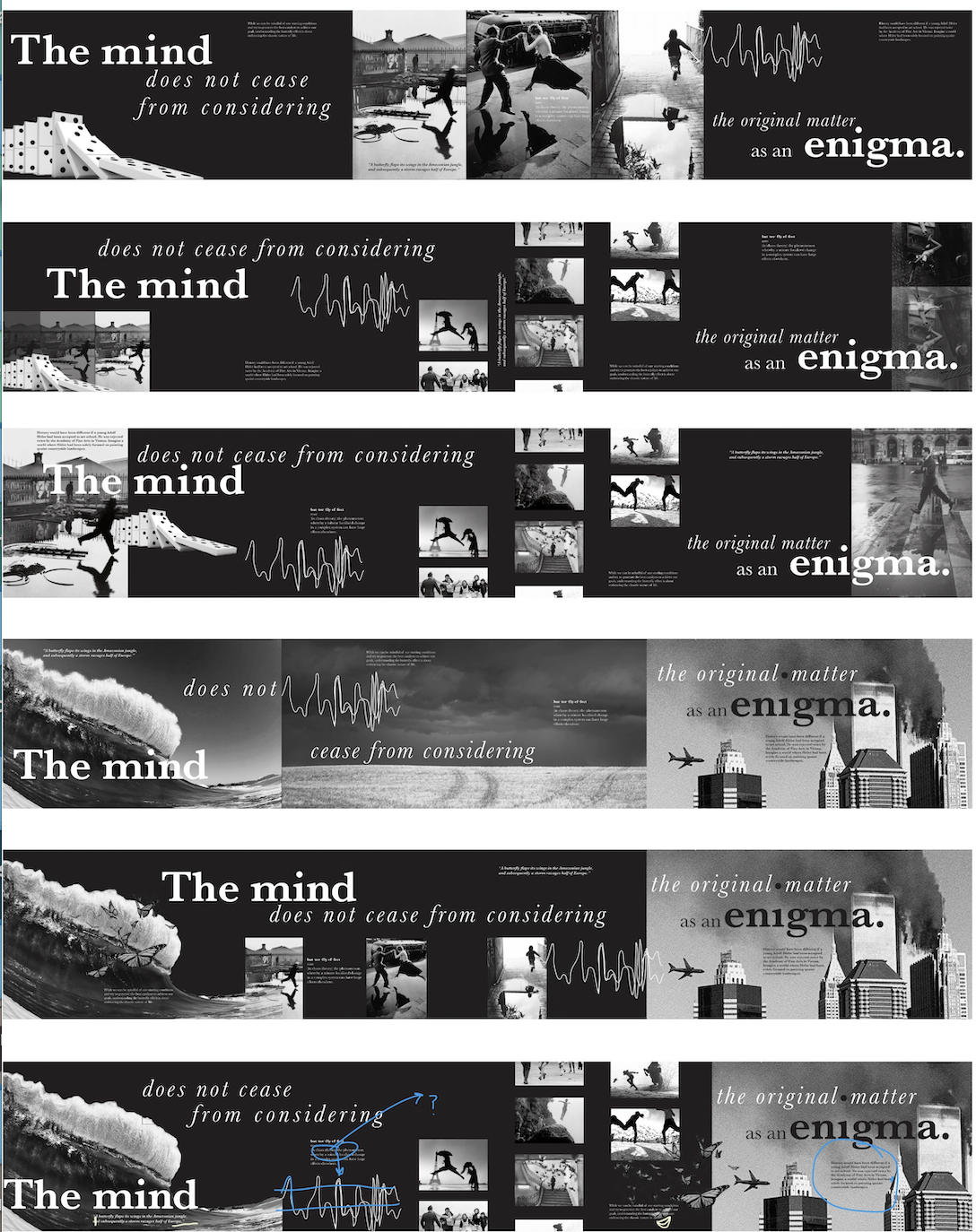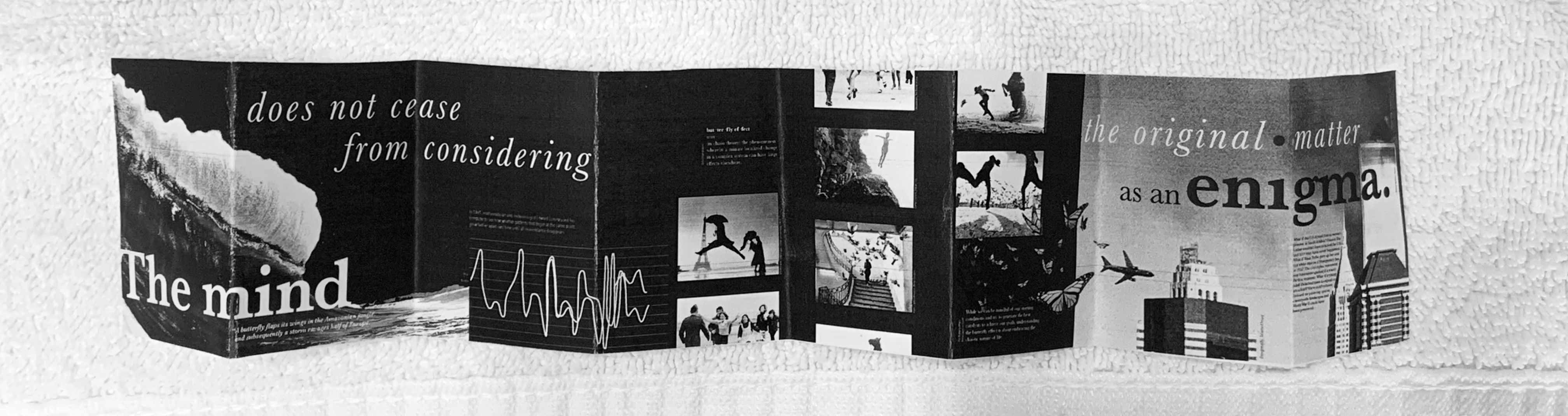 This is a folding booklet about 'The Butterfly Effect.' As you flip through, (link to FLIPHTML below), you learn about what the butterfly effect is and how it came to be. It allows you to think deeply about how things occur. This is accompanied by images of moment photography, an infographic, and real-life examples of this phenomenon. This was completed over 7 weeks and began with two ideas; Hannah Hoch and Roland Barthe's essay "Plastic."