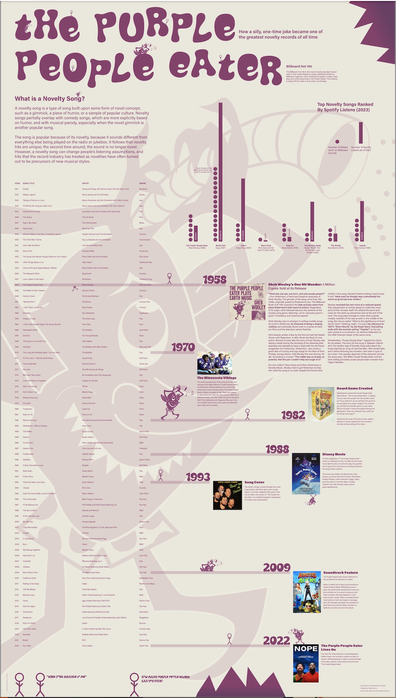 The Purple People Eater is a timeline poster that examines the Billboard Hot 100 songs for the week of my birthday, June 22nd from 1941-2022. After compiling my data, I created a playlist of all the songs and listened to them. The Purple People Eater stuck out to me, because of the many references to the song/character through time. The poster includes the character hidden throughout and encourages you to see how many you can find! It also includes information on what a novelty song is!