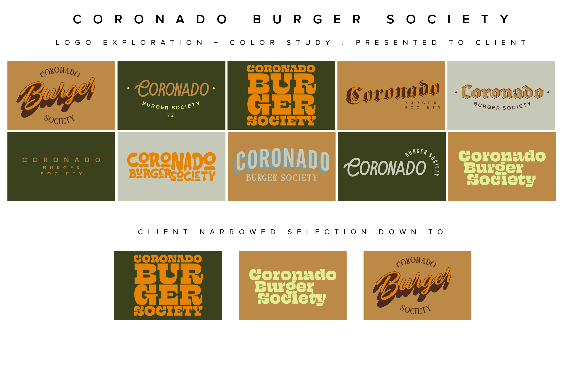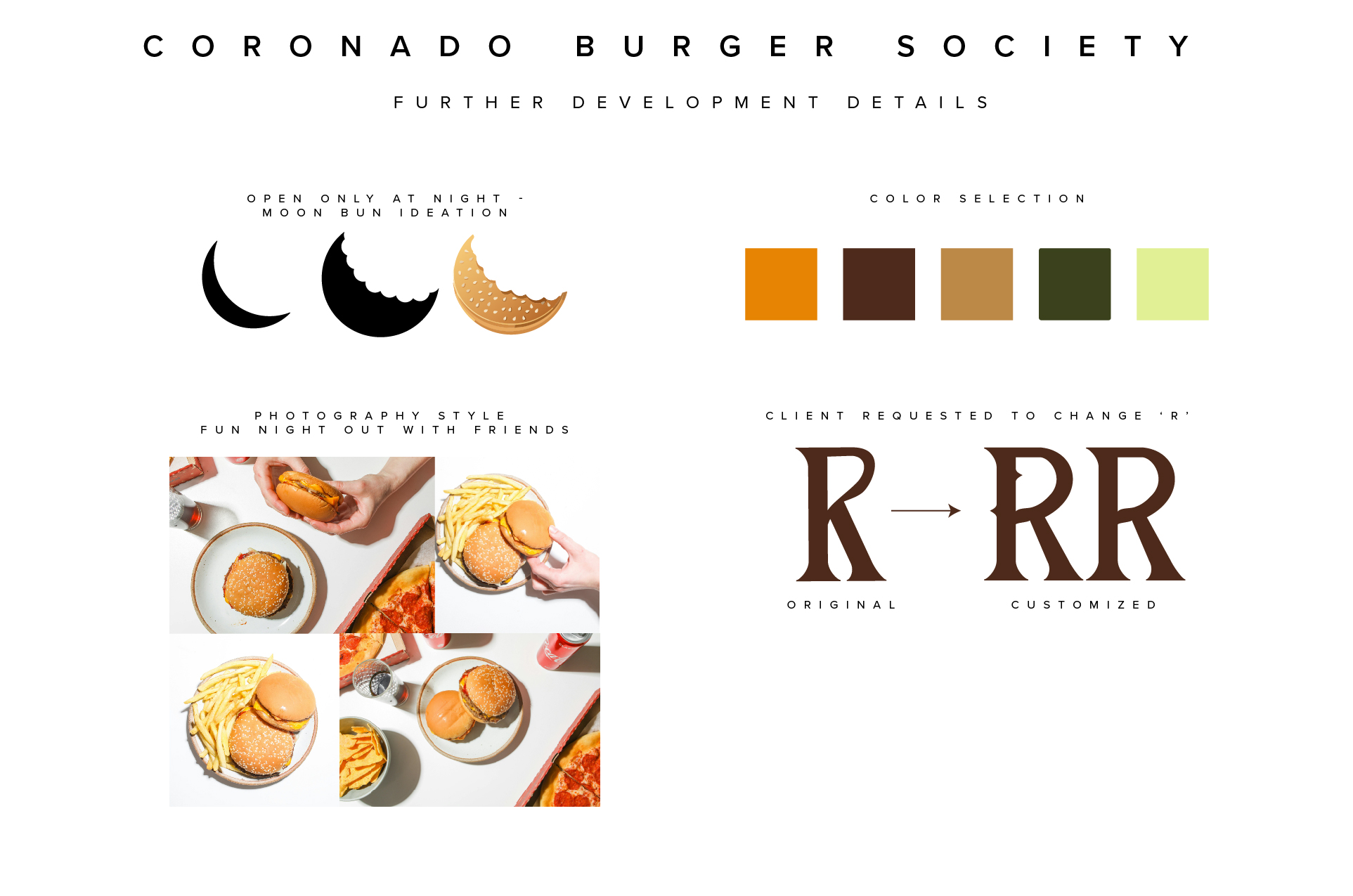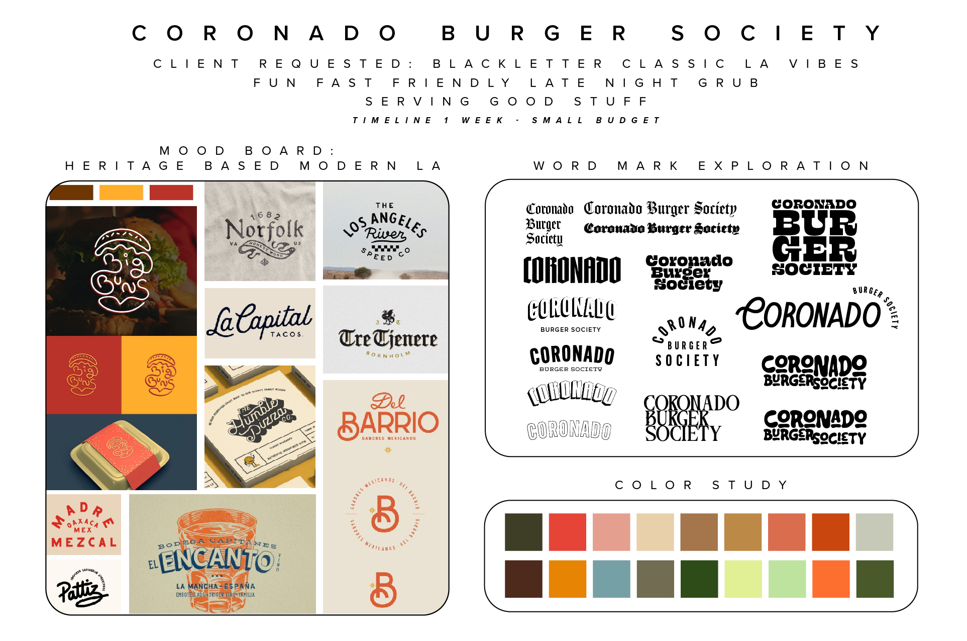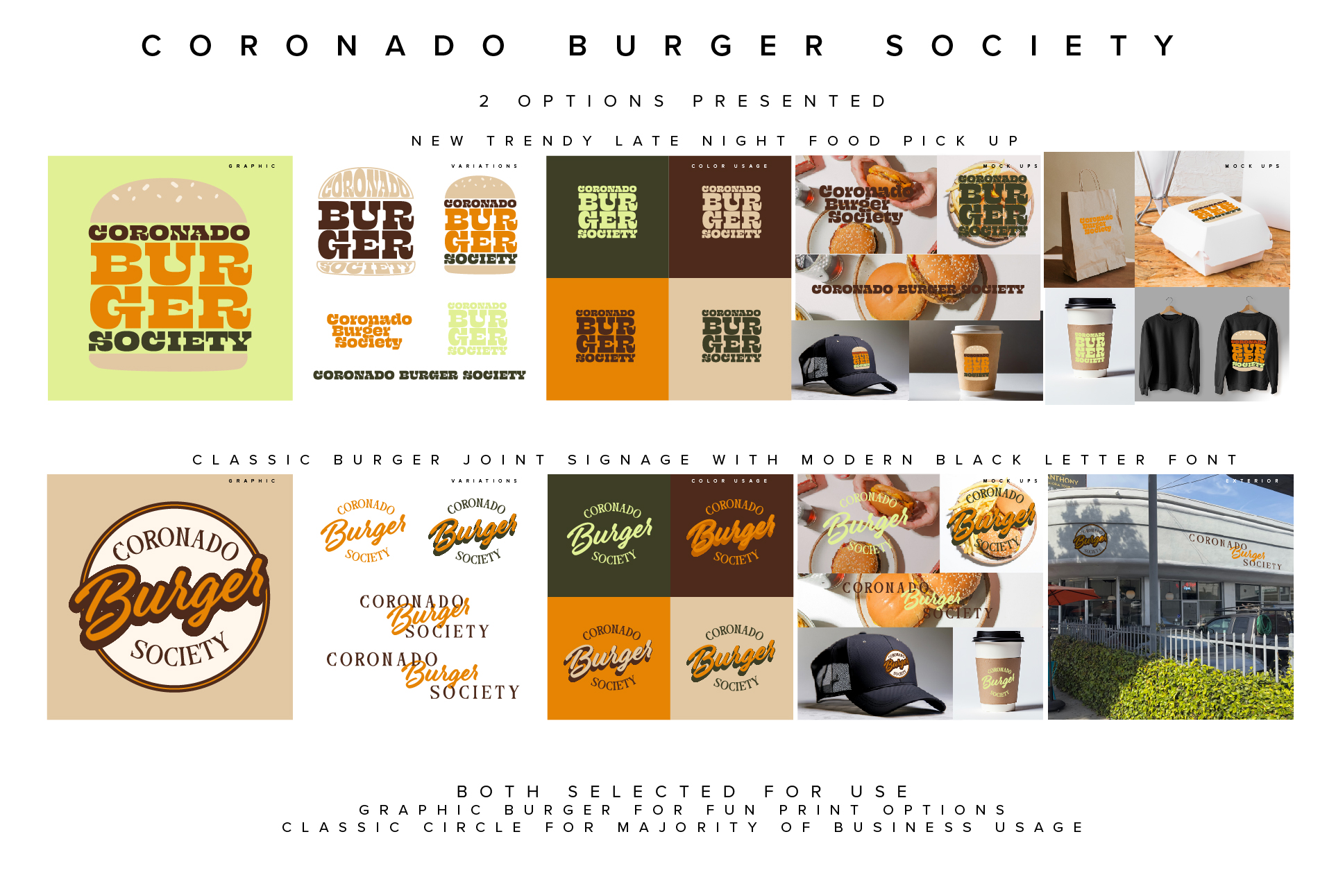 An existing client, Biscuit and Bean LA, reached out to me with an idea. They wanted to keep their restaurant open all day and night! But to add the extra hours at night they wanted to swap over to a late-night pick-up-only joint for burgers and coffee. With this idea, the Coronado Burger Society was born. I was given a tight deadline of a week, with a minimal budget, to create a logo, style, and examples of implementation for their investors.
