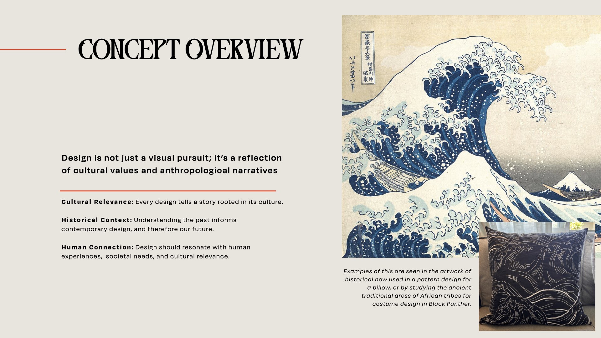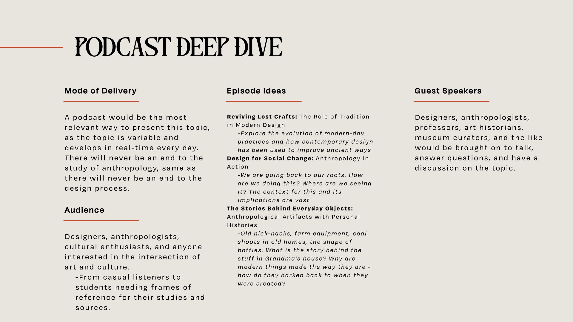 This presentation is a proposal for a podcast based on my takeaways from Branding and Design History, and our speaker's presentations. I am passionate about incorporating the cultural and anthropological reasoning and relevancy of matters into my design work. This proposed podcast would cover how you can study anthropology through design.
