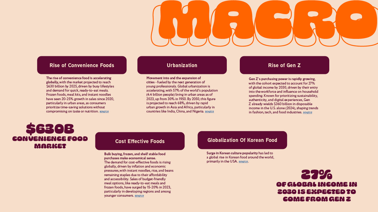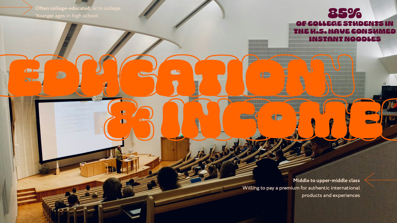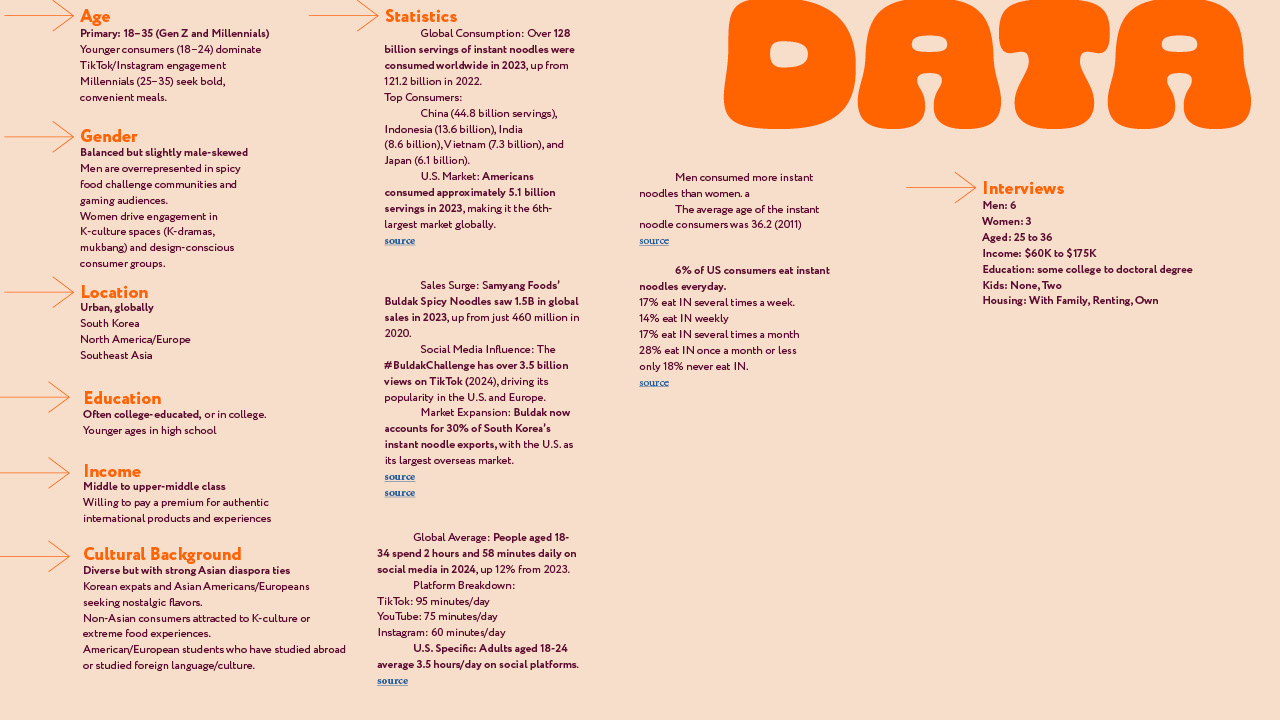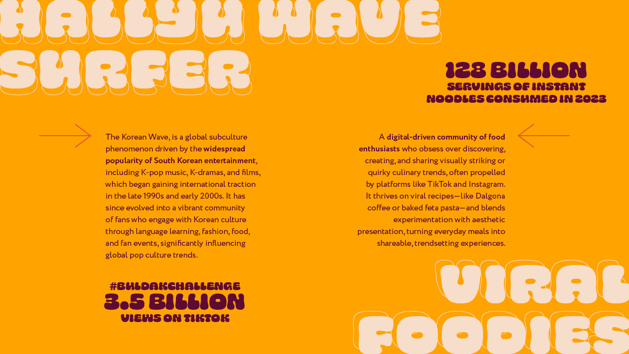 In this ethnography, I explore the viral Korean food phenomenon of Buldak Spicy Ramen. I developed the design target by analyzing the consumption and aspirational audiences and influencers. Through thorough research of the audience and their connections to Korean culture, I identified relevant global trends. Interviews helped me uncover key tensions for the design target and identify the characteristics that make them magnetic, forming a solid foundation for brand development.