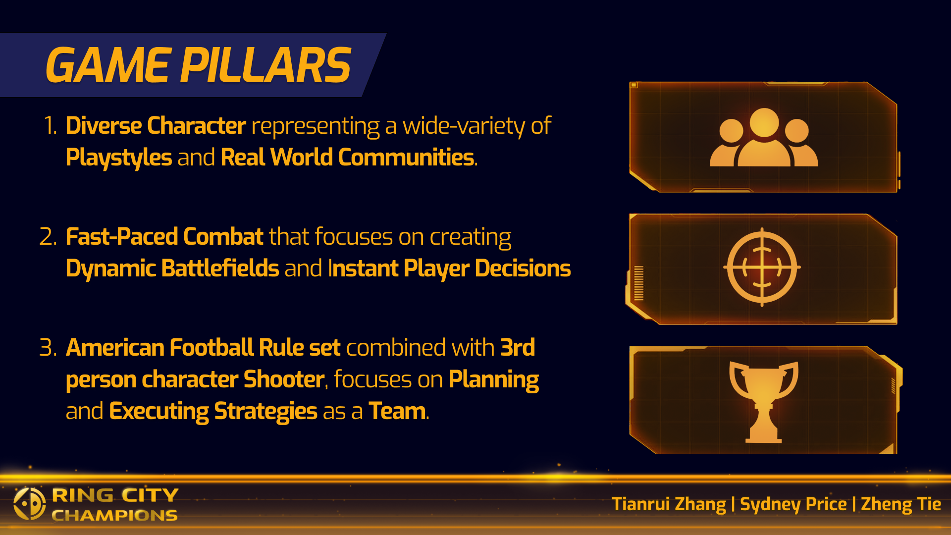 Ring City Champions is an Online 3rd Person Character Shooter with Sports Elements that has similar rules with American football. Two teams of 3 players will contest the power ball in a futuristic space stadium, as athletes with unique kits and abilities. The project is developed with unity by a team of 25+ members across different department. My role on the team was game director and game design lead.