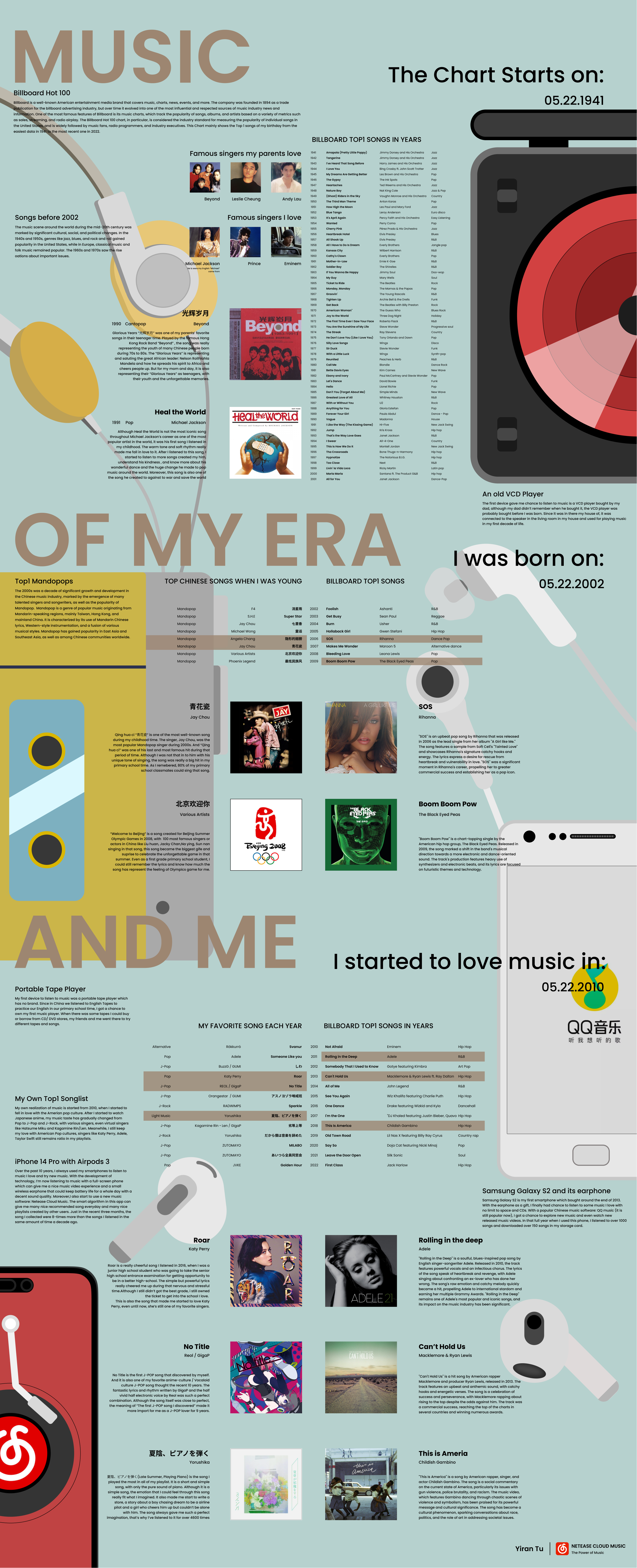 This is the first poster which I decided to how multiple information on it, it also includes three different parts to tell the story of billboard, Chinese songs and also the songs I like, after making this poster, I had a better sense of managing complex information in one poster, also helpful for me to manage and design the screen-based interface.