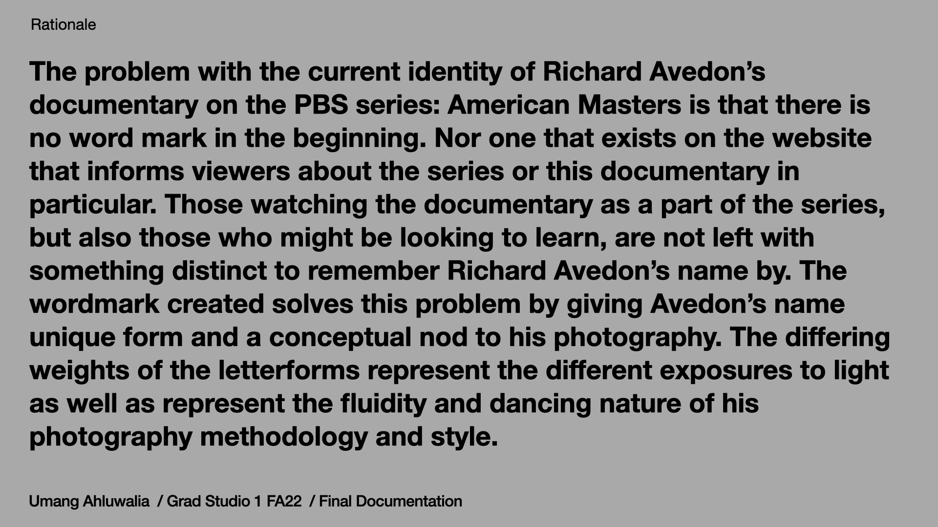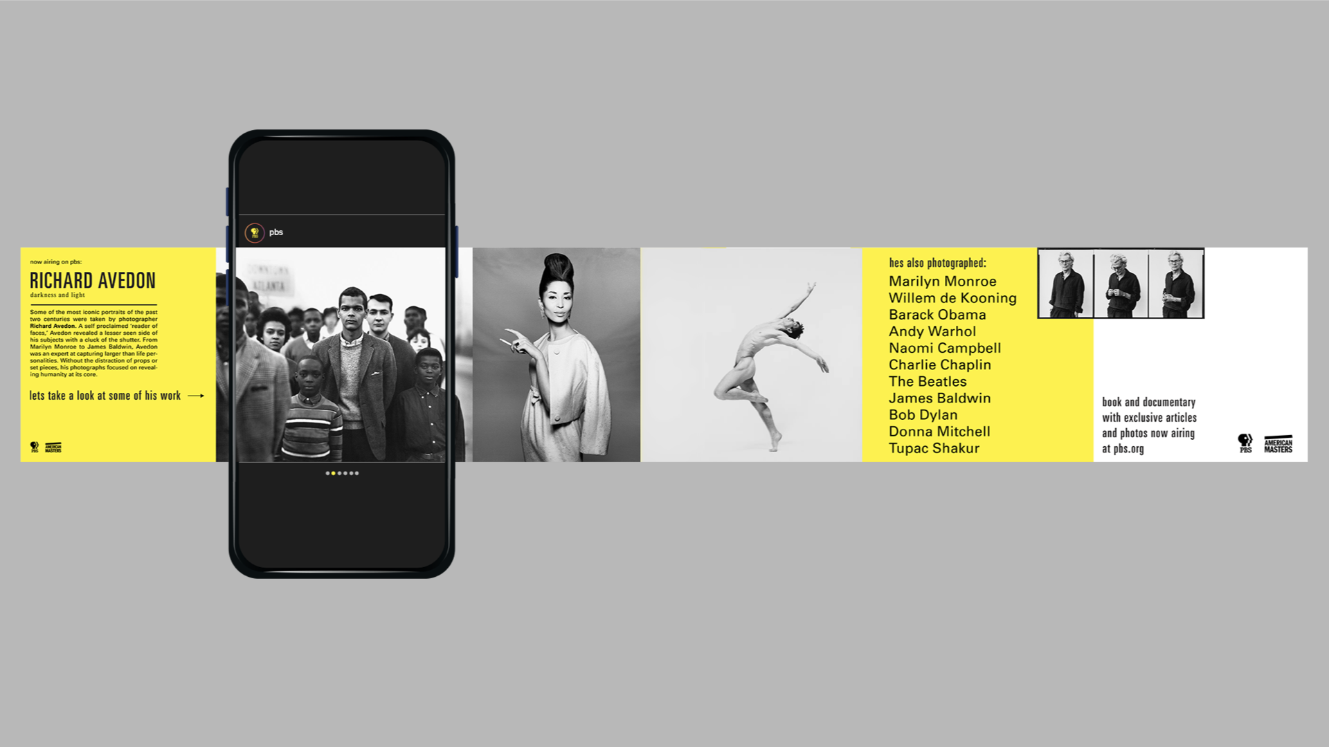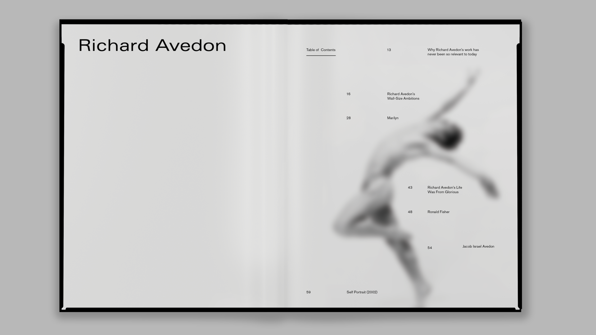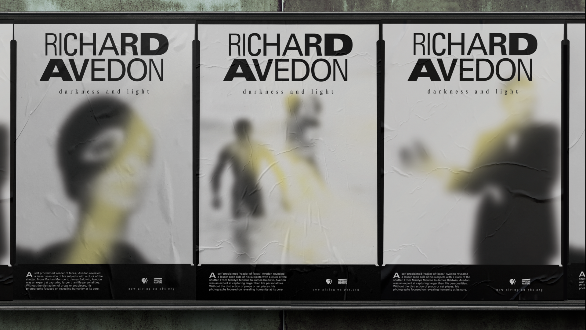 For Richard Avedon's episode of American Masters, the task was to create assets to accompany and support the documentary. A wordmark was created to give Richard Avedon's name a memorable form while also embodying his work and process. A book was made to accompany the content in the documentary in print. In addition, a triptych of posters was made to promote the material out in the real world.