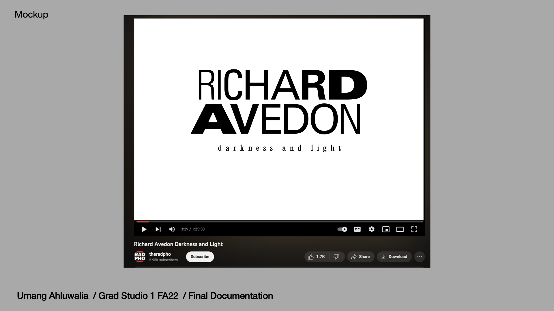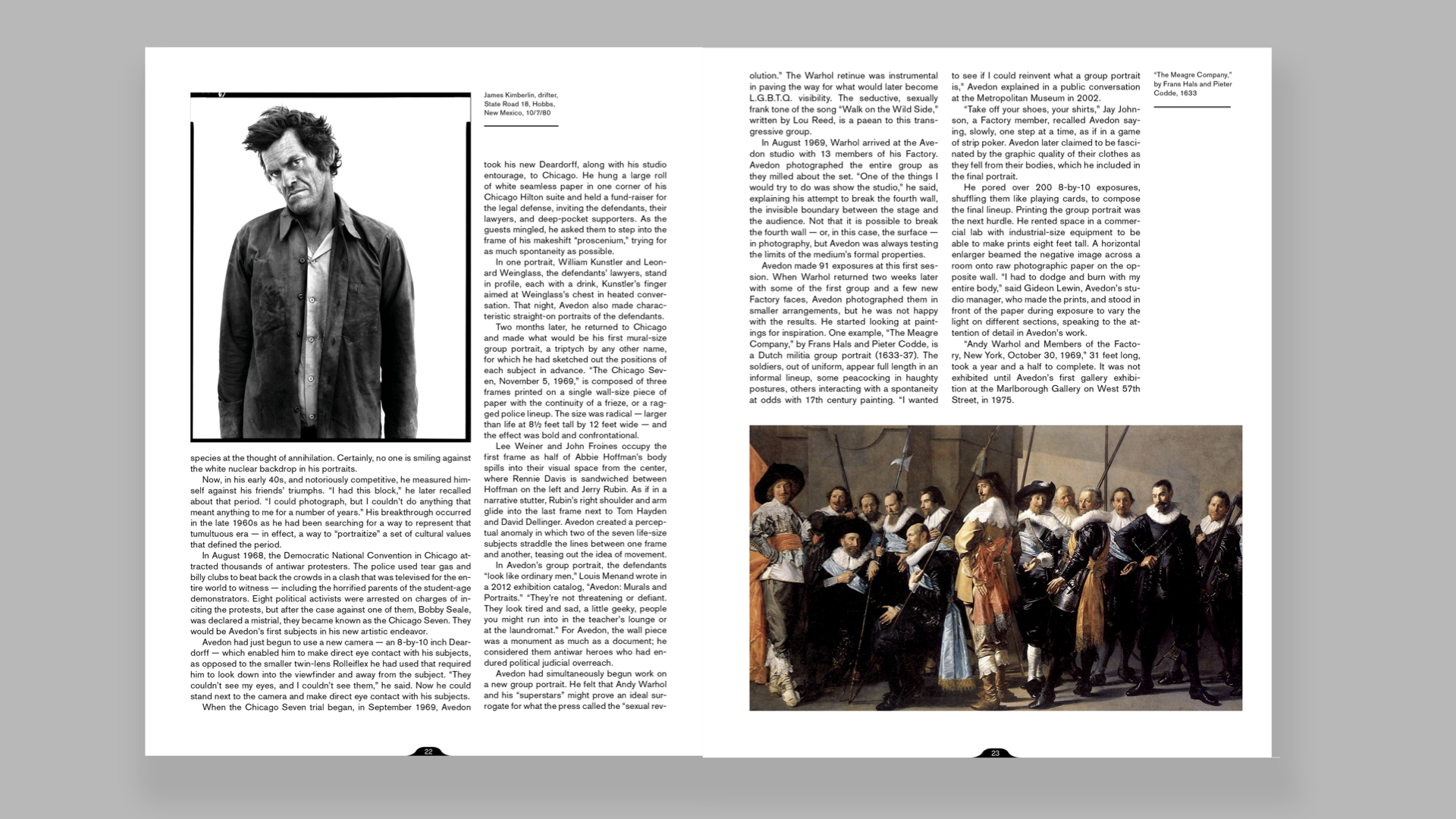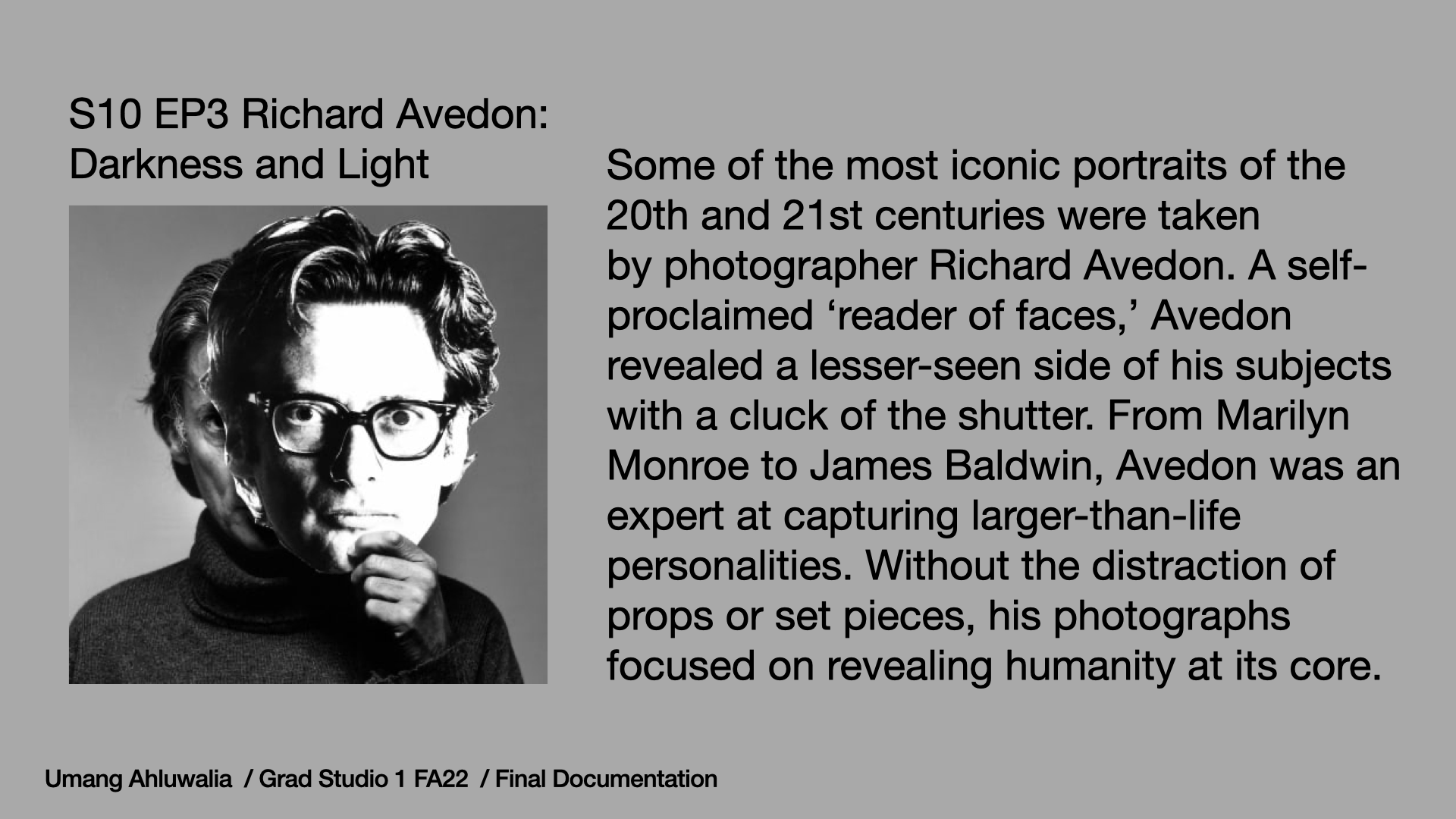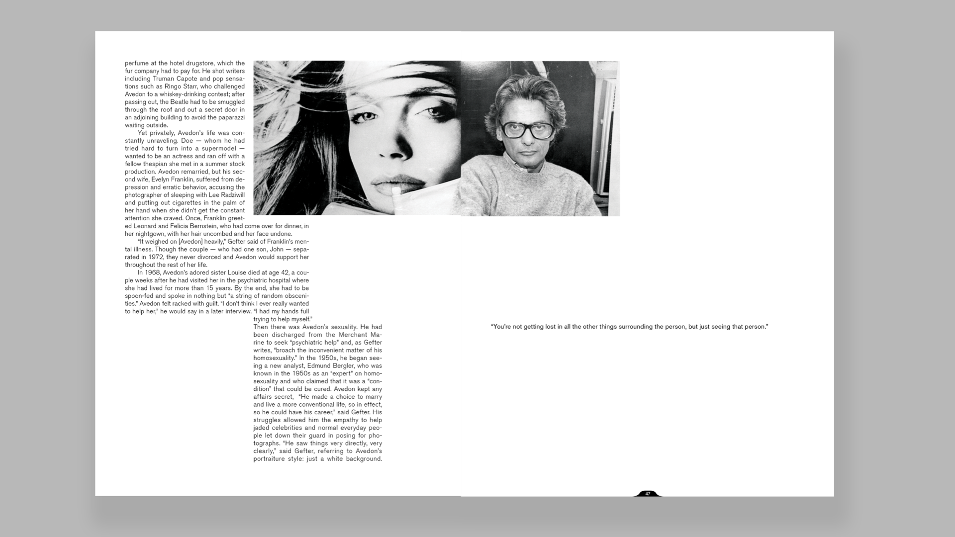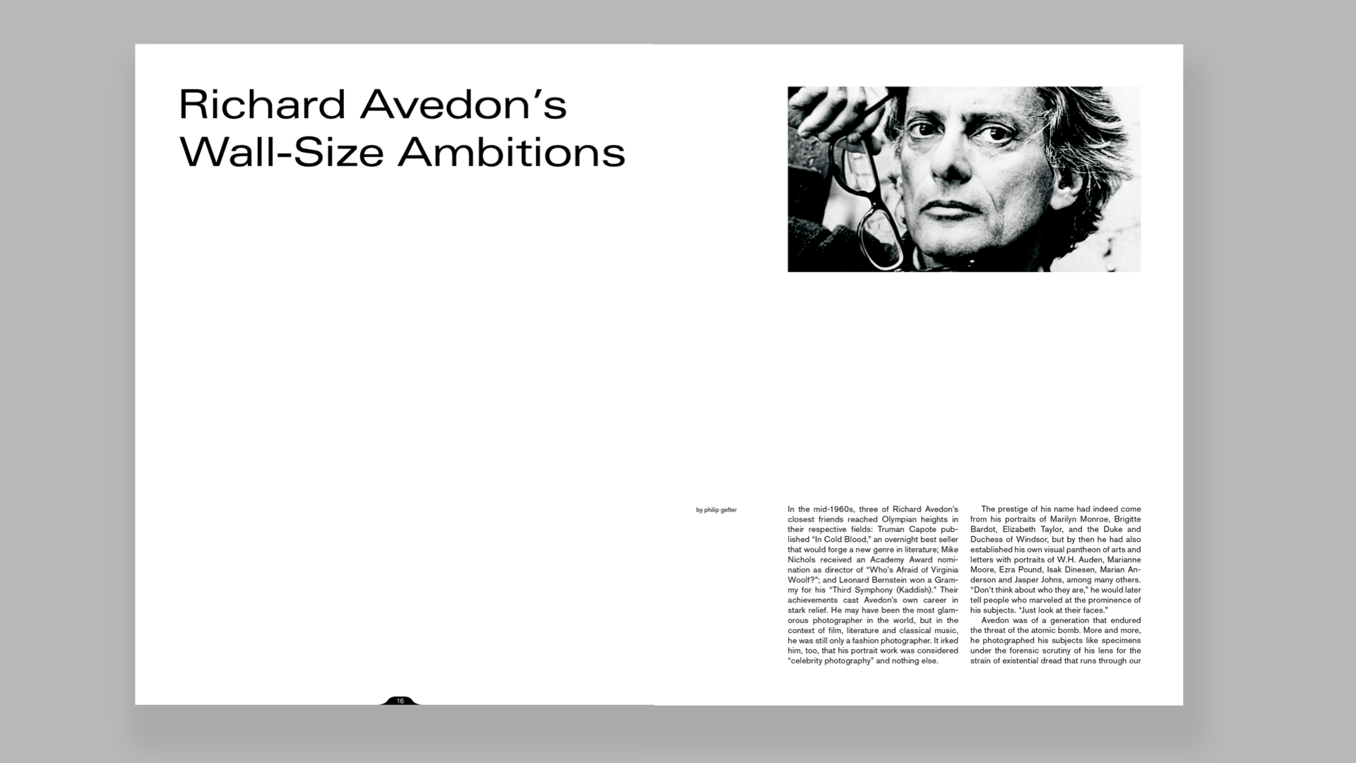 For Richard Avedon's episode of American Masters, the task was to create assets to accompany and support the documentary. A wordmark was created to give Richard Avedon's name a memorable form while also embodying his work and process. A book was made to accompany the content in the documentary in print. In addition, a triptych of posters was made to promote the material out in the real world.