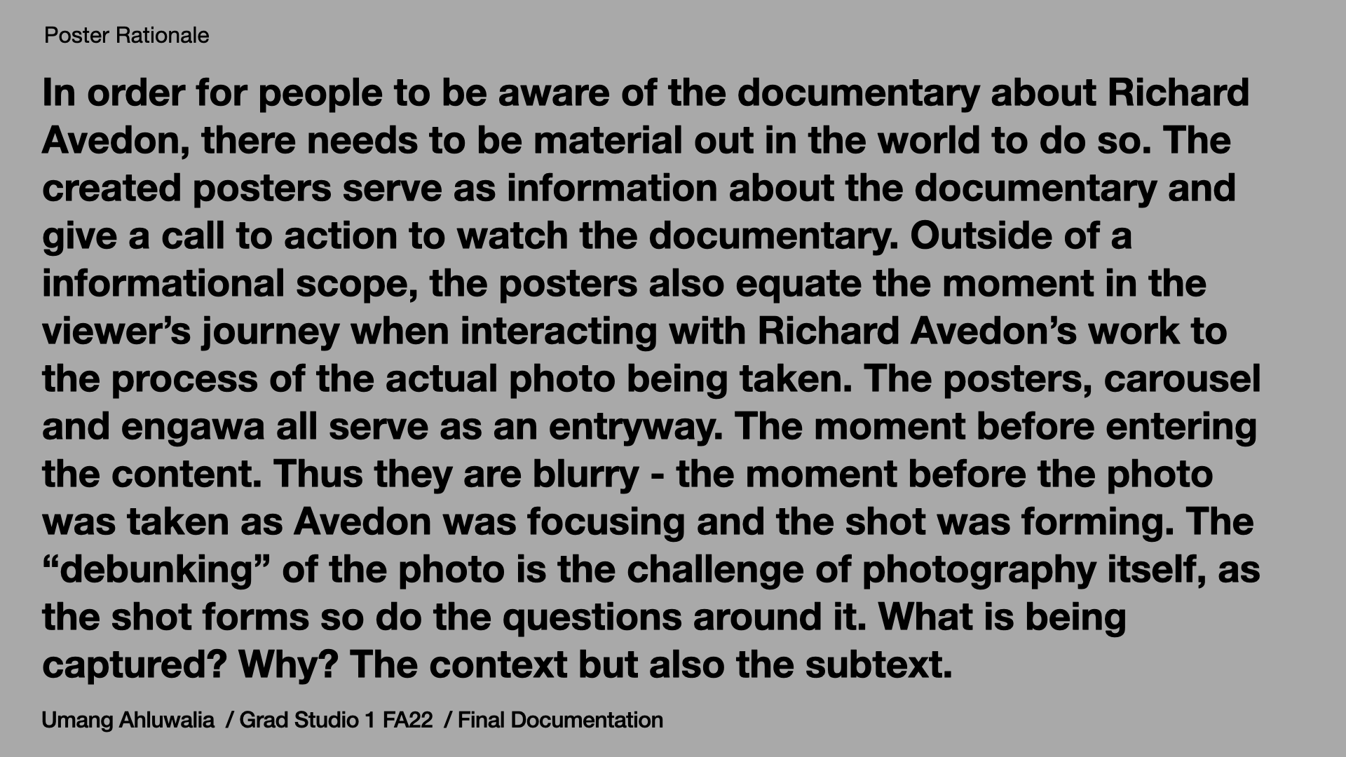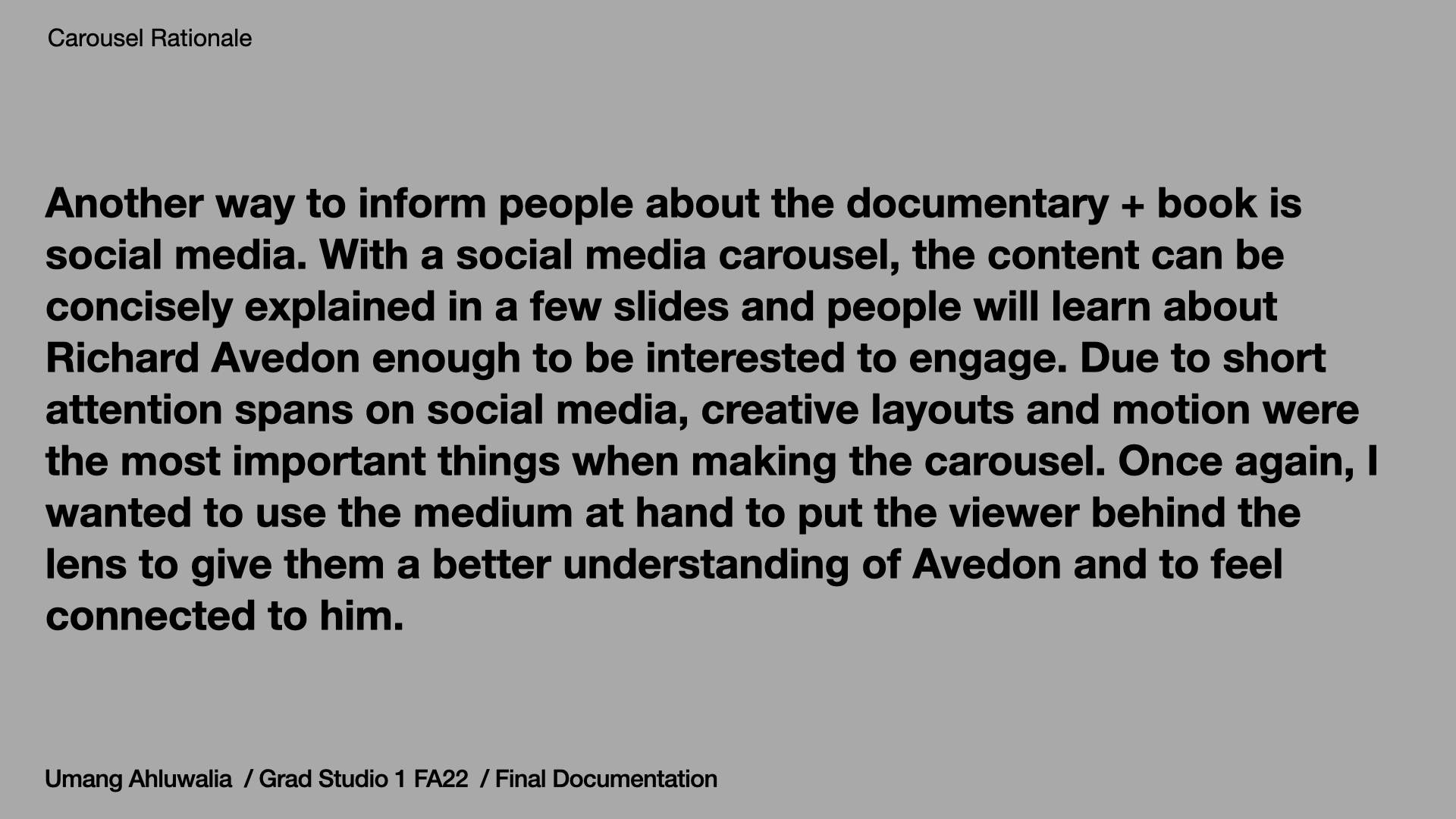With this project I learned about the importance of iteration and visual research. To develop the wordmark, I iterated over multiple rounds that were informed by research to develop the best possible iteration. I also learned about how one piece of material such as a documentary needs/can have supplemental content around it that must be cohesive and live in the same universe.