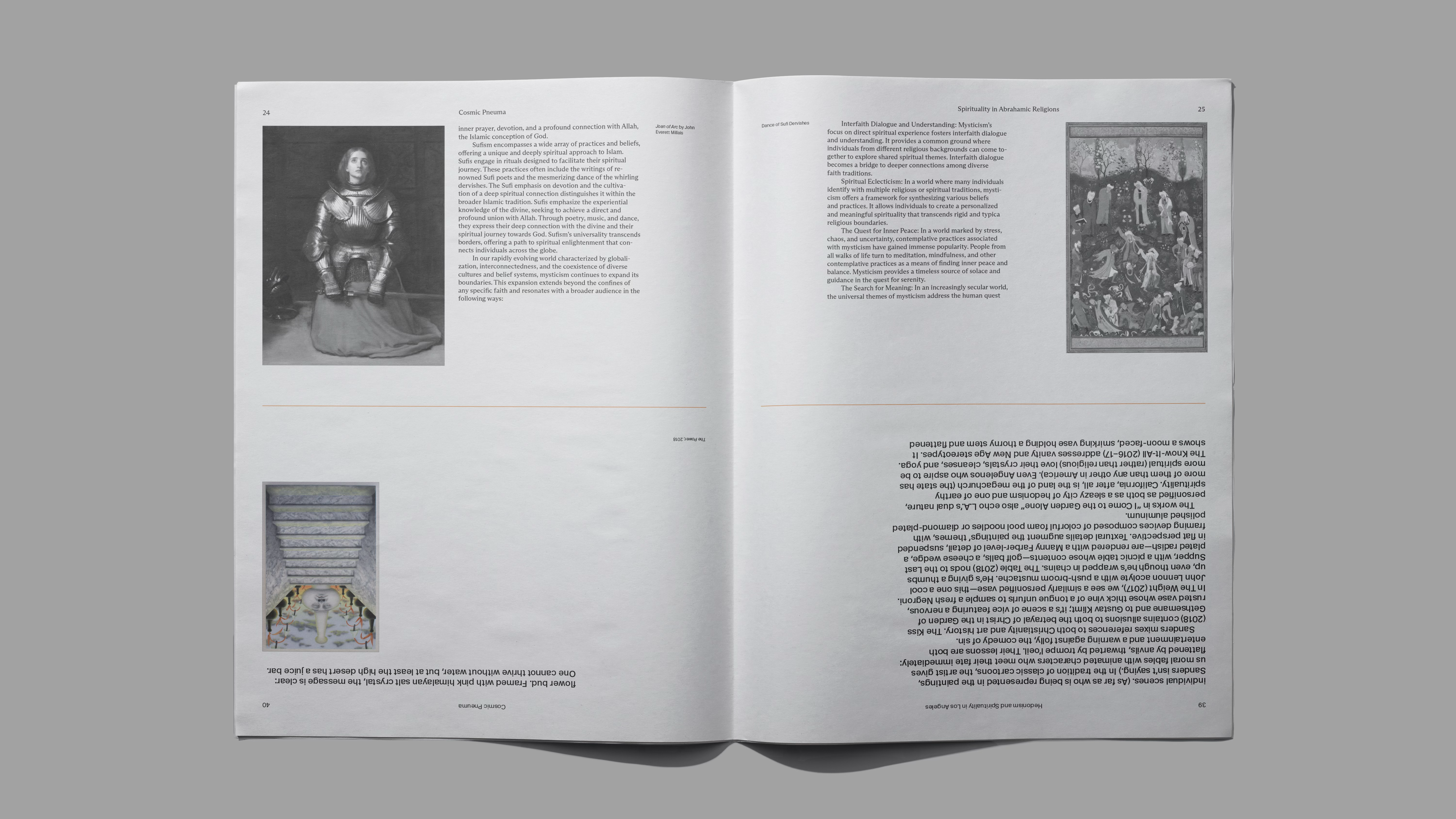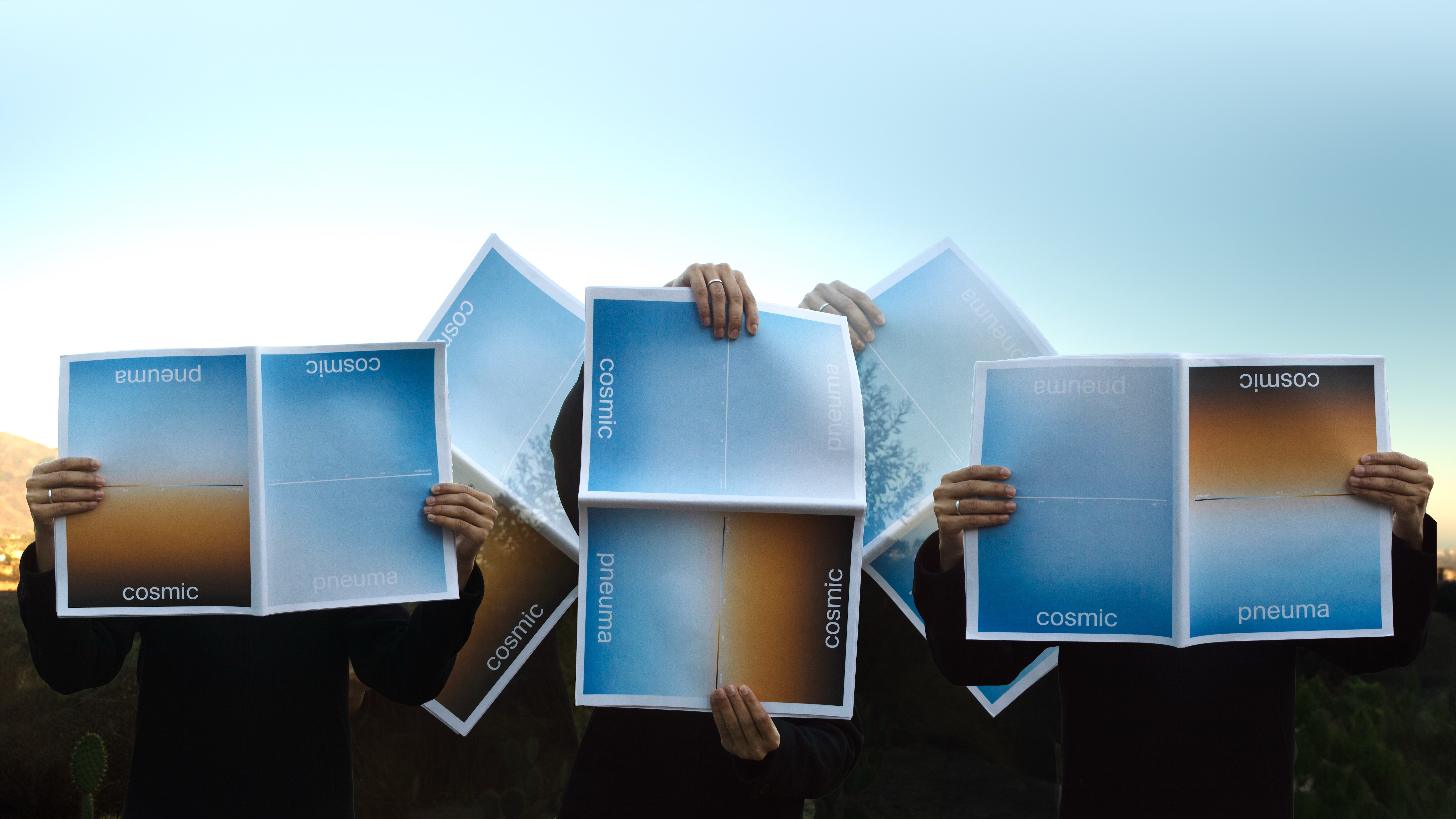 Cosmic Pneuma is an exhibition covering topics relating to Spirituality in Art and Architecture. Meaning “breath of life” in Greek, the word pneuma comes to represent the human instinct of creativity. The goal of this publication and exhibition was to show how creativity and spirituality have been intertwined since the beginning of time.