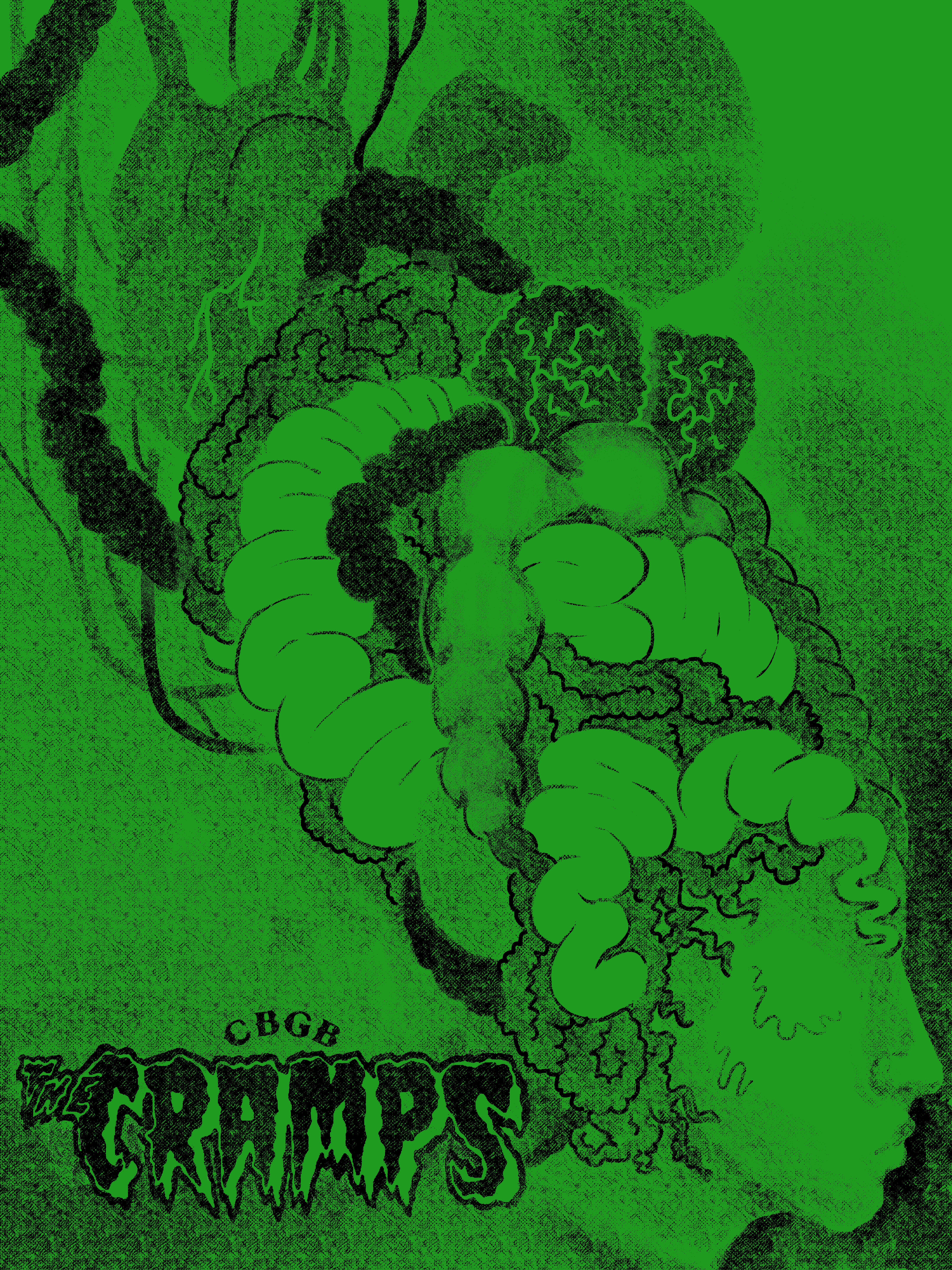 Illustrated concert posters designed for the band the Cramps. For one design I chose to replicate the screen printed look that contemporary punk posters had during the time that the Cramps were in their prime. For the second poster, I chose a more modern look that aligned slightly more with my style.