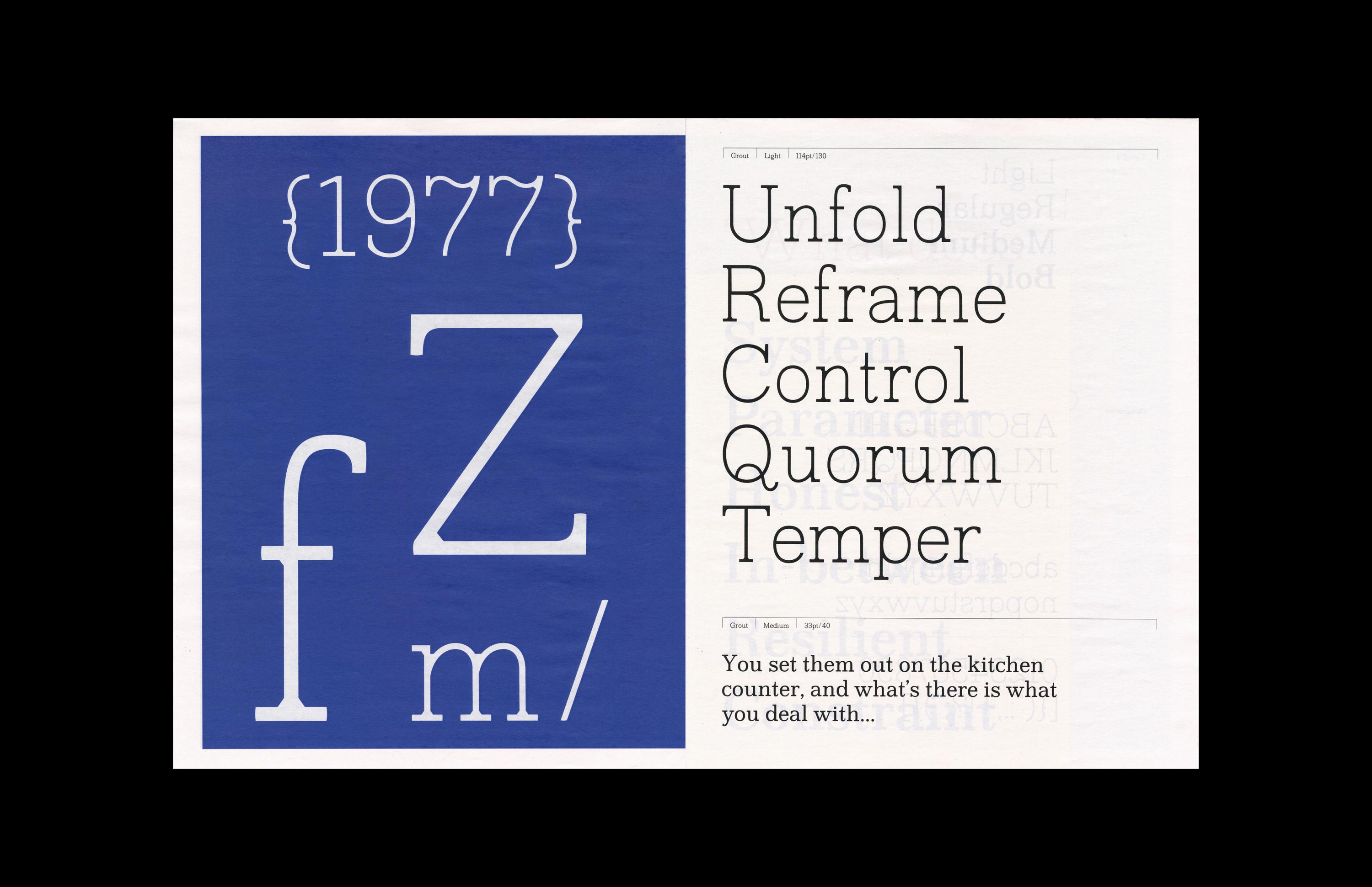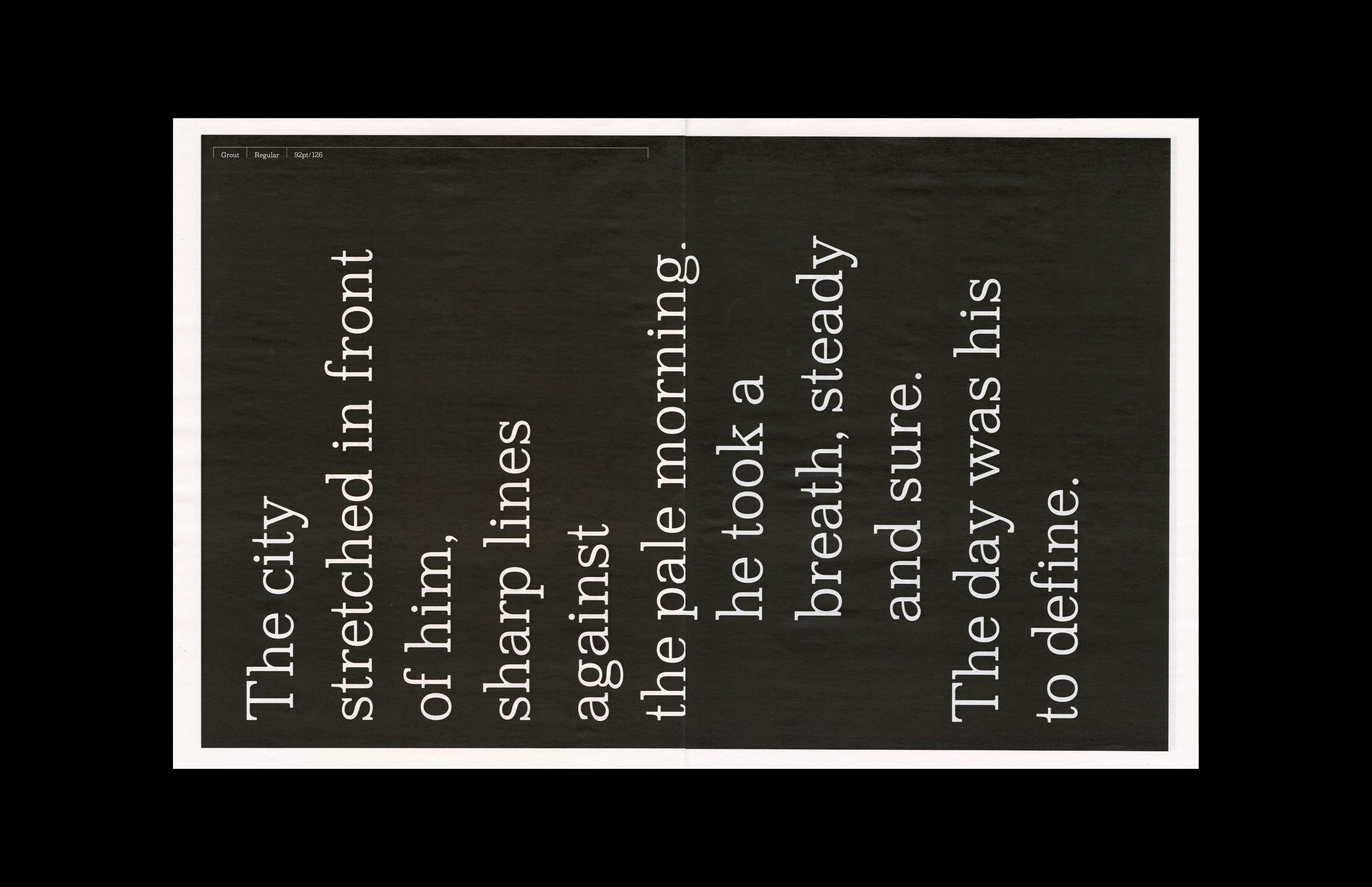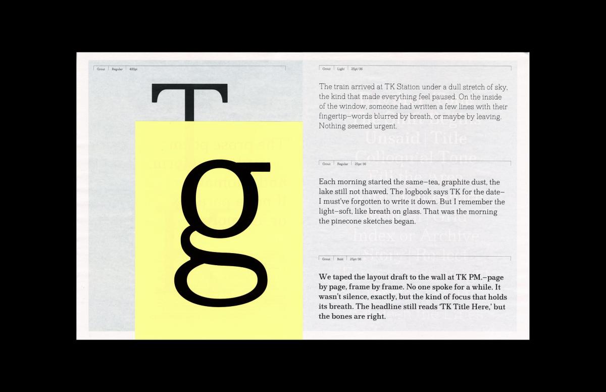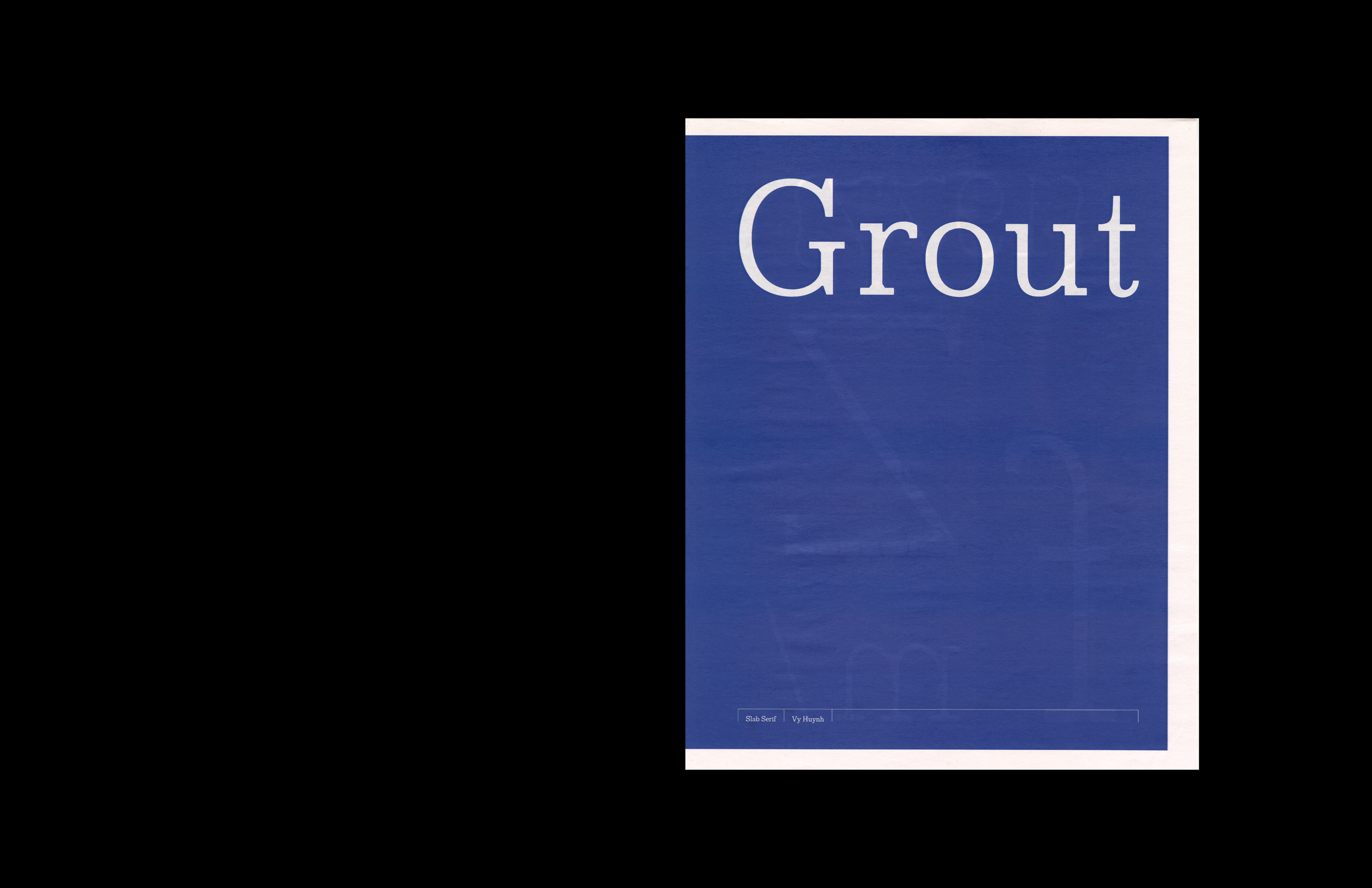 Grout is a contemporary slab serif designed for editorial and identity use, with confident, refined letterforms that provide clarity, strong presence, and easy readability. Inspired by the spaces between tiles and the quiet, essential grout that supports without drawing attention, this idea became the foundation of the typeface.