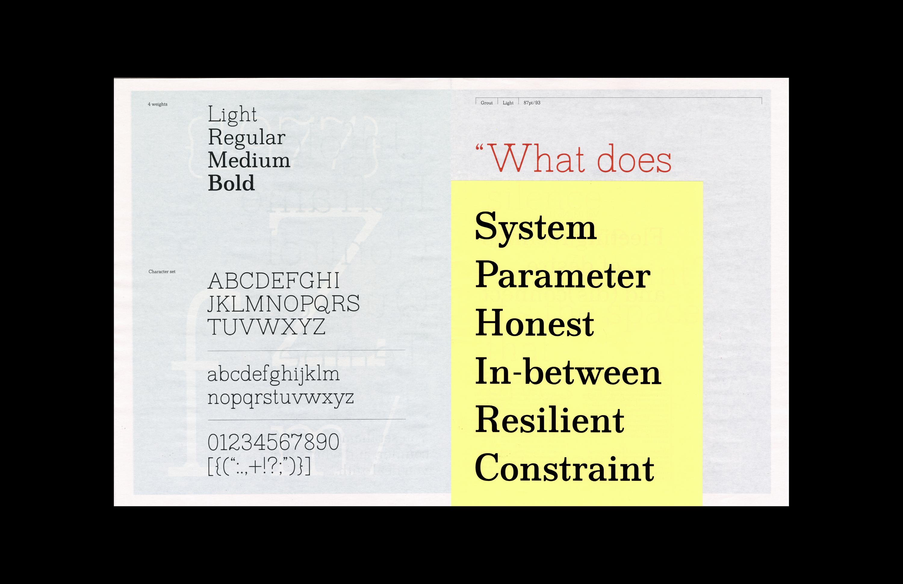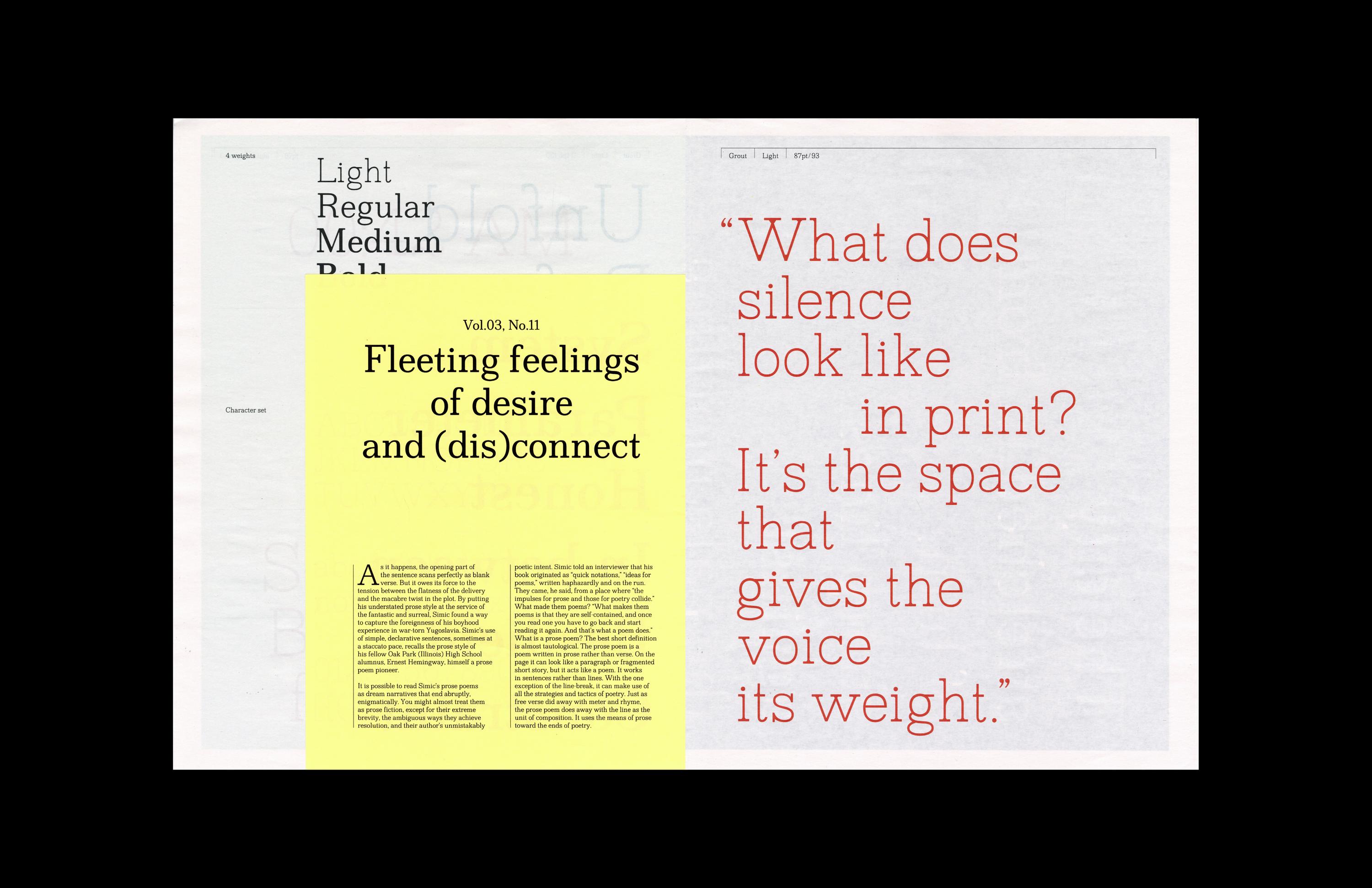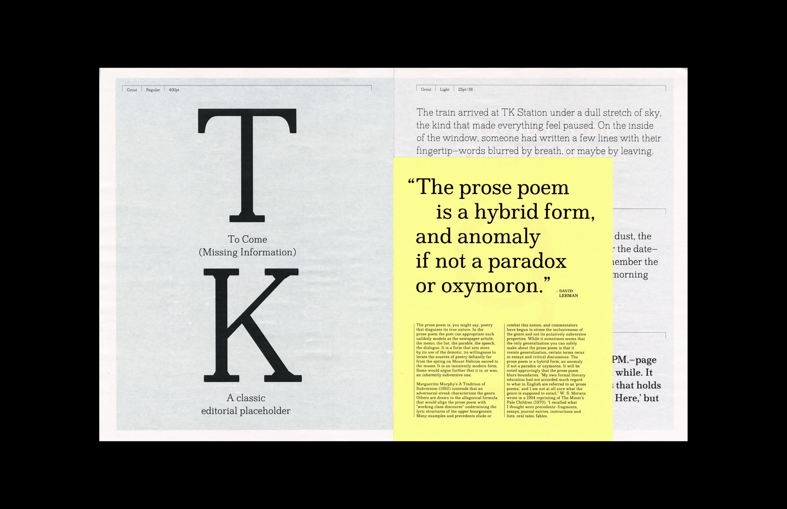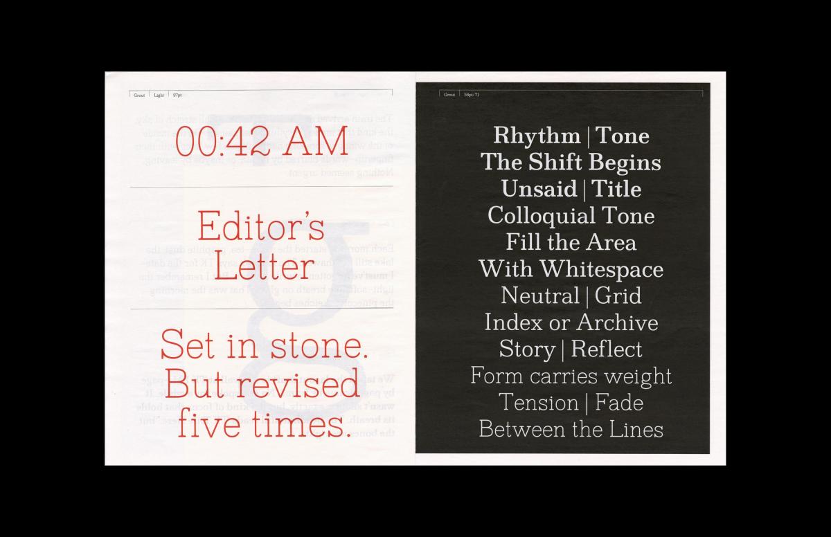 Grout is a contemporary slab serif designed for editorial and identity use, with confident, refined letterforms that provide clarity, strong presence, and easy readability. Inspired by the spaces between tiles and the quiet, essential grout that supports without drawing attention, this idea became the foundation of the typeface.