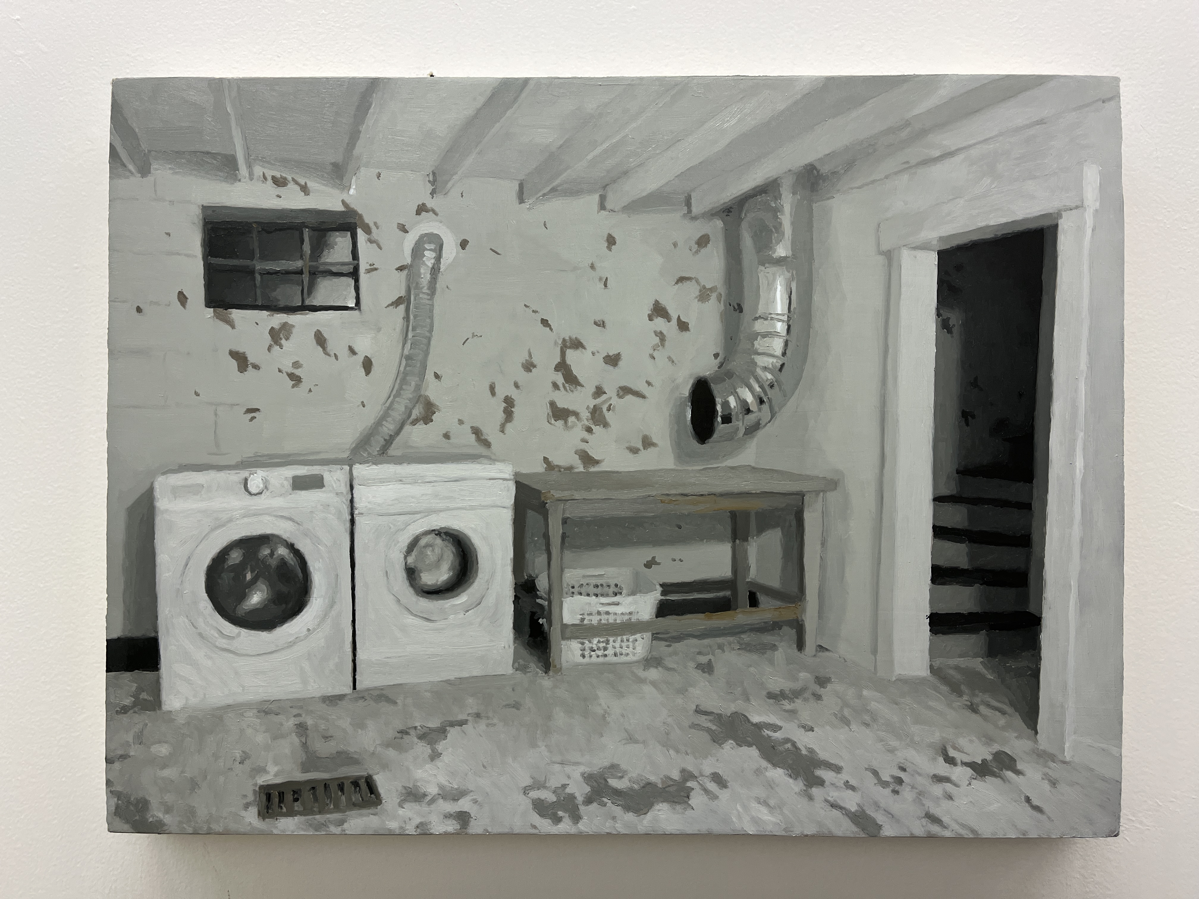 18" x 24" oil on canvas over panel A laundry room with chipped paint and a laundry chute. I interviewed my brother about a room that he had strong memories of. He talked about the laundry room in the basement of our old apartment in Chicago. Based on what he described, I used a 3d modeling software to remake the room.