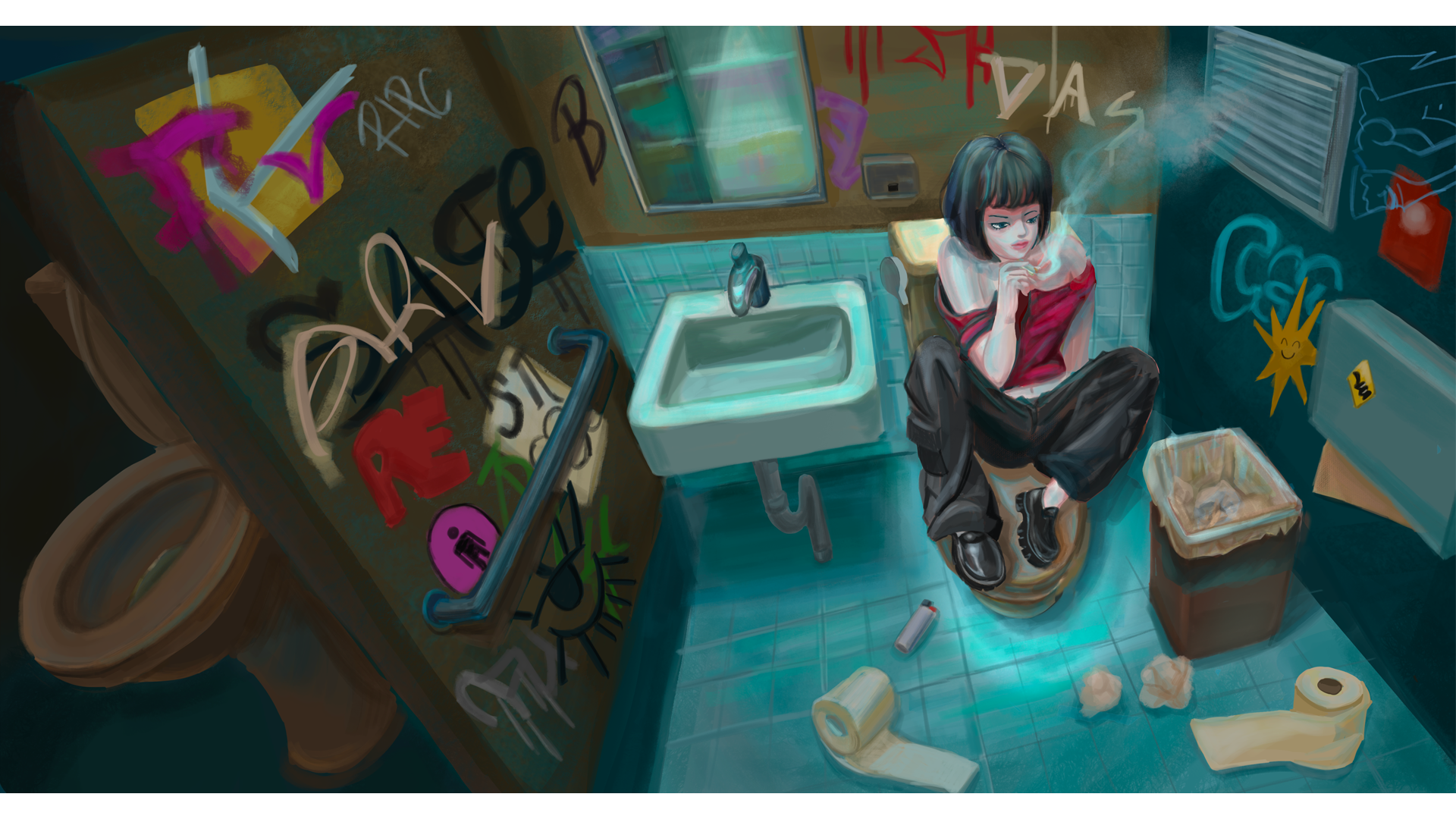 Background painting of two different lightiing on toilet as sanctuary.