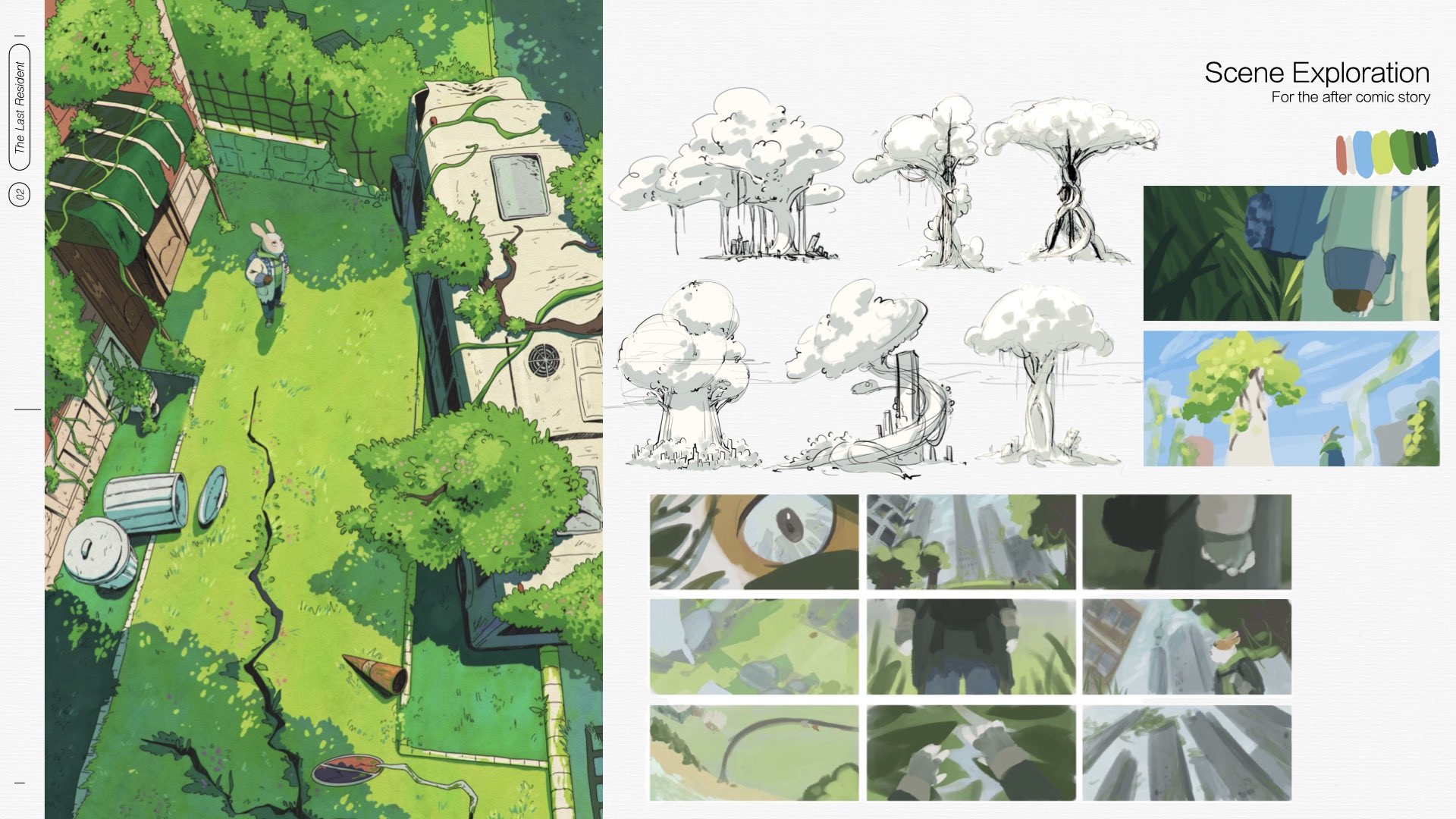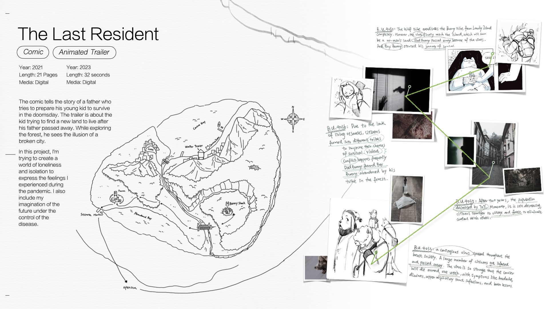 It's an animated trailer for comics that I drew previously. The trailer is about the kid trying to find a new land to live after his father passed away. While exploring the forest, he sees the illusion of a broken city. In this project, I'm trying to create a world of loneliness and isolation to express the feelings I experienced during the pandemic. I also include my imagination of the future under the control of the disease from the comic.