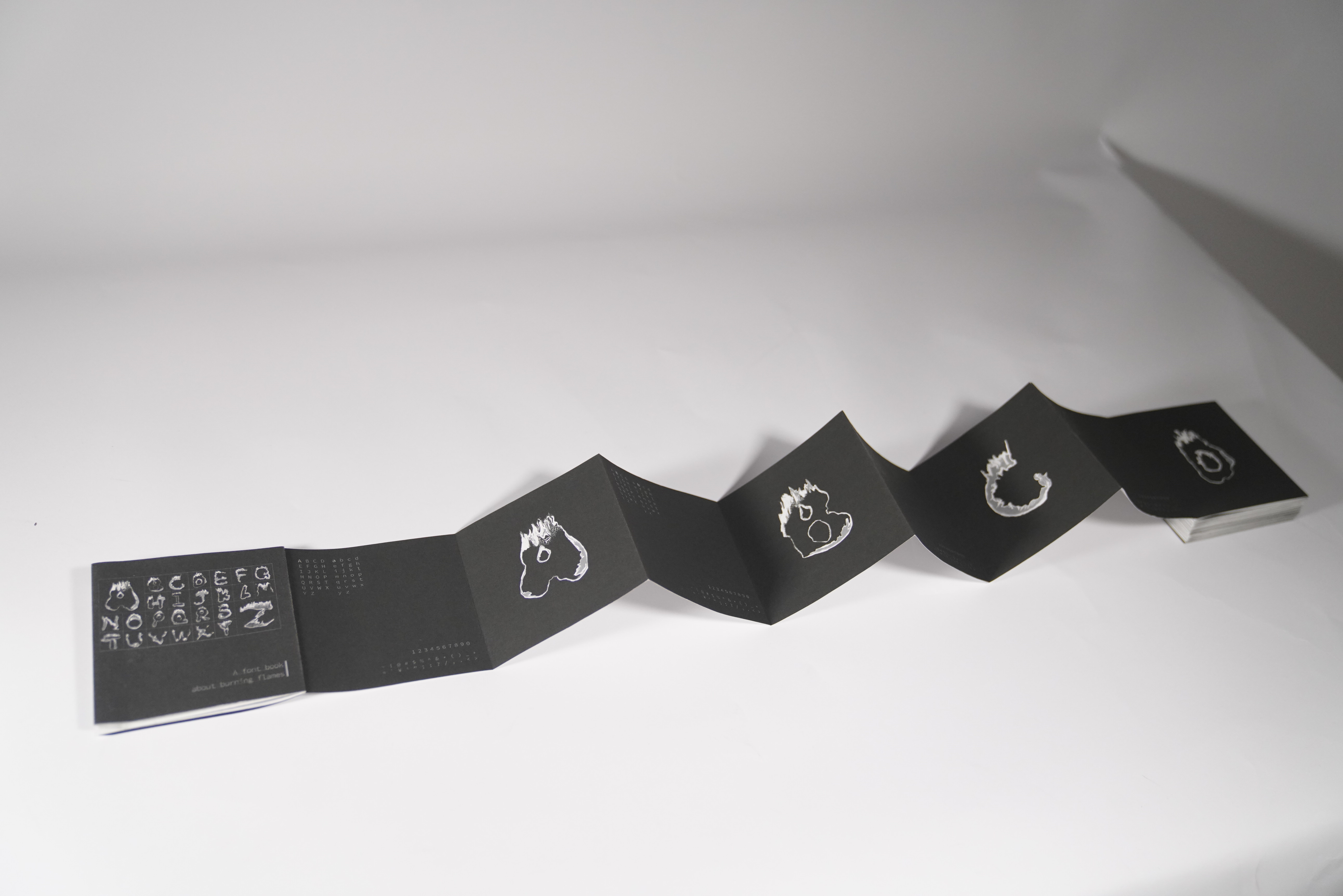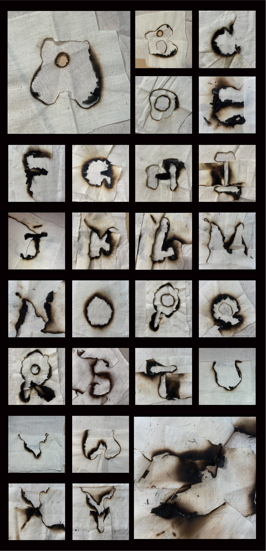 I tried to burn on the cloth, trying to restore the feeling that the forest fire had engulfed the forest, so I left many burn marks on the cloth. Then, using the traces obtained from the combustion, 26 English letters were spliced as the experimental output. And use the computer to carry out the creative design process again, and get the letters in the form of flames.